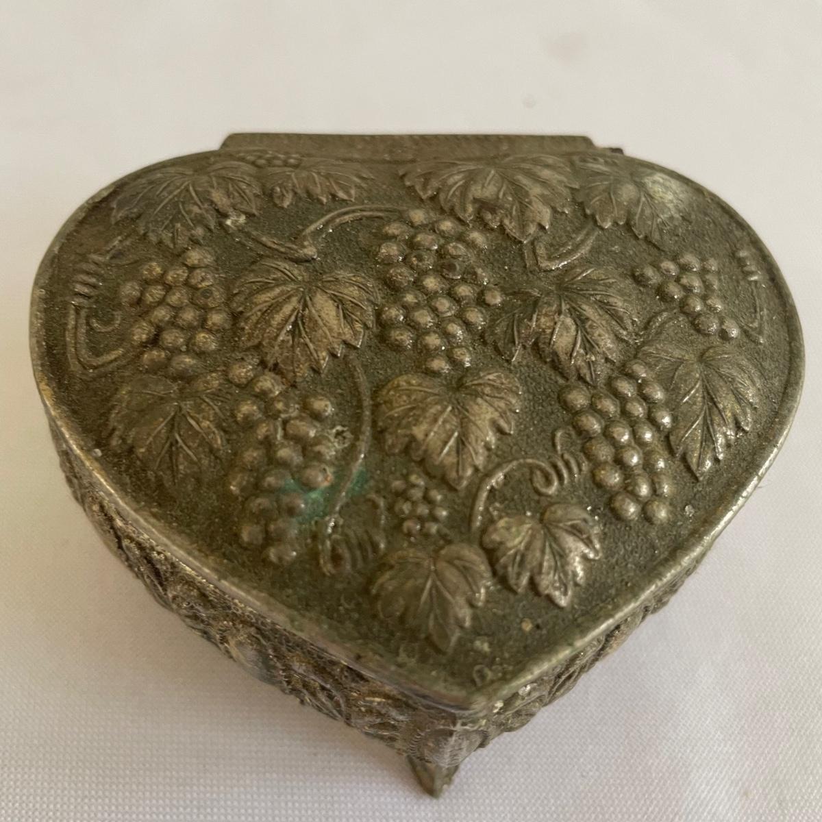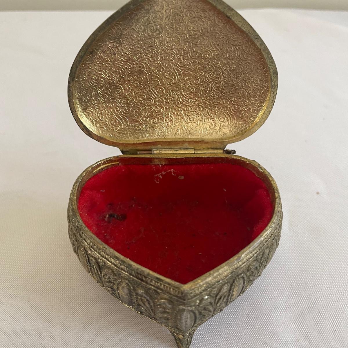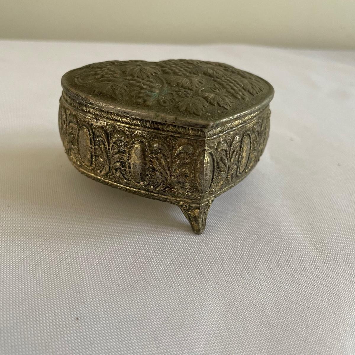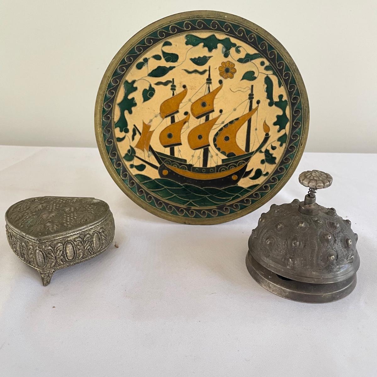 This vintage brass desk bell works and measures 3” d x 3” tall. The brass plate has a unique painted inlay of a boat. The heart shaped trinket box is not brass, appears to be a brass colored tin metal.
