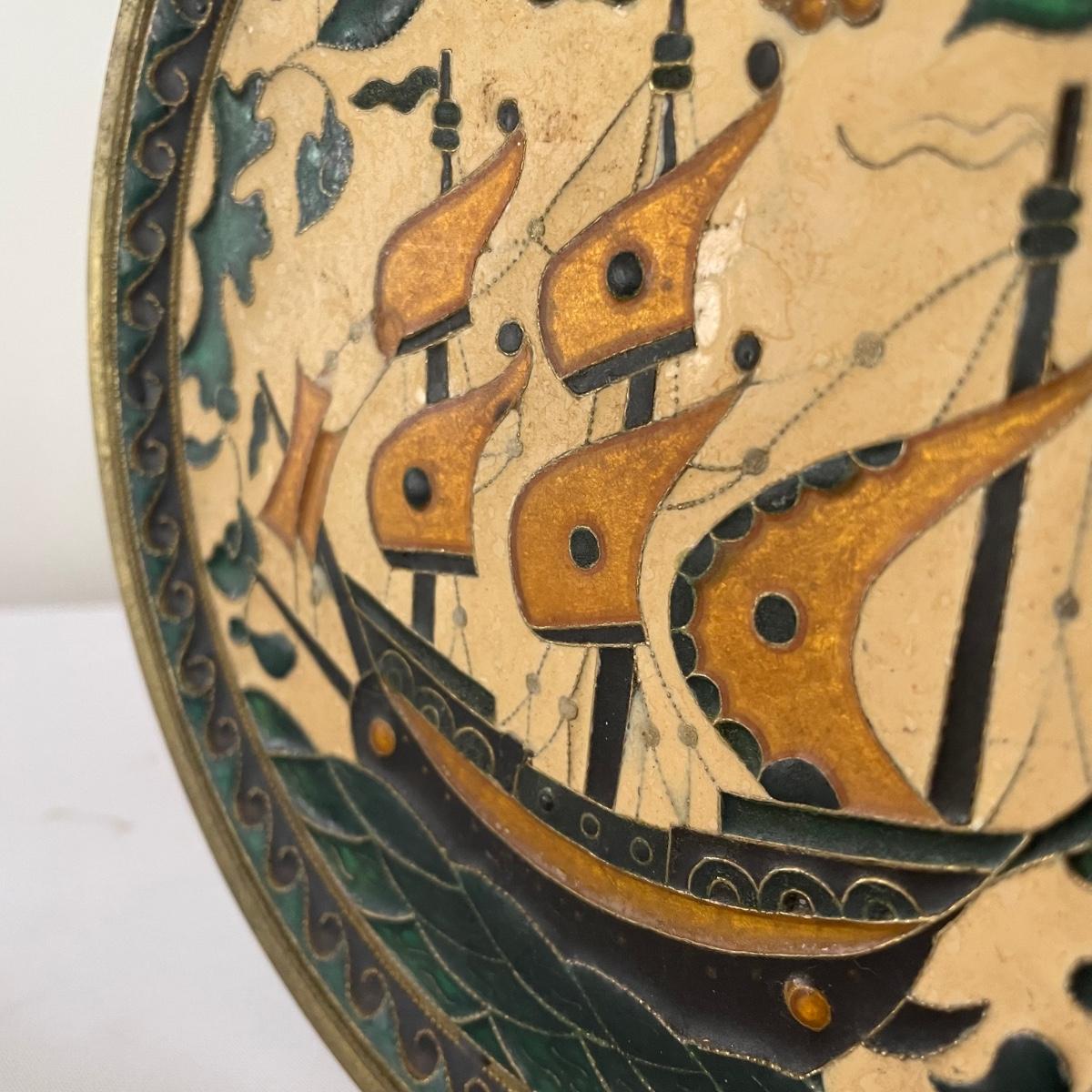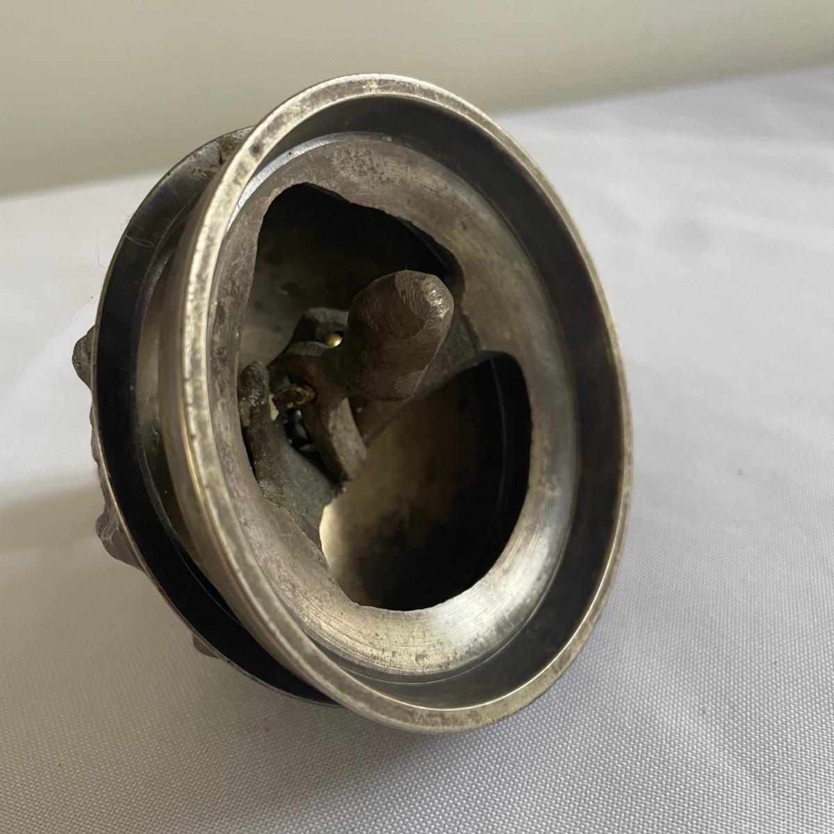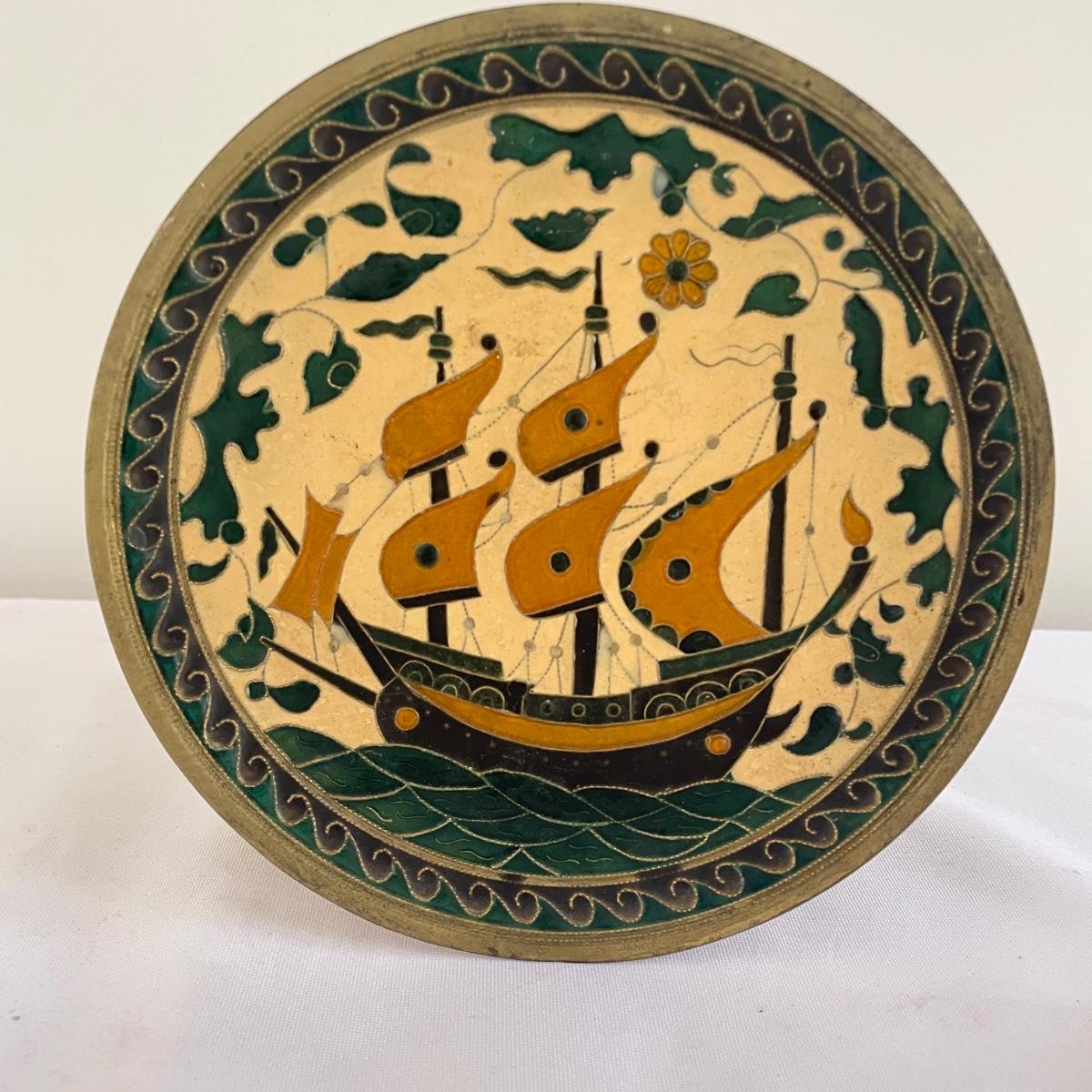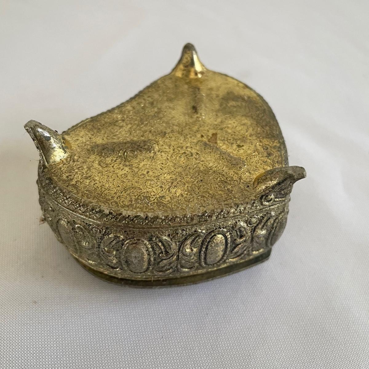 This vintage brass desk bell works and measures 3” d x 3” tall. The brass plate has a unique painted inlay of a boat. The heart shaped trinket box is not brass, appears to be a brass colored tin metal.
