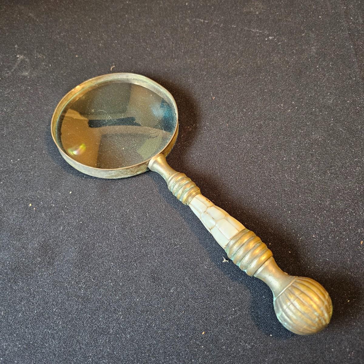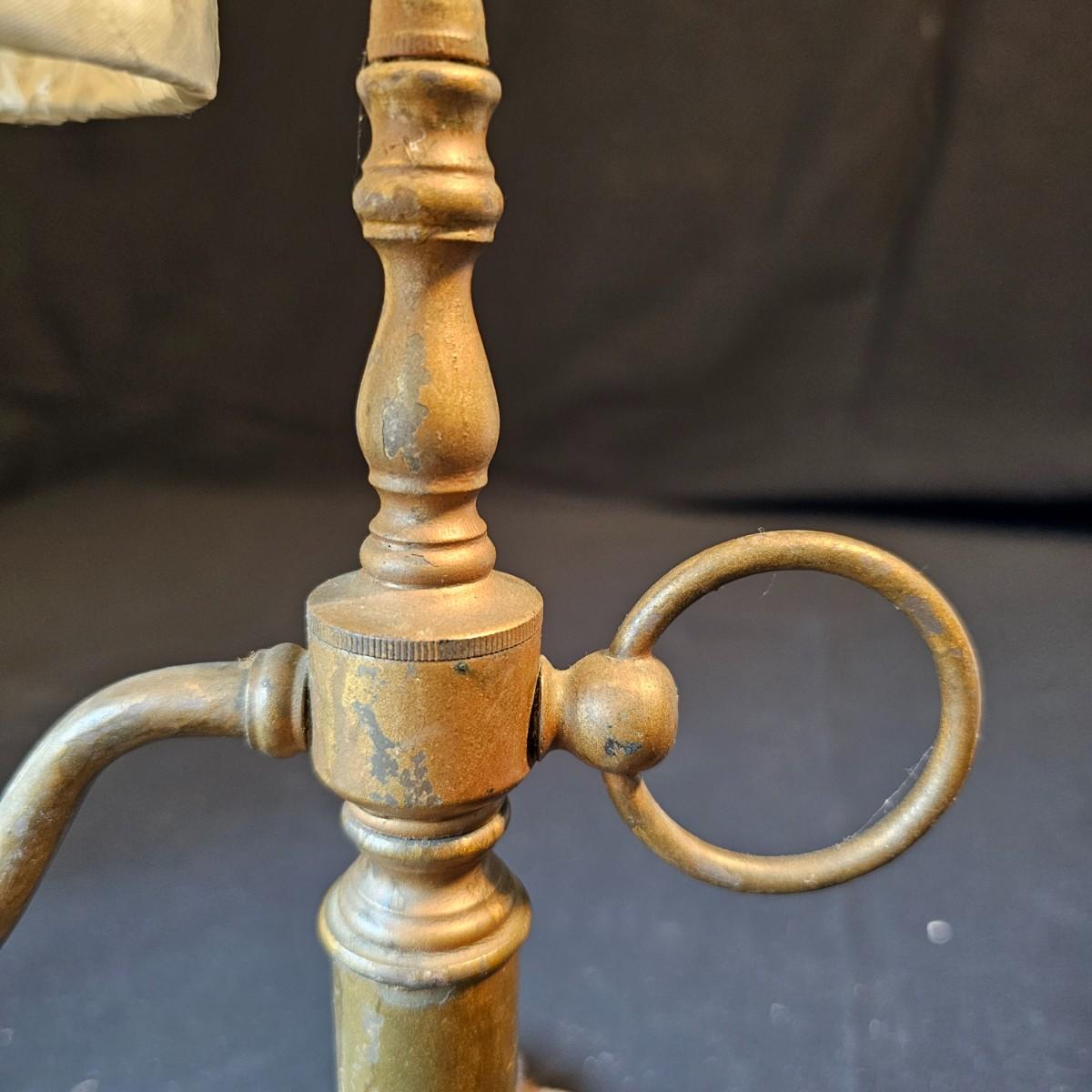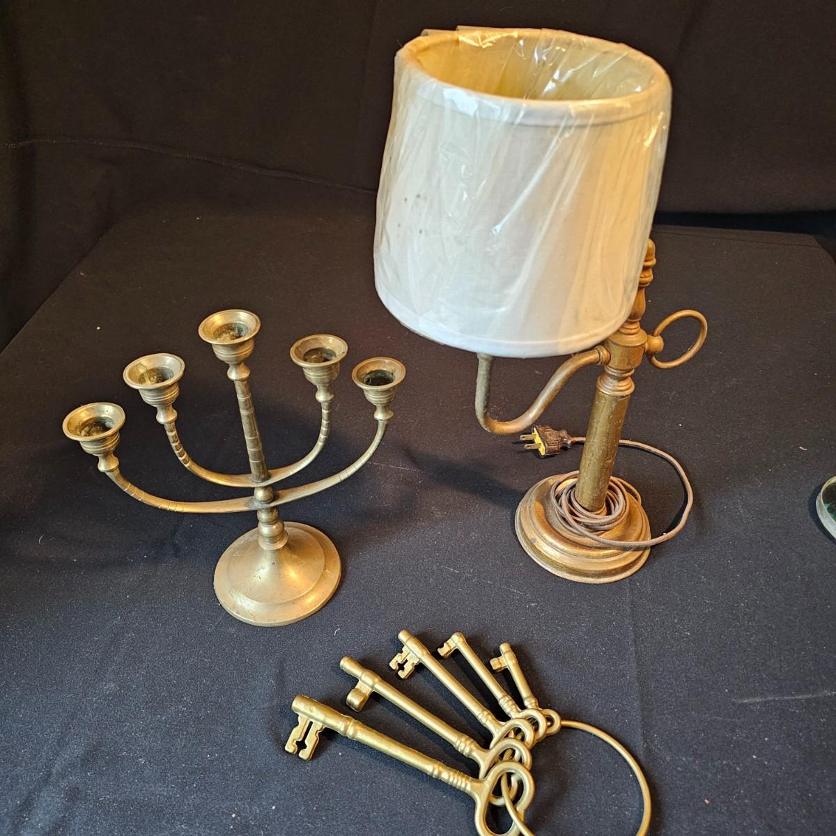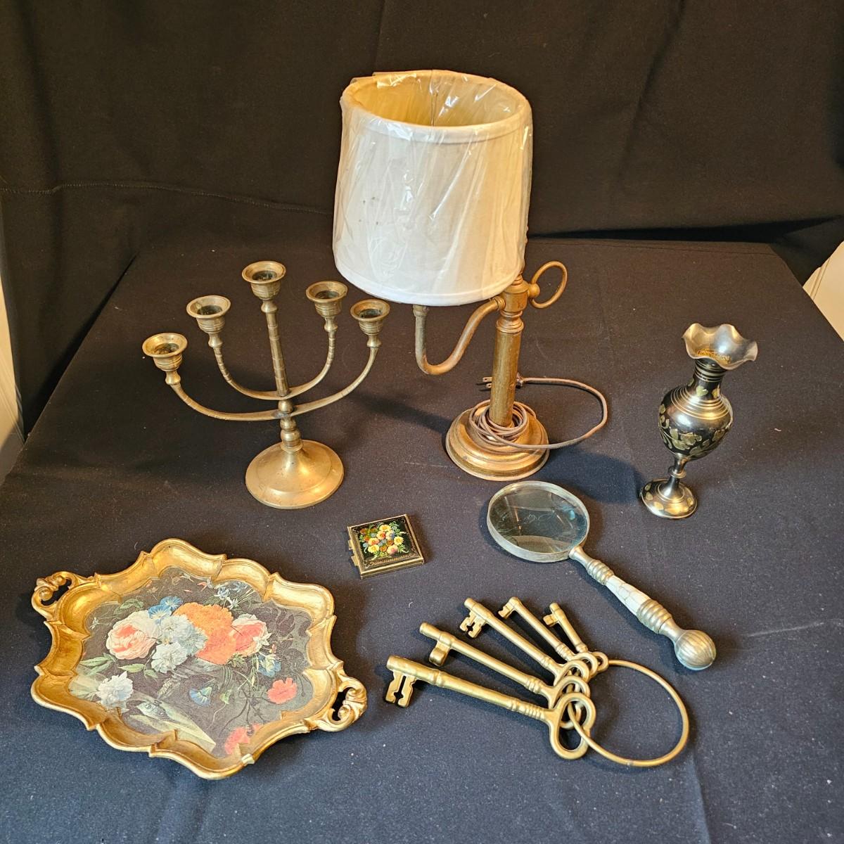 Vintage curved arm desk lamp with new shade. Lamp measures 10" x 6" x 6"H, powered on when plugged in. Five arm candelabra, 9" x 4" x 10"H. Small vase, compact with double mirrors. Ring with set of five skeleton type keys. Desktop magnifying glass with brass/mother of pearl handle, 4" x 10". Glass is slightly cracked. Small tray is only non brass item, is plastic. See photos for details. Shipping available.