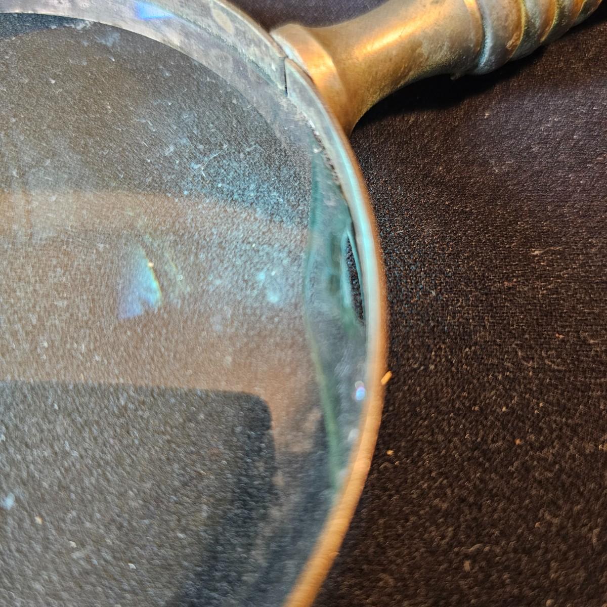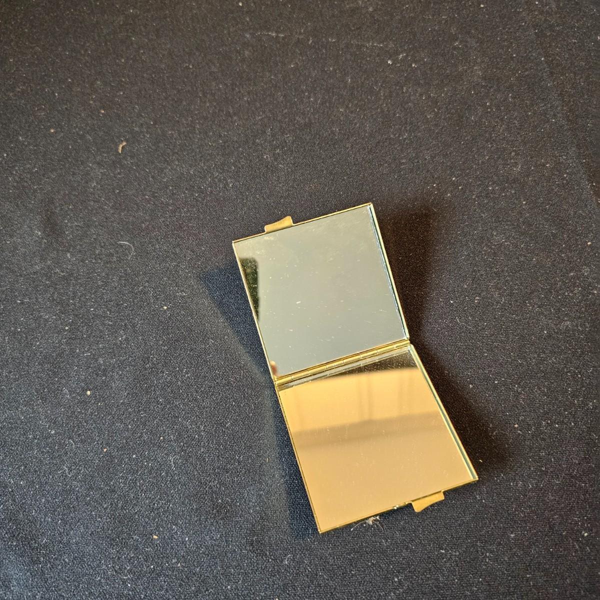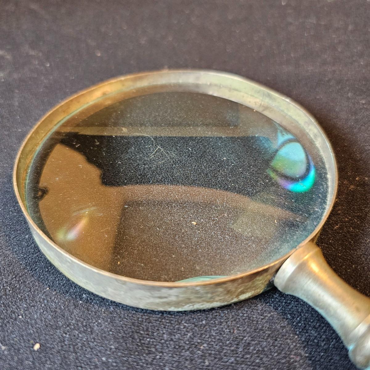 Vintage curved arm desk lamp with new shade. Lamp measures 10" x 6" x 6"H, powered on when plugged in. Five arm candelabra, 9" x 4" x 10"H. Small vase, compact with double mirrors. Ring with set of five skeleton type keys. Desktop magnifying glass with brass/mother of pearl handle, 4" x 10". Glass is slightly cracked. Small tray is only non brass item, is plastic. See photos for details. Shipping available.