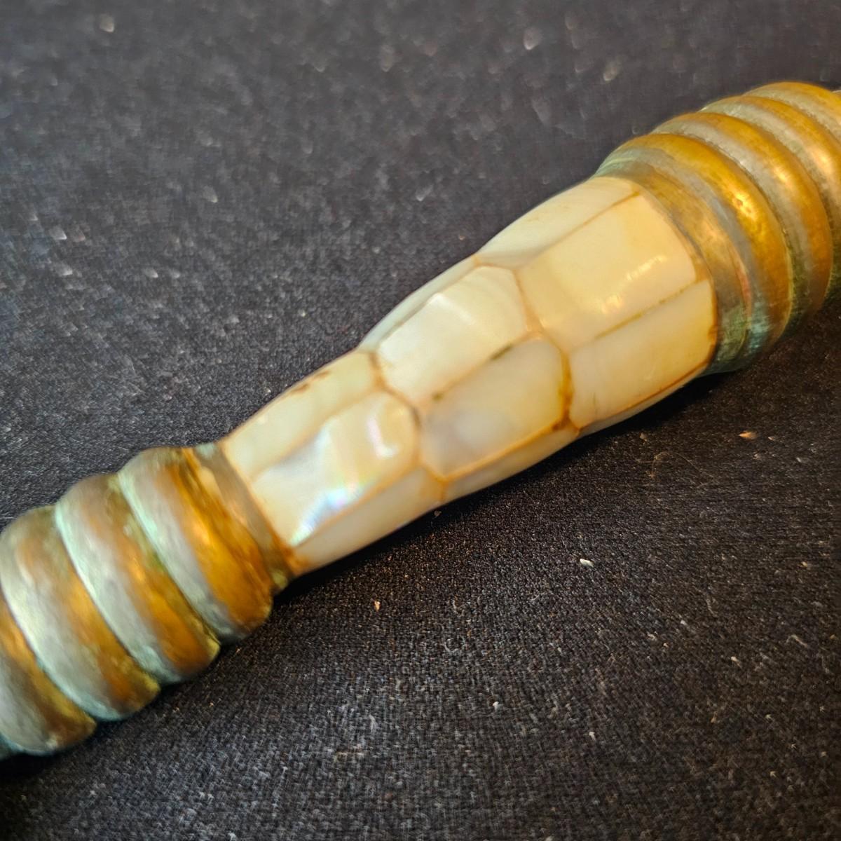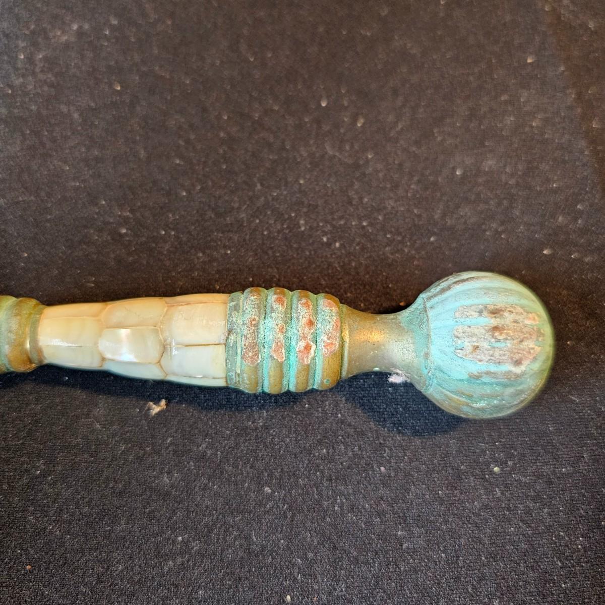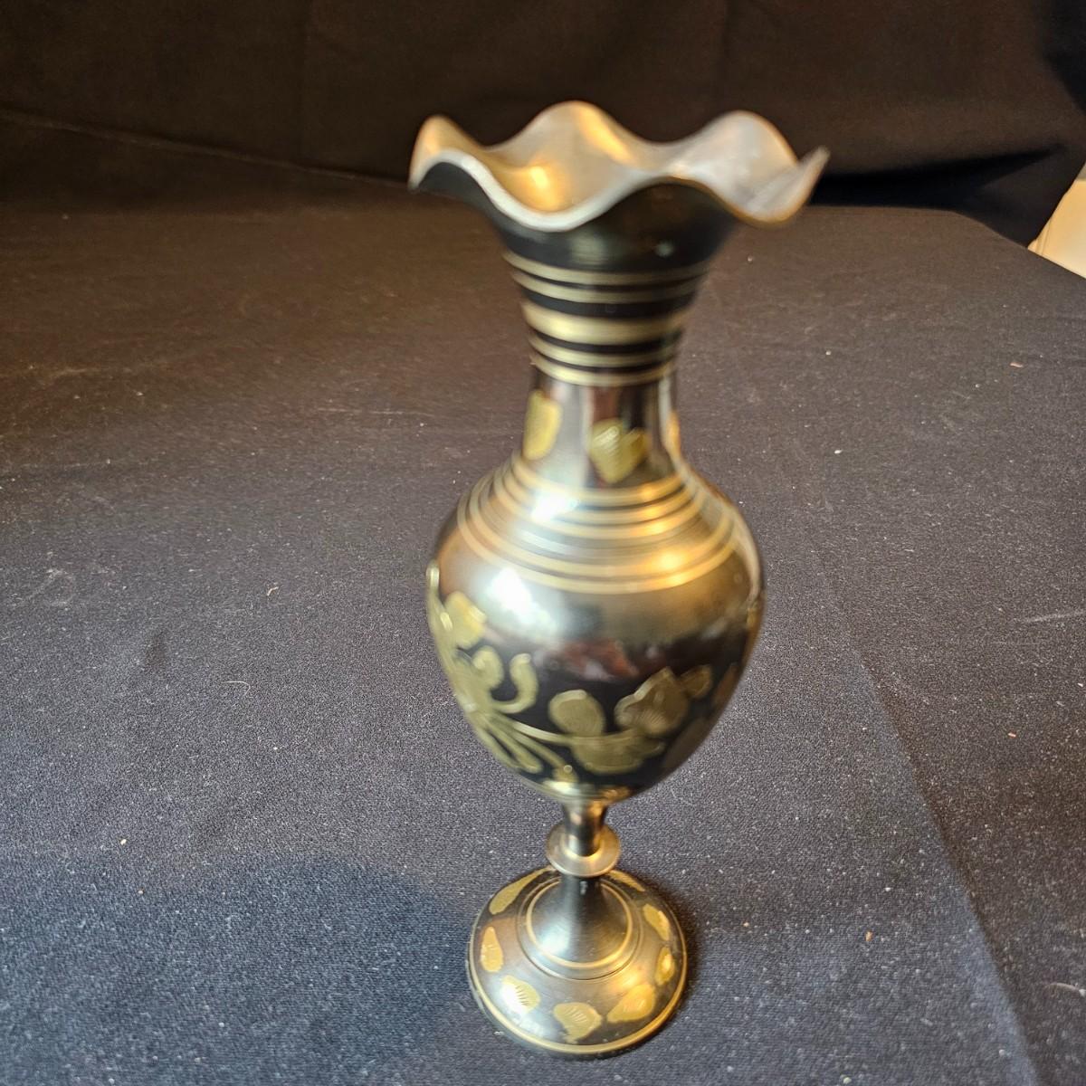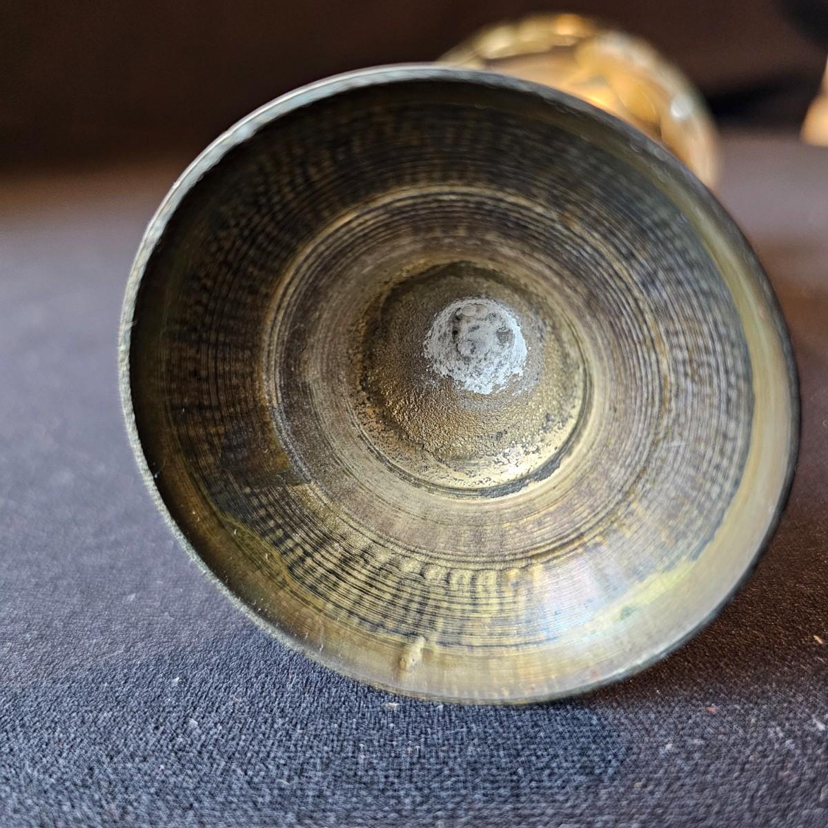 Vintage curved arm desk lamp with new shade. Lamp measures 10" x 6" x 6"H, powered on when plugged in. Five arm candelabra, 9" x 4" x 10"H. Small vase, compact with double mirrors. Ring with set of five skeleton type keys. Desktop magnifying glass with brass/mother of pearl handle, 4" x 10". Glass is slightly cracked. Small tray is only non brass item, is plastic. See photos for details. Shipping available.