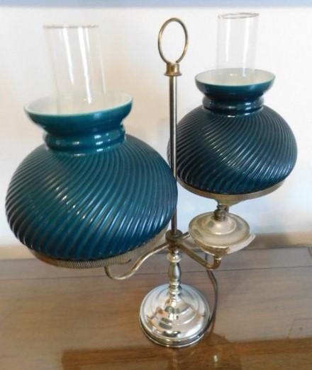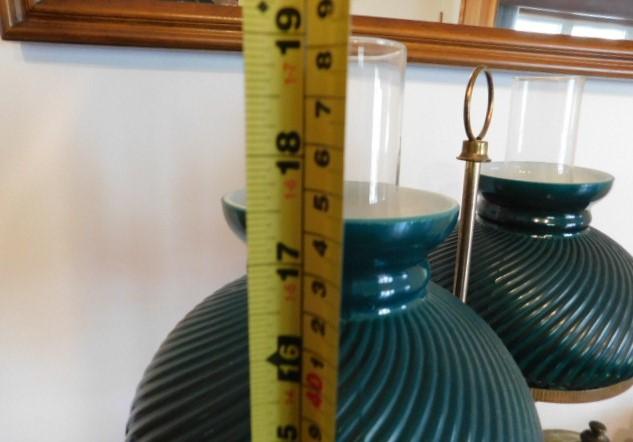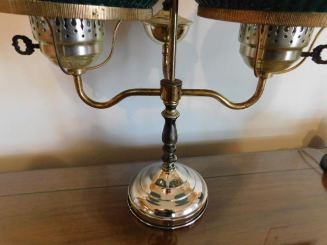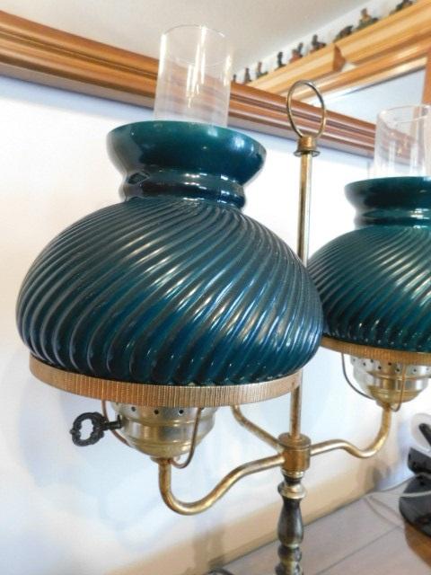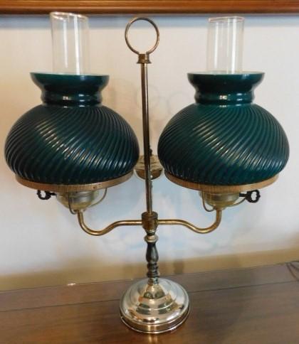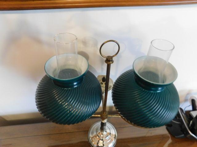 Brass Double Arm Table Lamp with Green Curved Flute Shades 19"