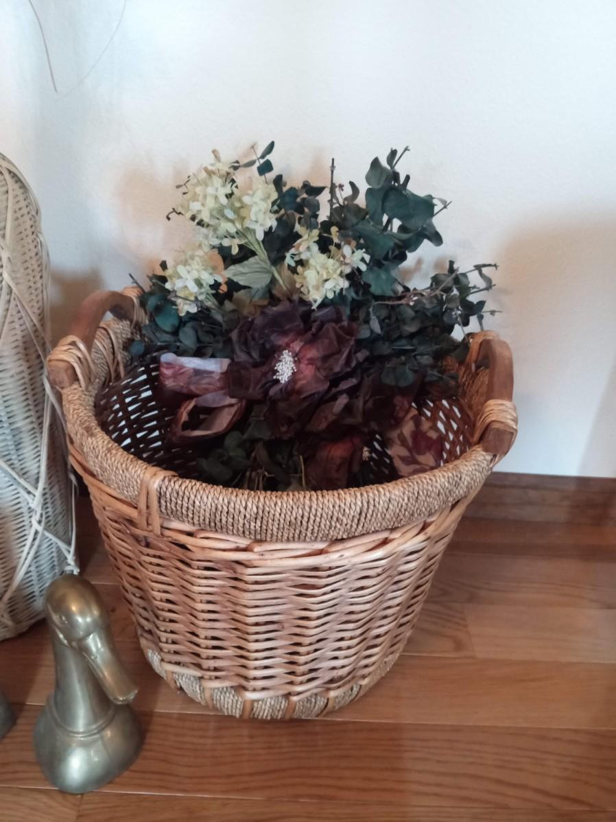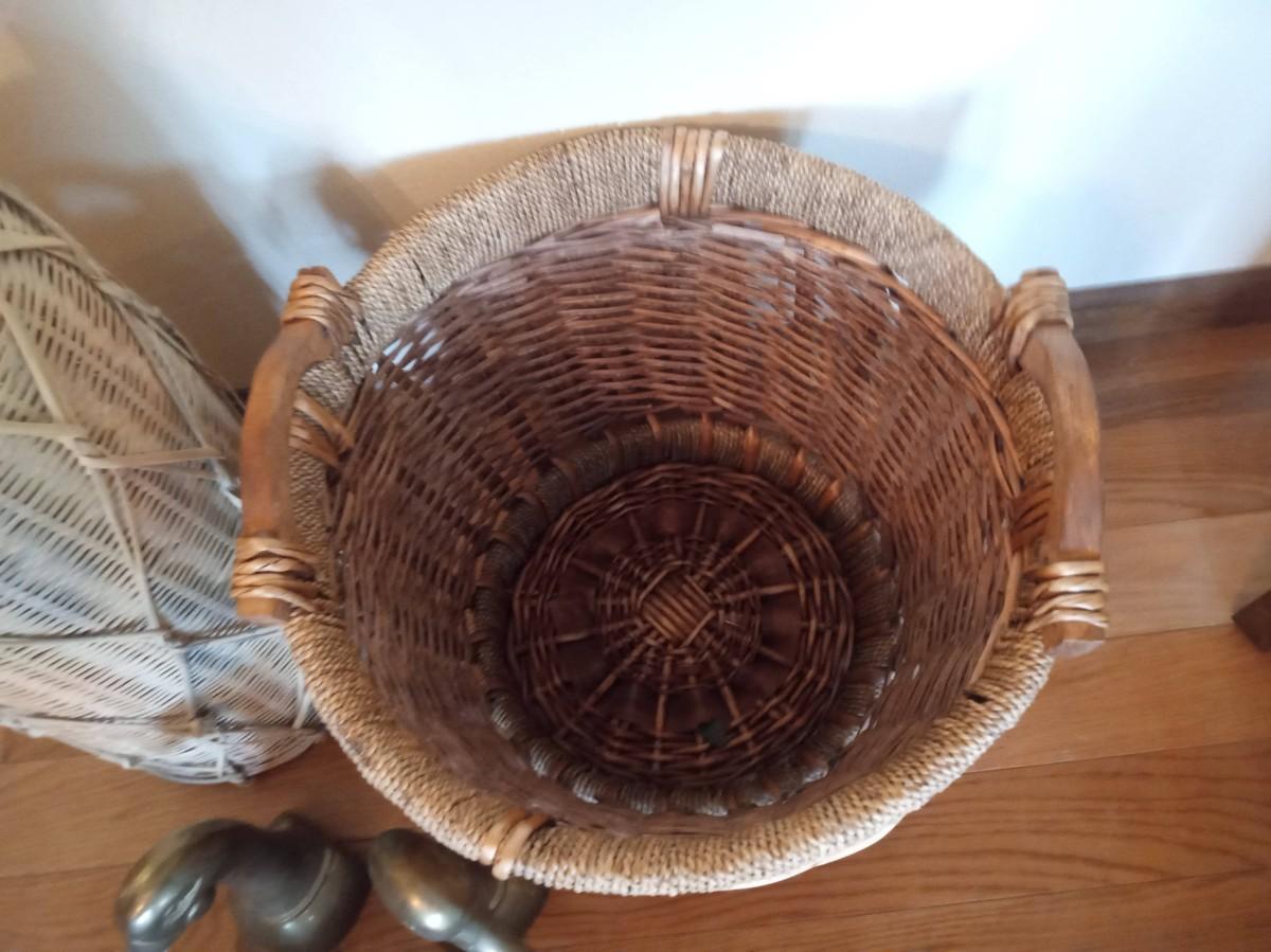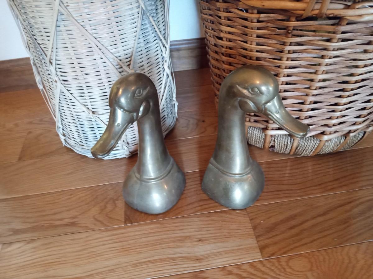 BRASS DUCK HEAD BOOKENDS AND LARGE BASKETS