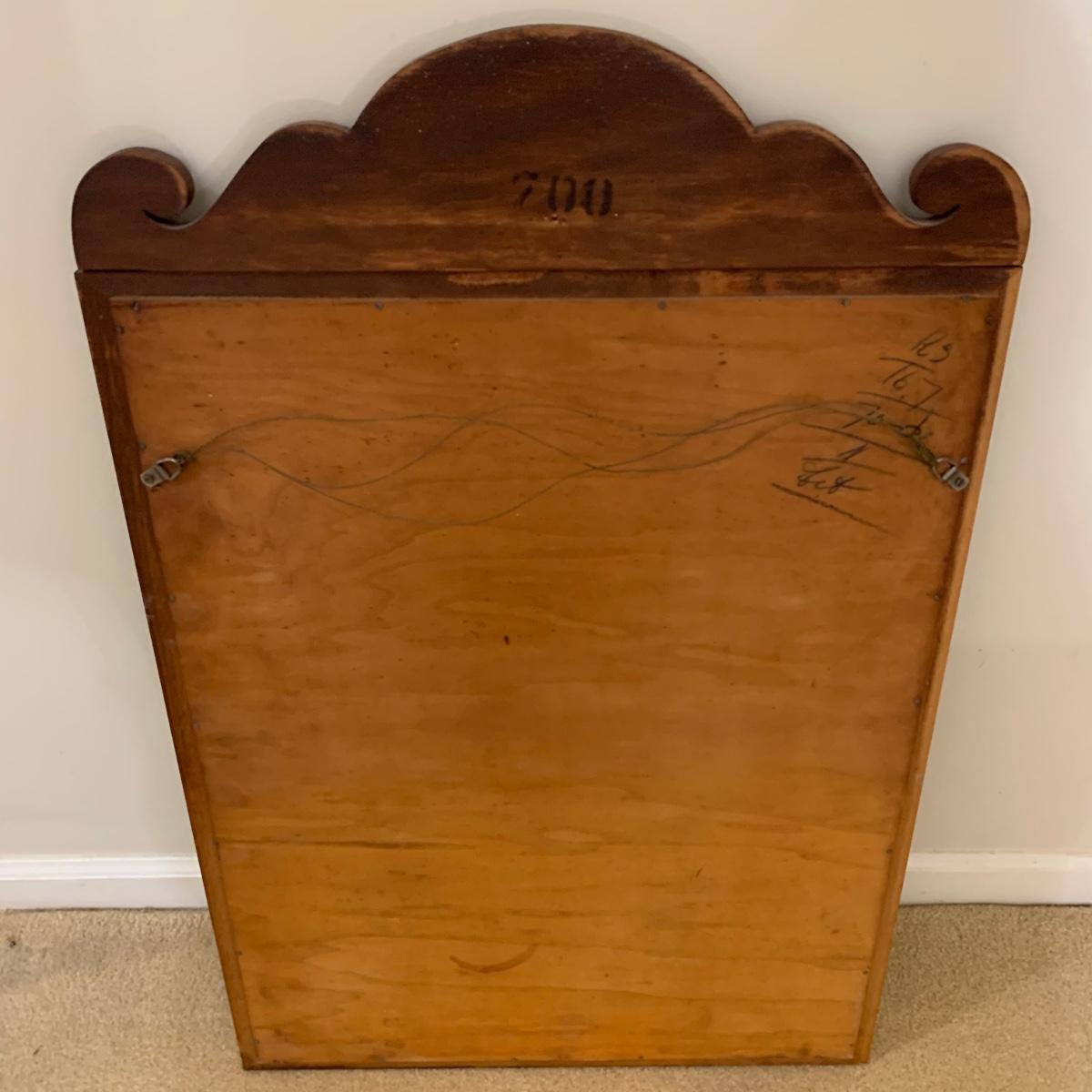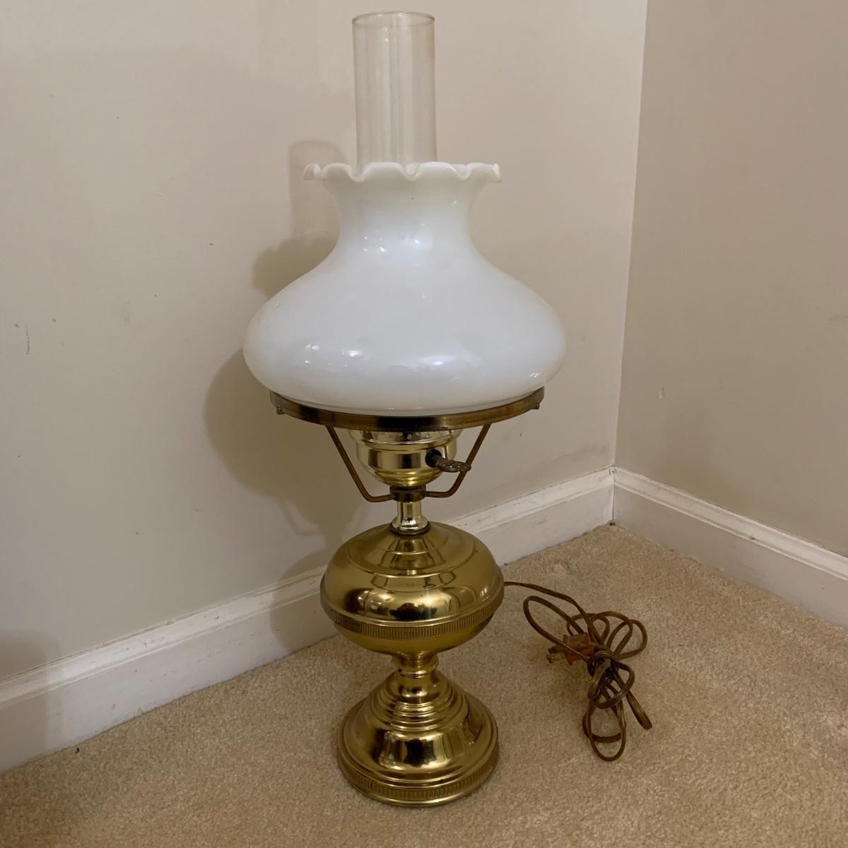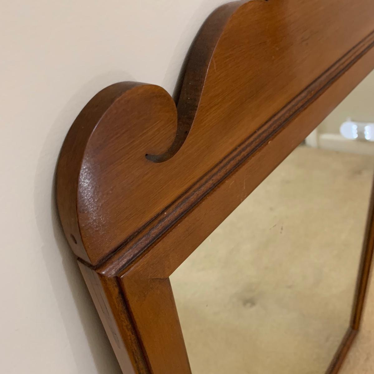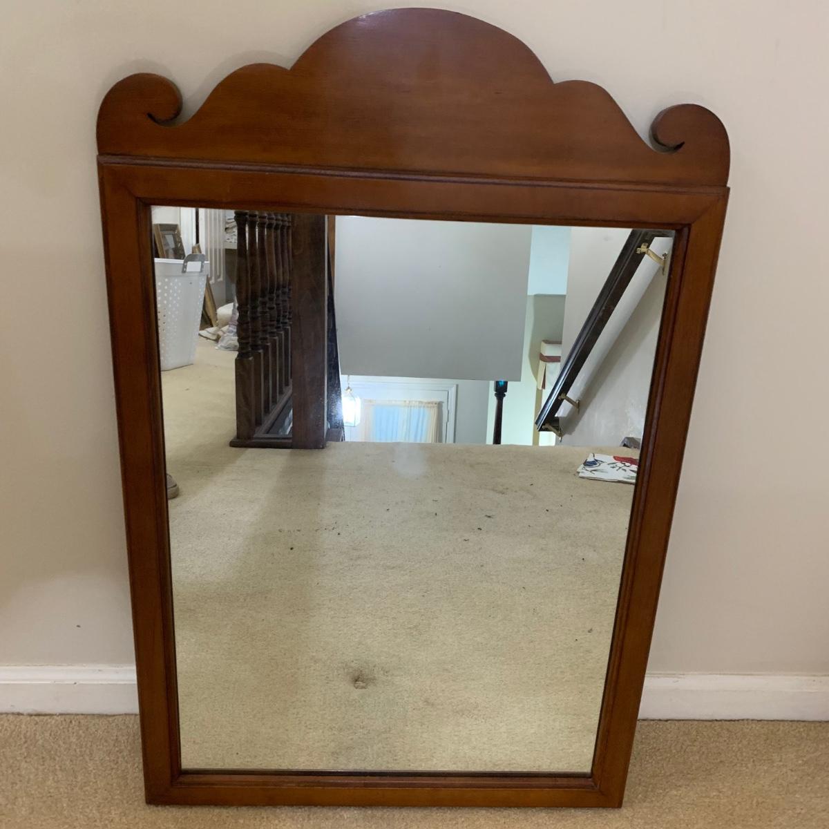 This lot includes a brass electric oil lamp and mirror. Brass lamp is in good condition and powers on. Mirror features nicely crafted wood frame, measuring 20.5”W x 31”H. Both items are in good condition. Local pick up only.