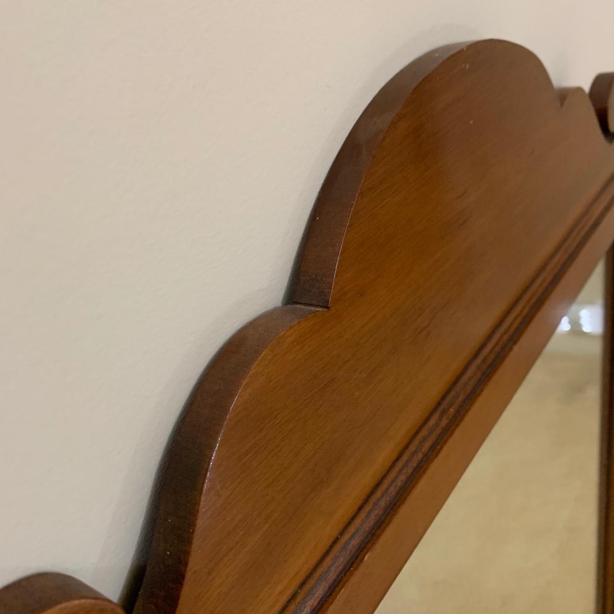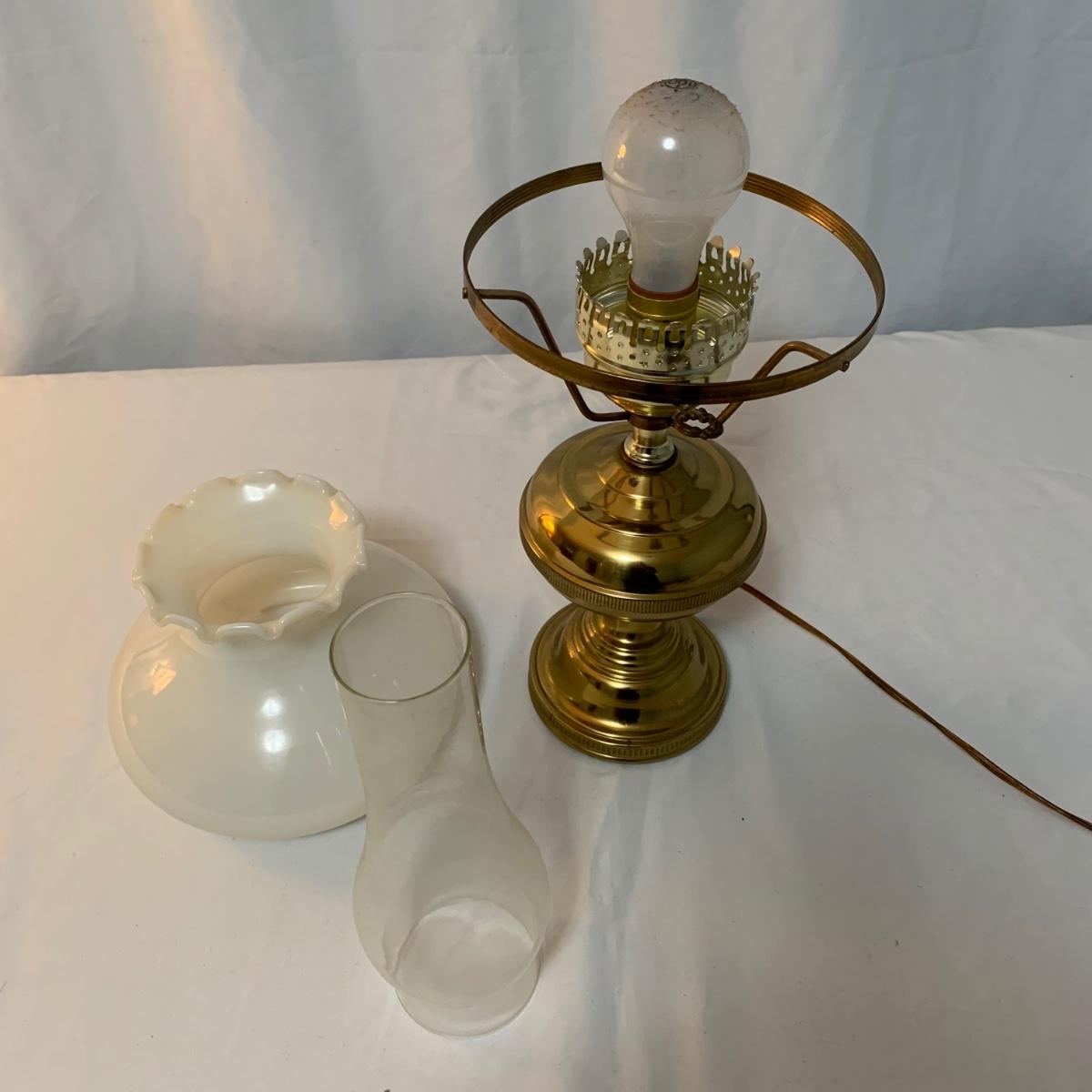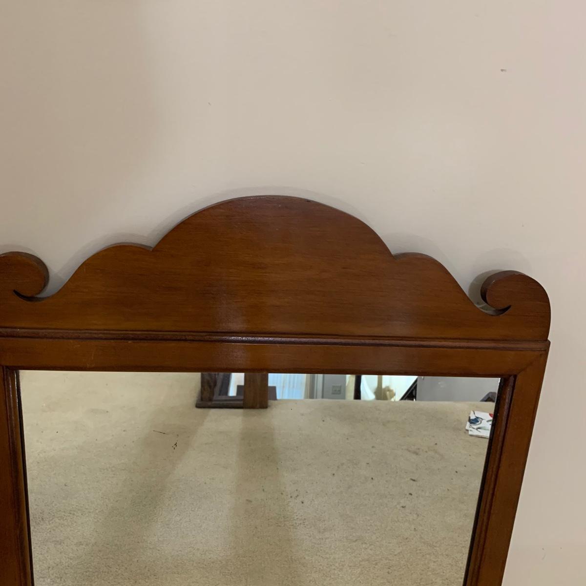 This lot includes a brass electric oil lamp and mirror. Brass lamp is in good condition and powers on. Mirror features nicely crafted wood frame, measuring 20.5”W x 31”H. Both items are in good condition. Local pick up only.