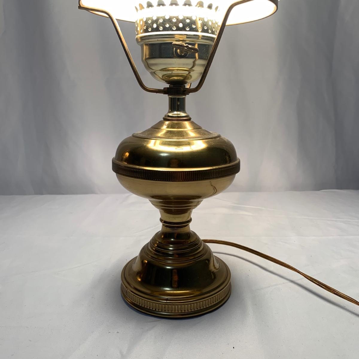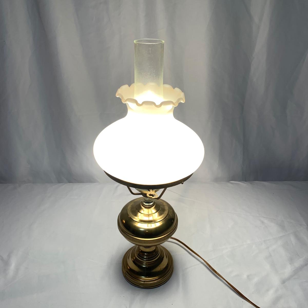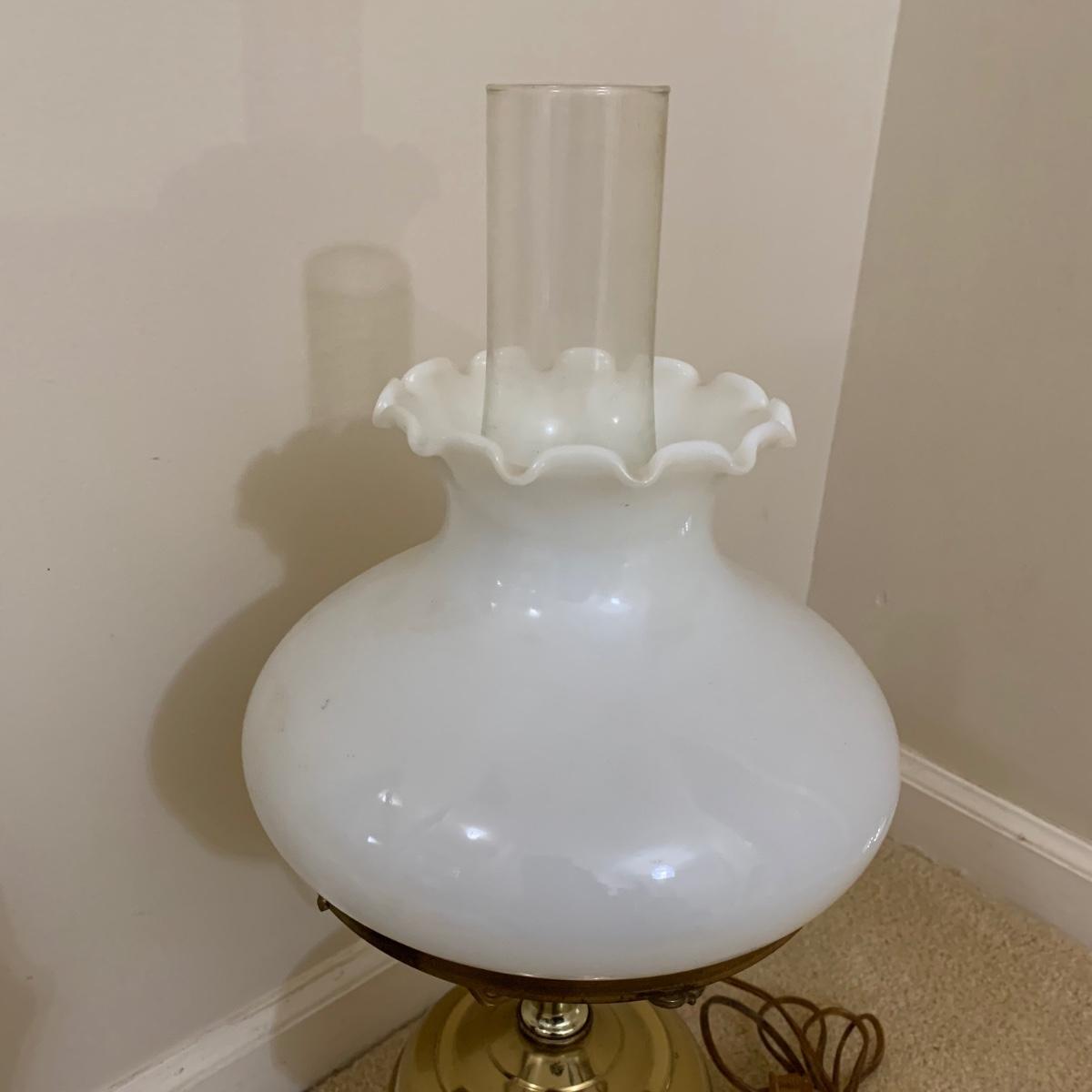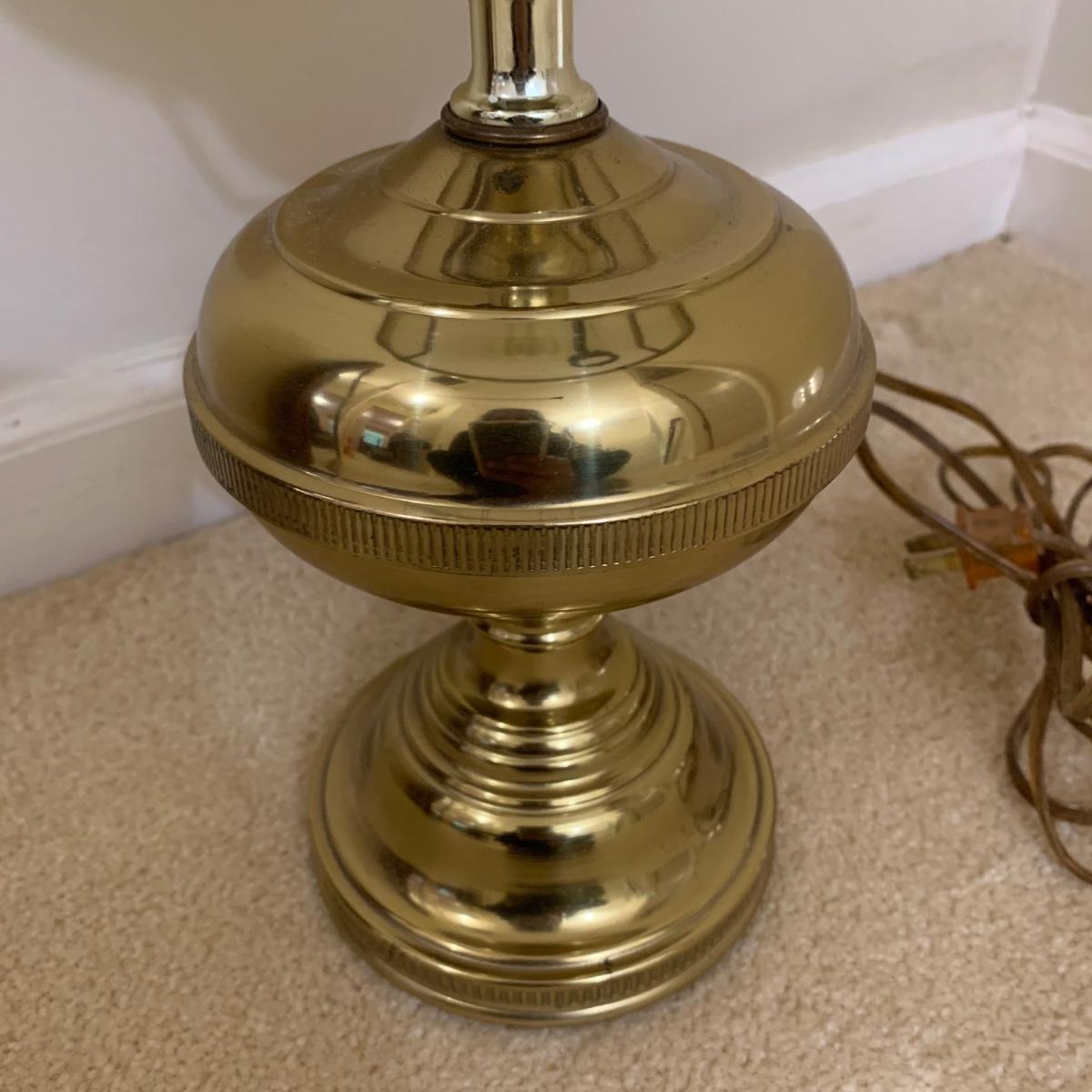 This lot includes a brass electric oil lamp and mirror. Brass lamp is in good condition and powers on. Mirror features nicely crafted wood frame, measuring 20.5”W x 31”H. Both items are in good condition. Local pick up only.