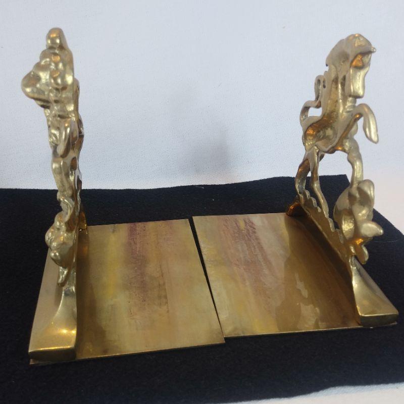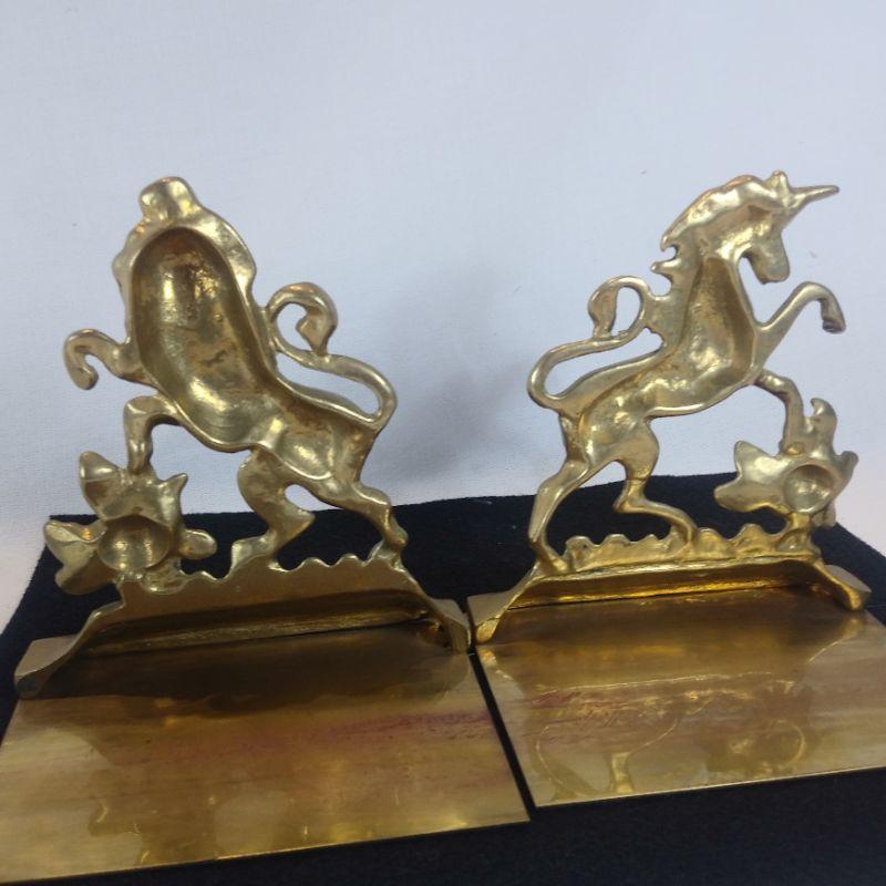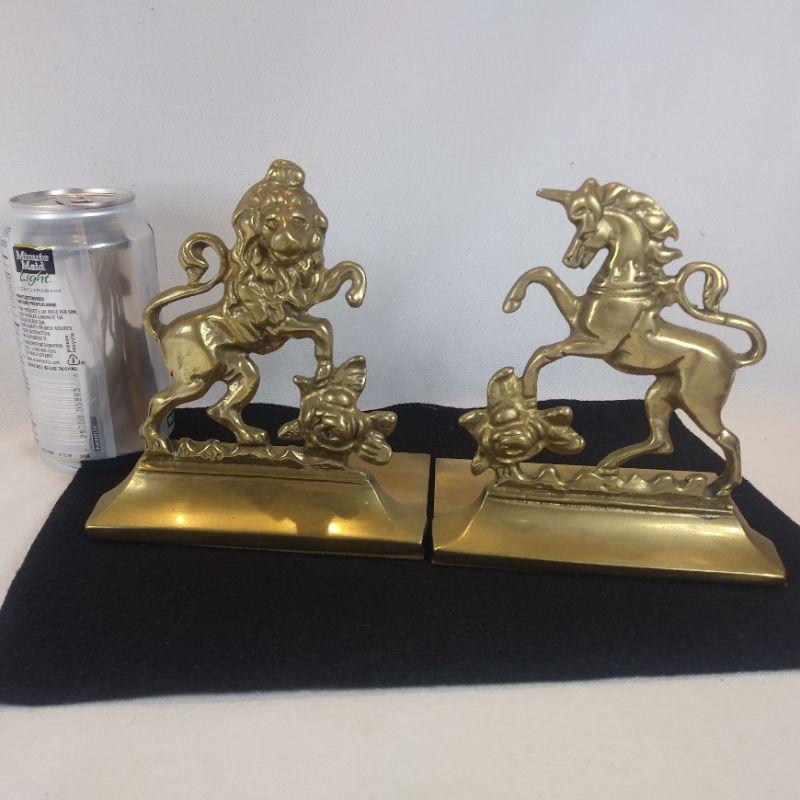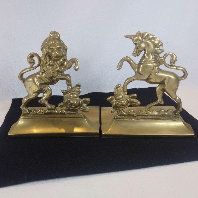 This offering is for a pair of very nice Brass English and Scottish Motif Bookends. Solid brass, very heavy bookends. The lion represents England and the Unicorn represents Scotland. They are 5 1/2-inches wide X 6-inches tall. No maker marks. Very Nice. Ready for your bookshelf. Reserve/Starting bid is $10.00.