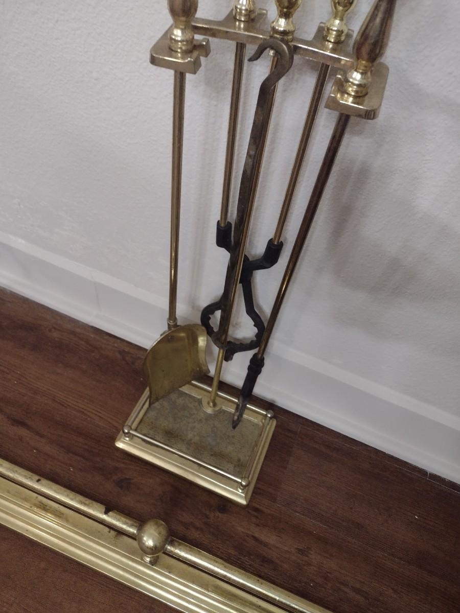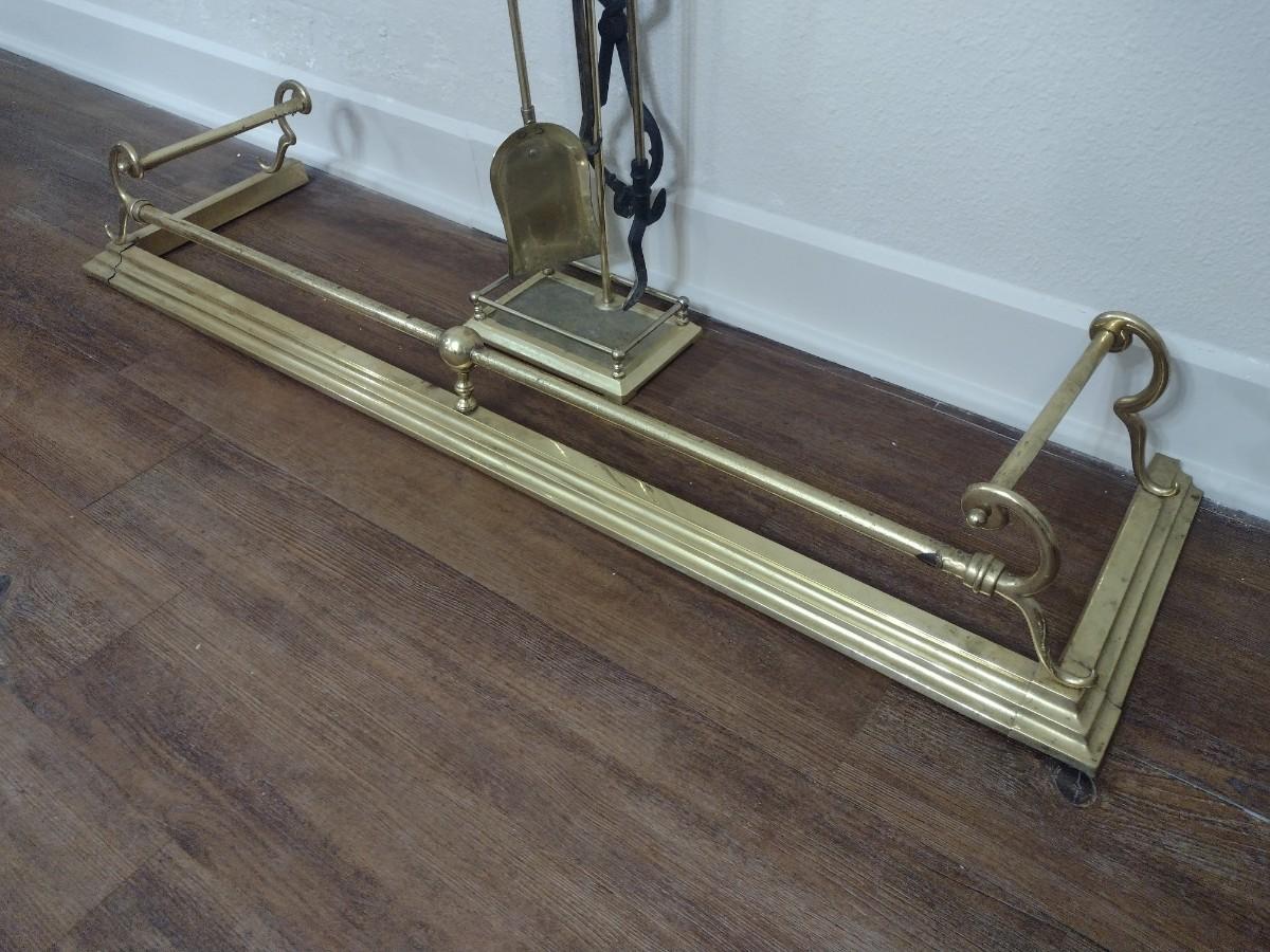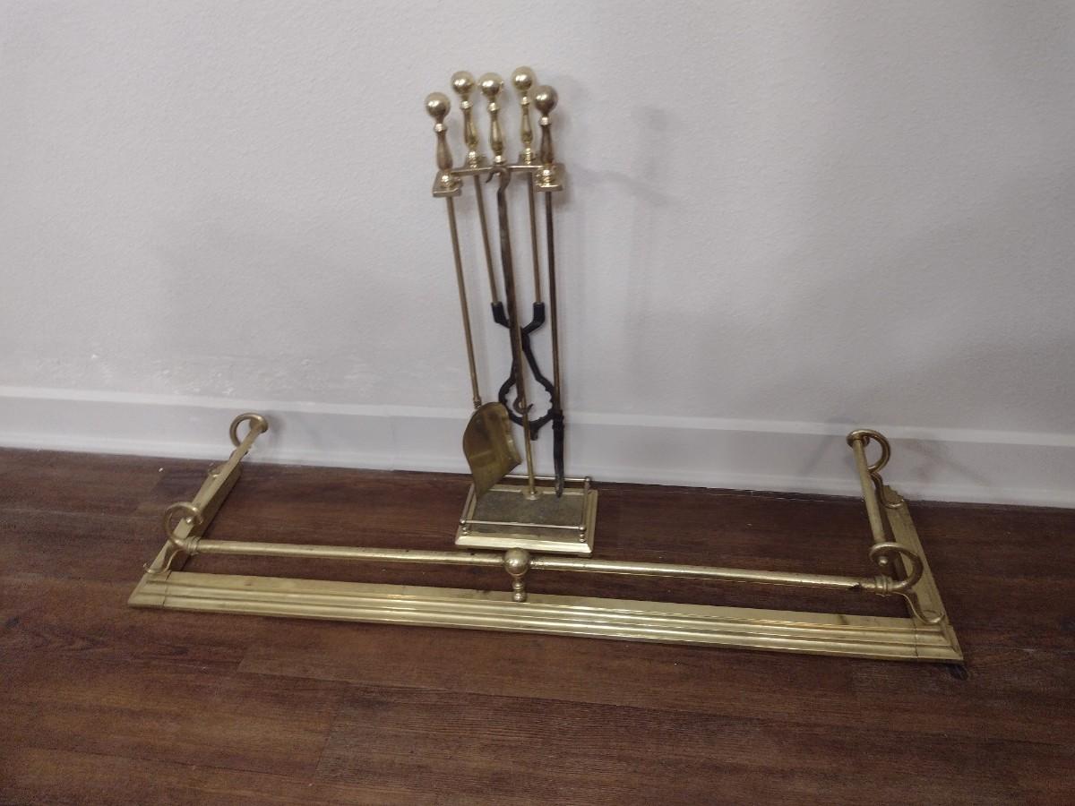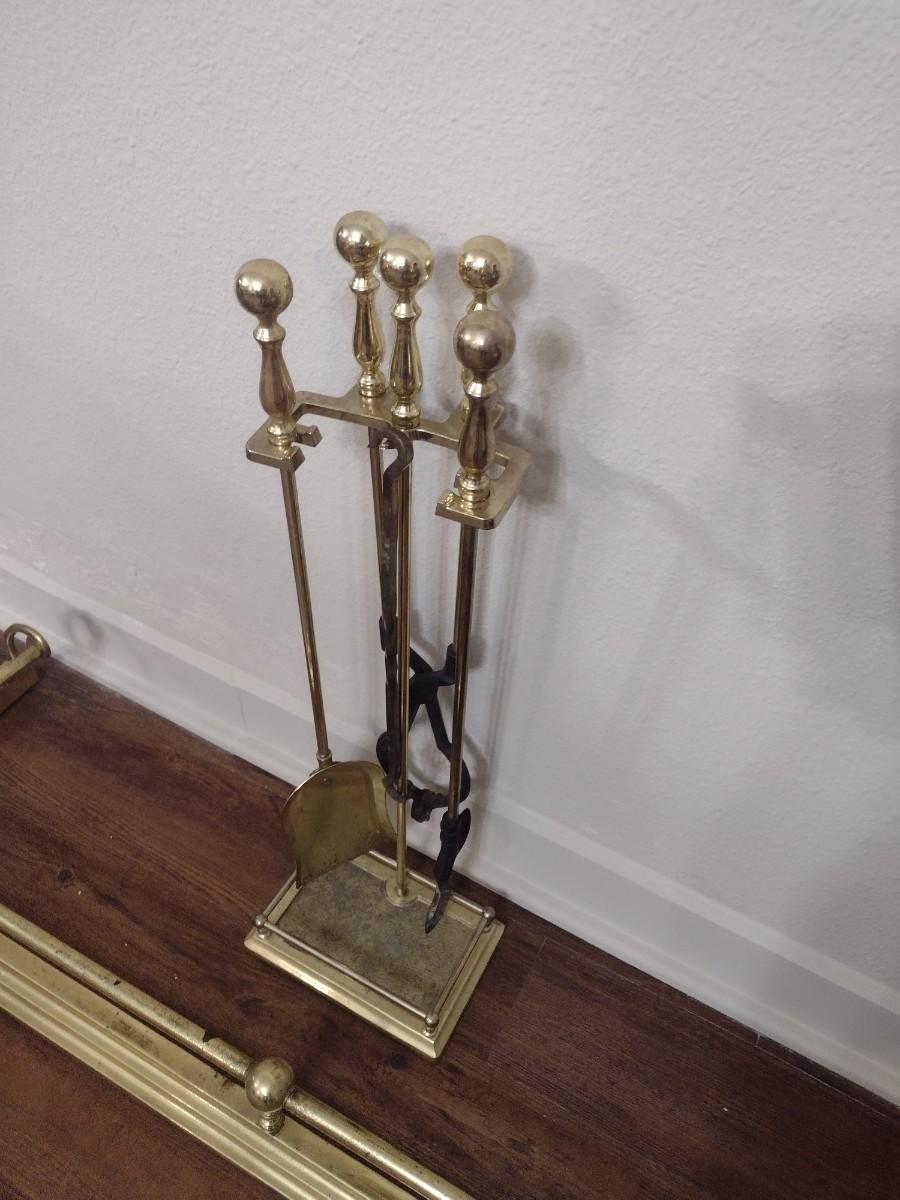 Brass Finish Fireplace Bumper and Tool Set. Bumper is lightweight metal base with brass cladding.