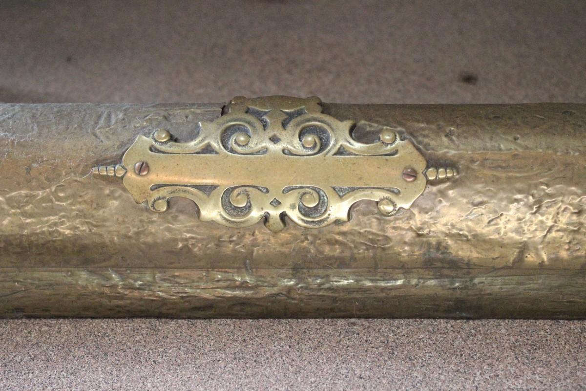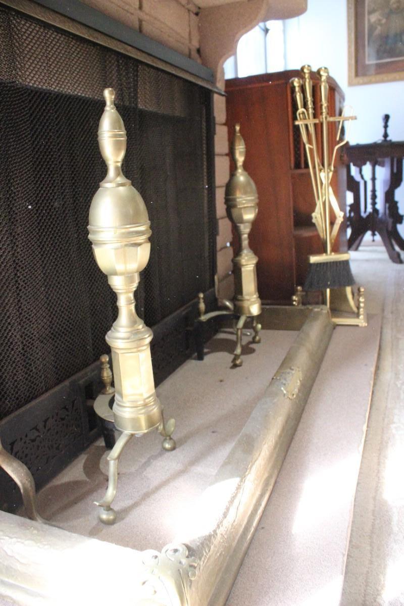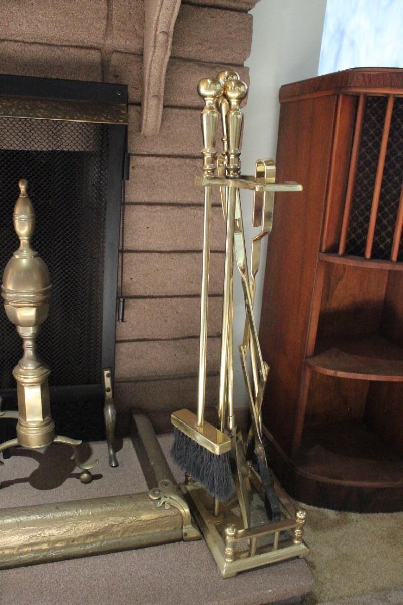 Fireplace accessory lot. Includes the andirons, tool set and the hearth guard piece, the fireplace screen is not included. Bright shiny brass, all pieces are in good condition.