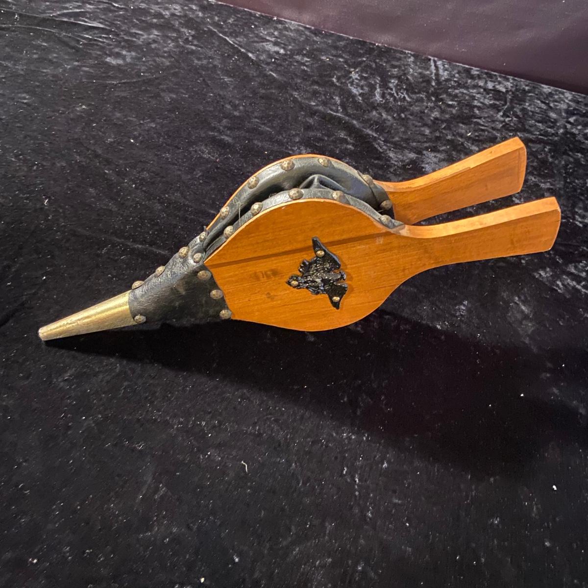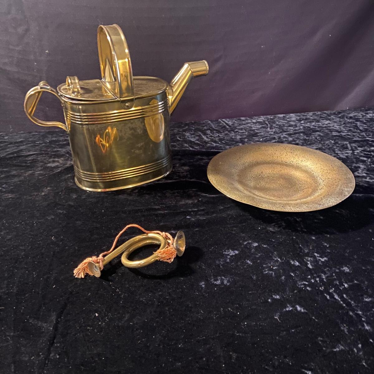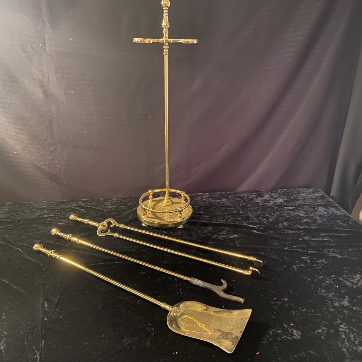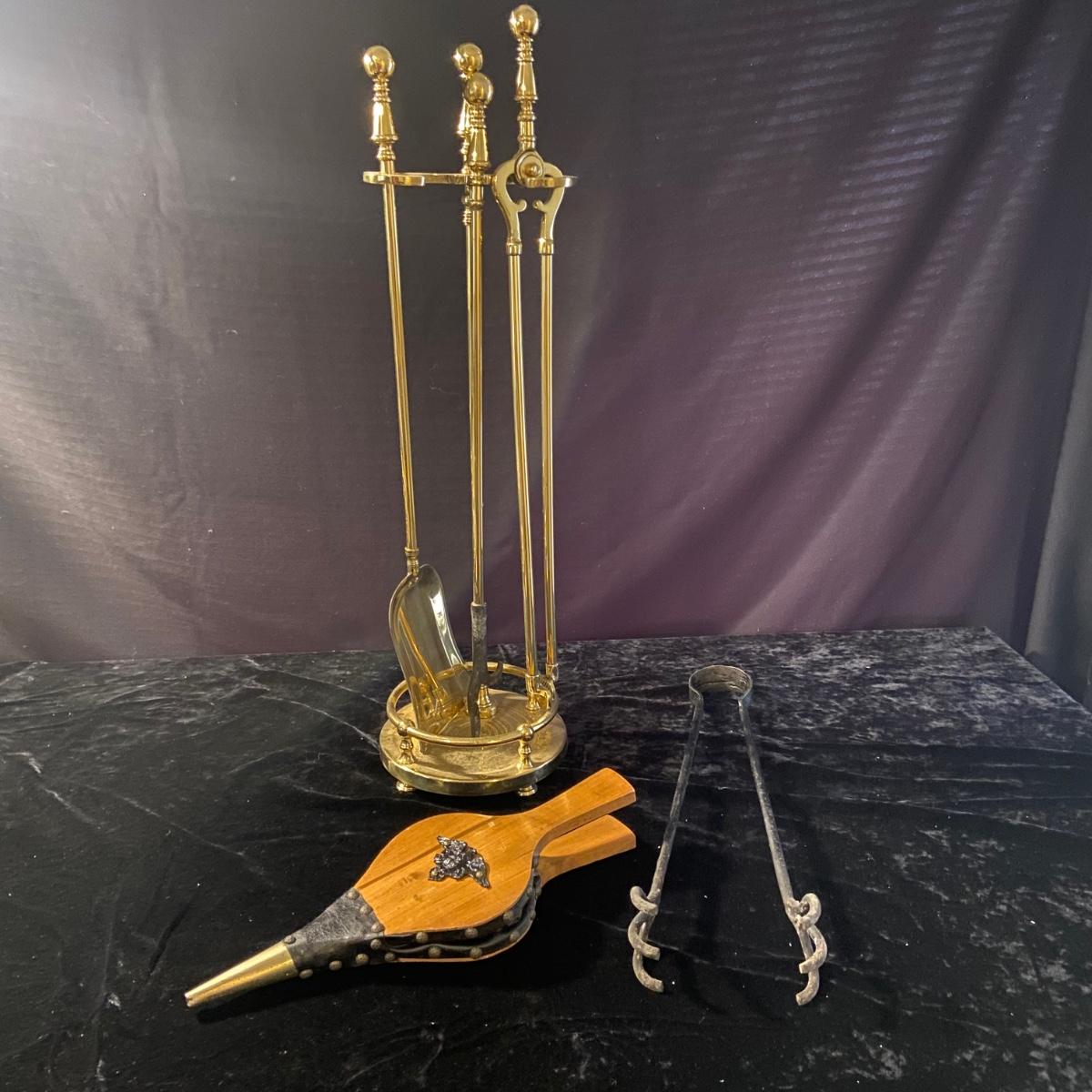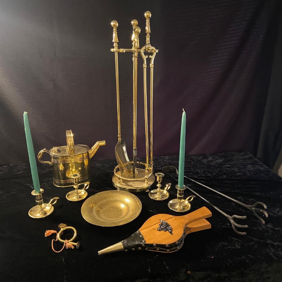 This lot contains ten lighting and fireplace tools, many appearing to be brass. First is a set of what appears to be brass fireplace tools with a stand that has an 8”D and stands 27”H. includes a poker, a mini shovel, and tongs. There is also another pair of metal tongs, a wood and leather fireplace bellow that measures 16” x 6.5”, a mini brass French horn ornament, a dish, four candlestick holders, and a watering can. Local pick up only.