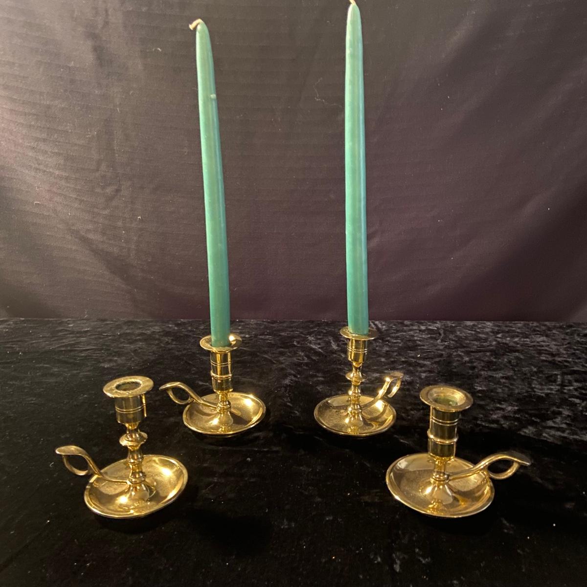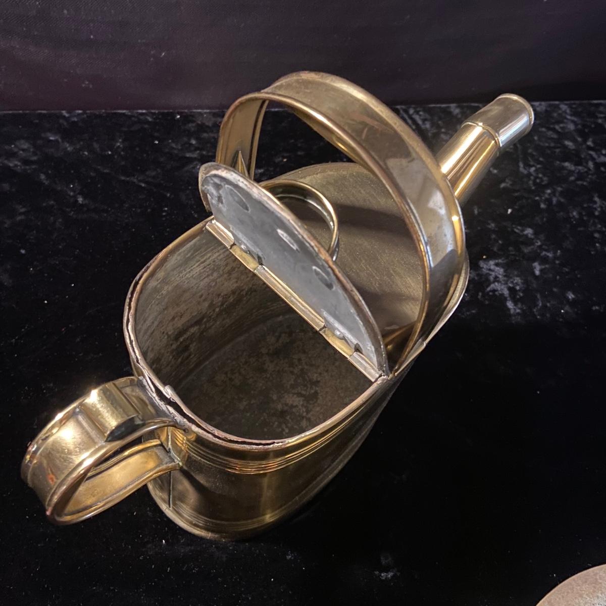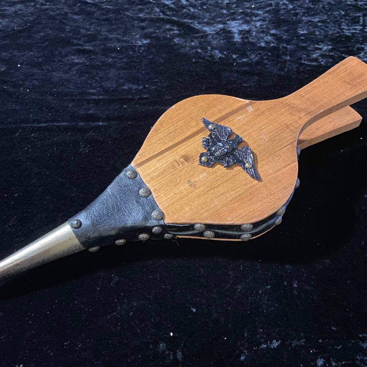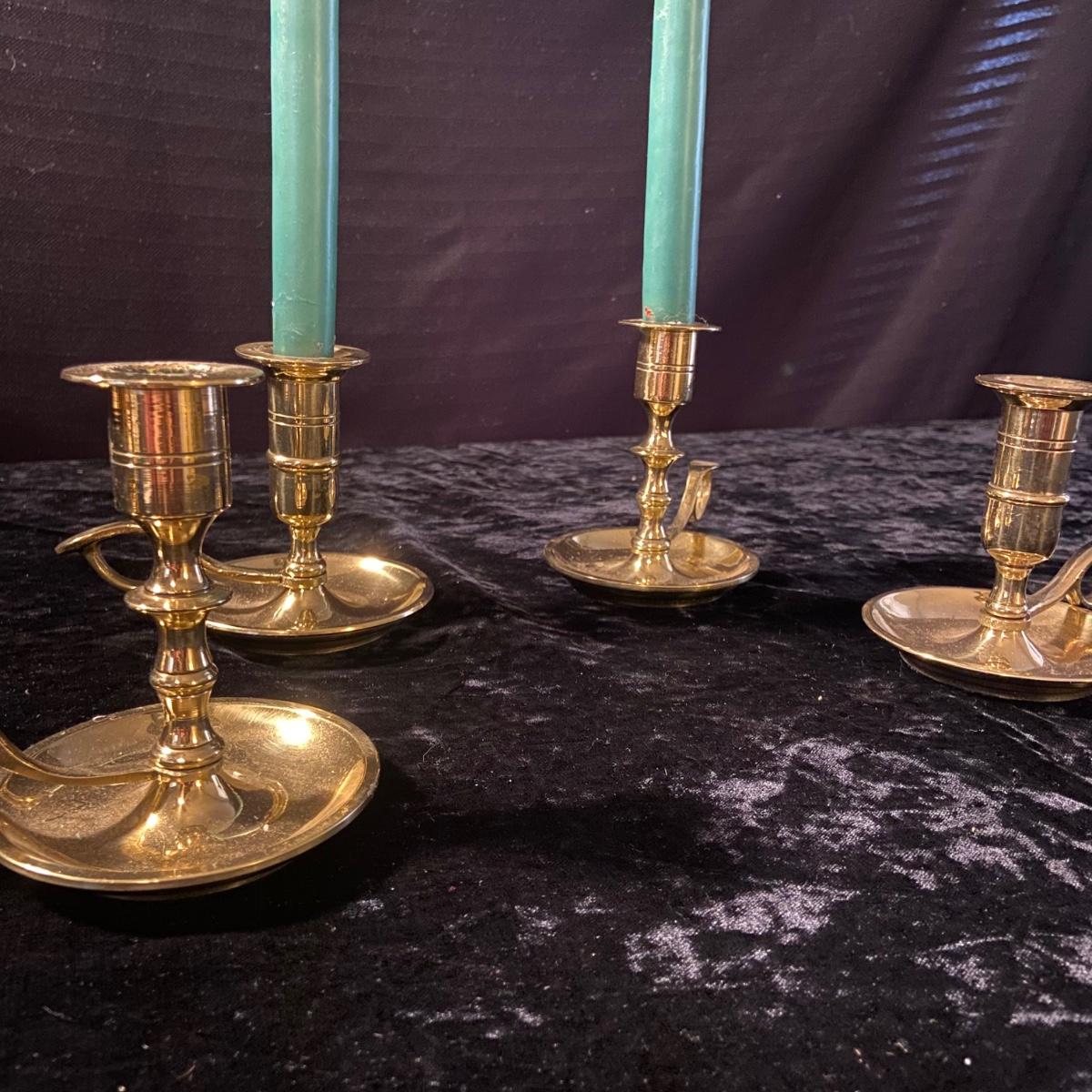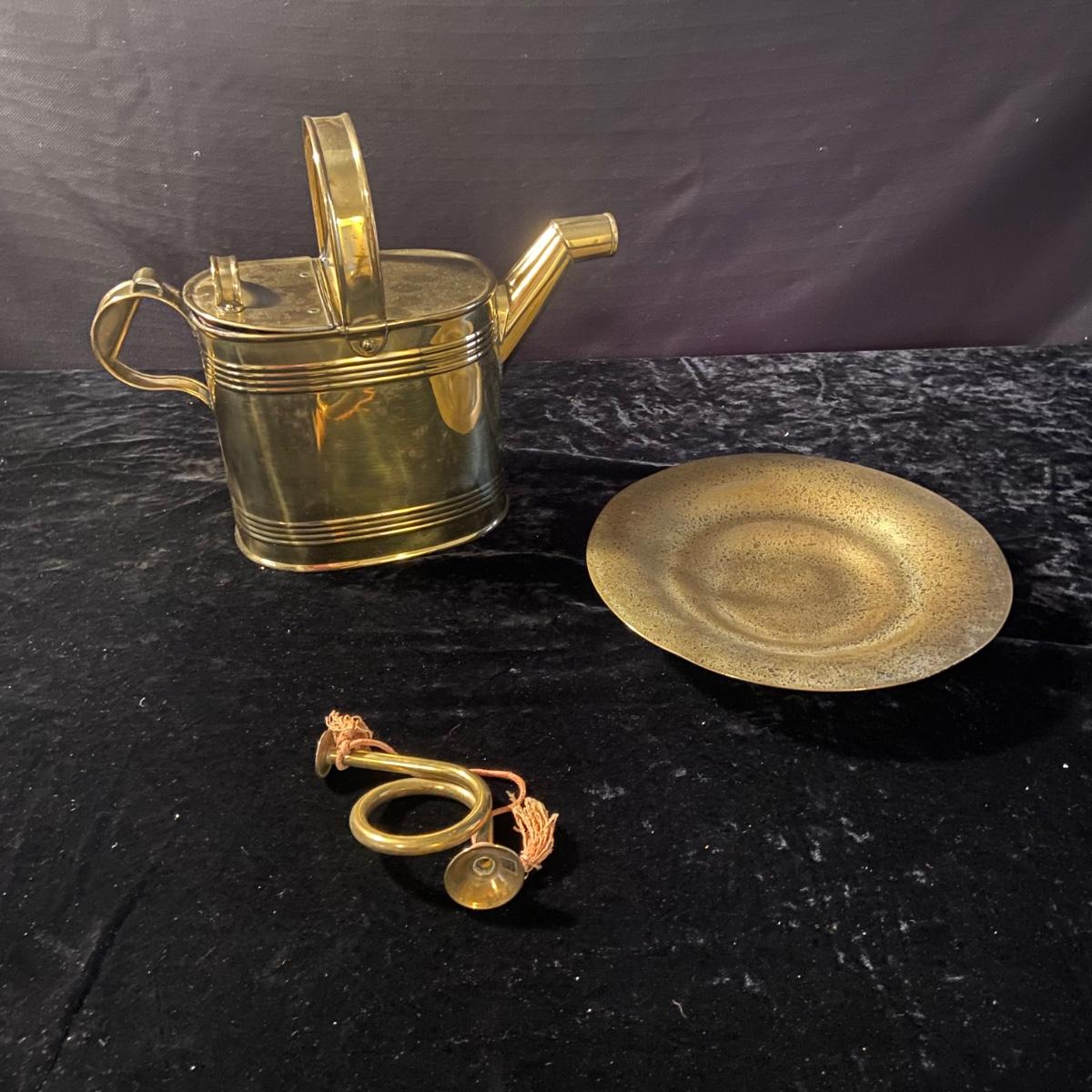 This lot contains ten lighting and fireplace tools, many appearing to be brass. First is a set of what appears to be brass fireplace tools with a stand that has an 8”D and stands 27”H. includes a poker, a mini shovel, and tongs. There is also another pair of metal tongs, a wood and leather fireplace bellow that measures 16” x 6.5”, a mini brass French horn ornament, a dish, four candlestick holders, and a watering can. Local pick up only.