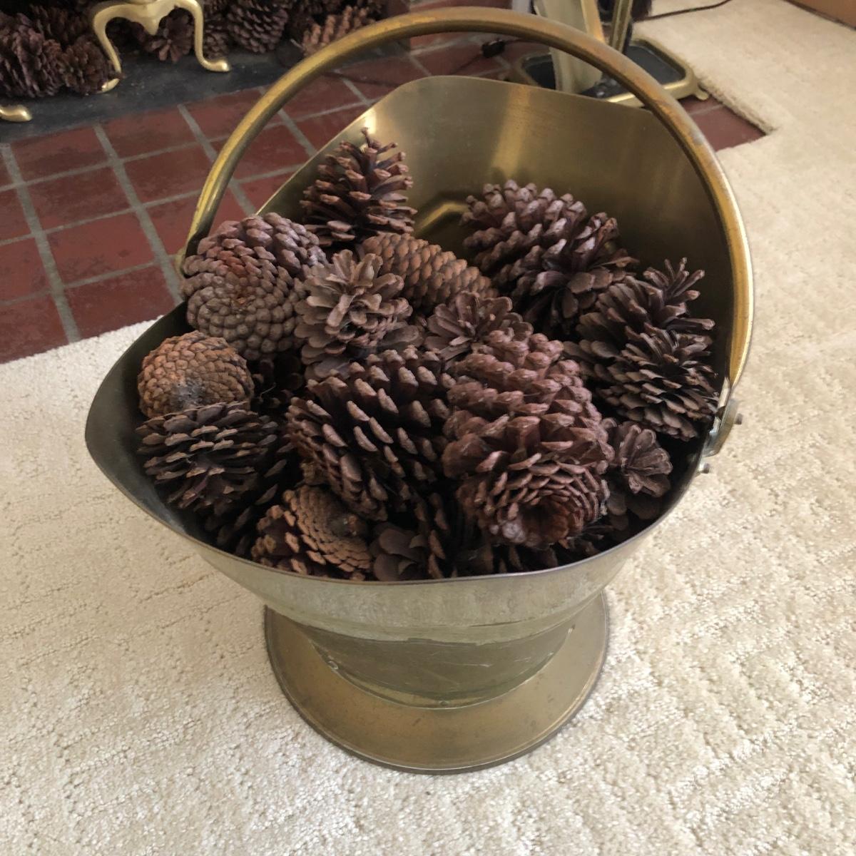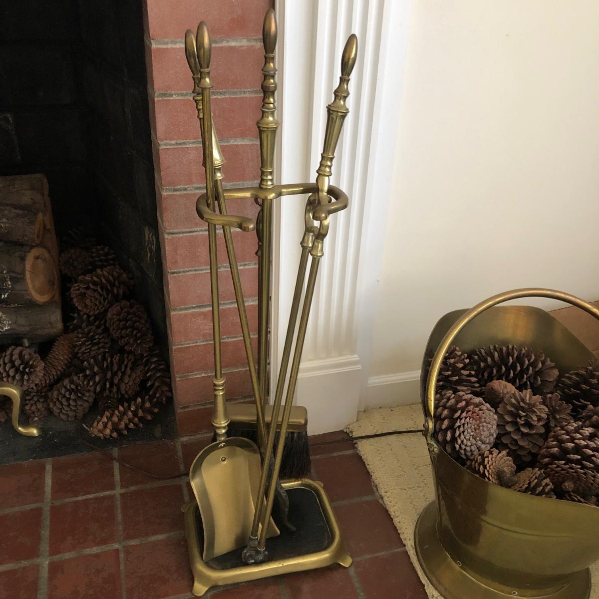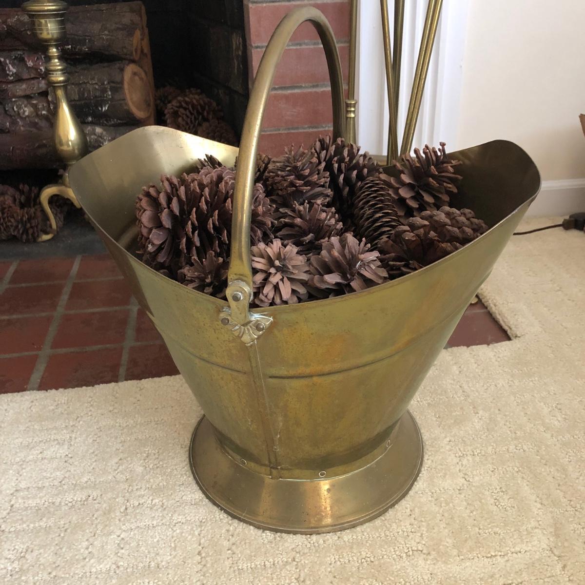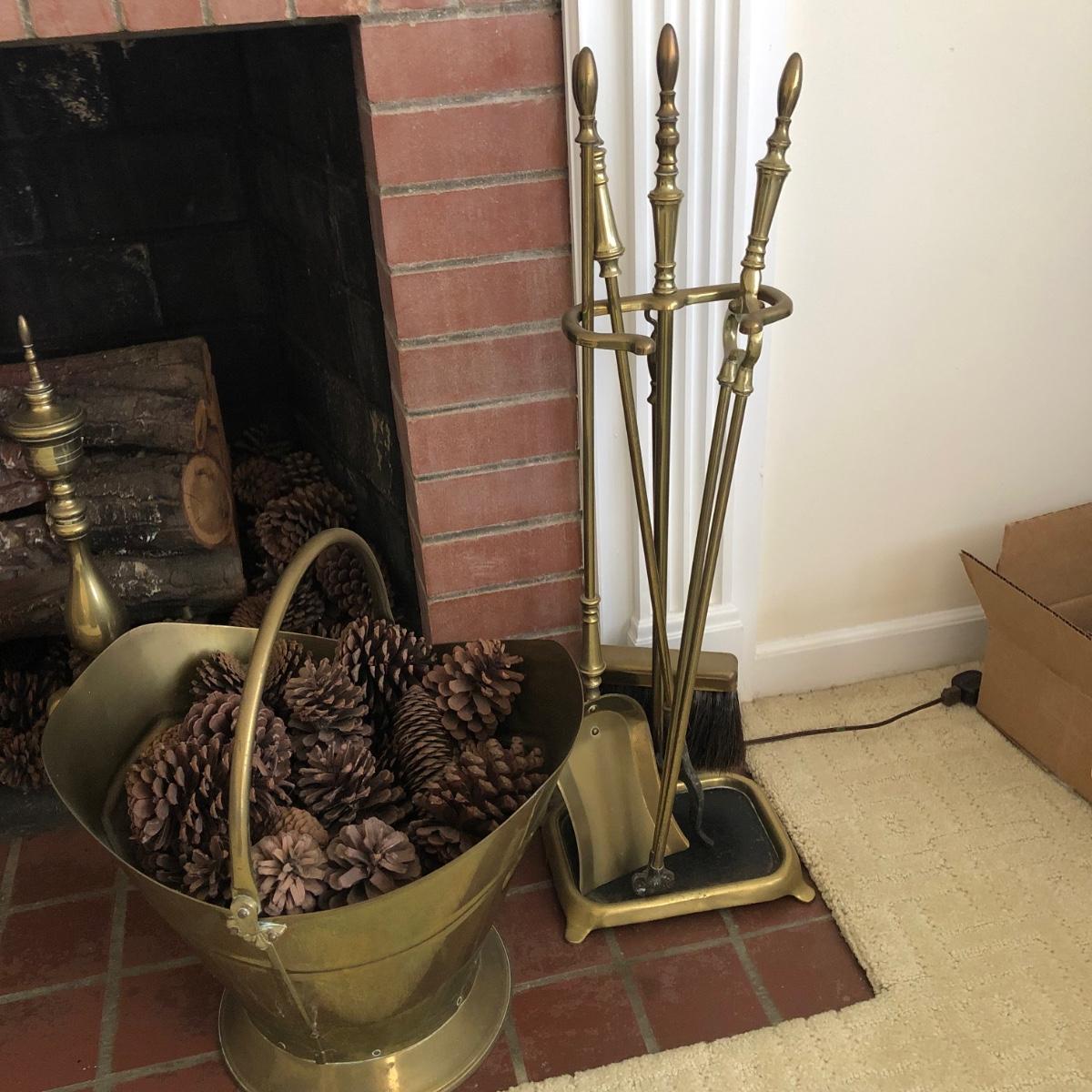 This lot includes a set of fireplace tools and a coal bucket. The coal bucket’s handle is on a hinge and measures 15.5” x 12” x 17” (handle). The fireplace set has four tools and stands almost 30” tall. The base measures 9” x 7”. Pinecones in bucket are included. (Andiron not included.) Local pick up only.