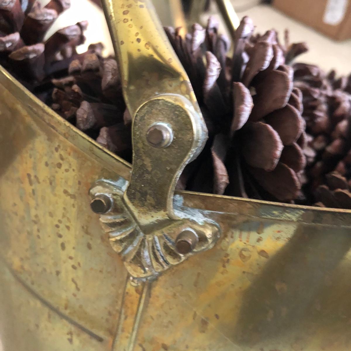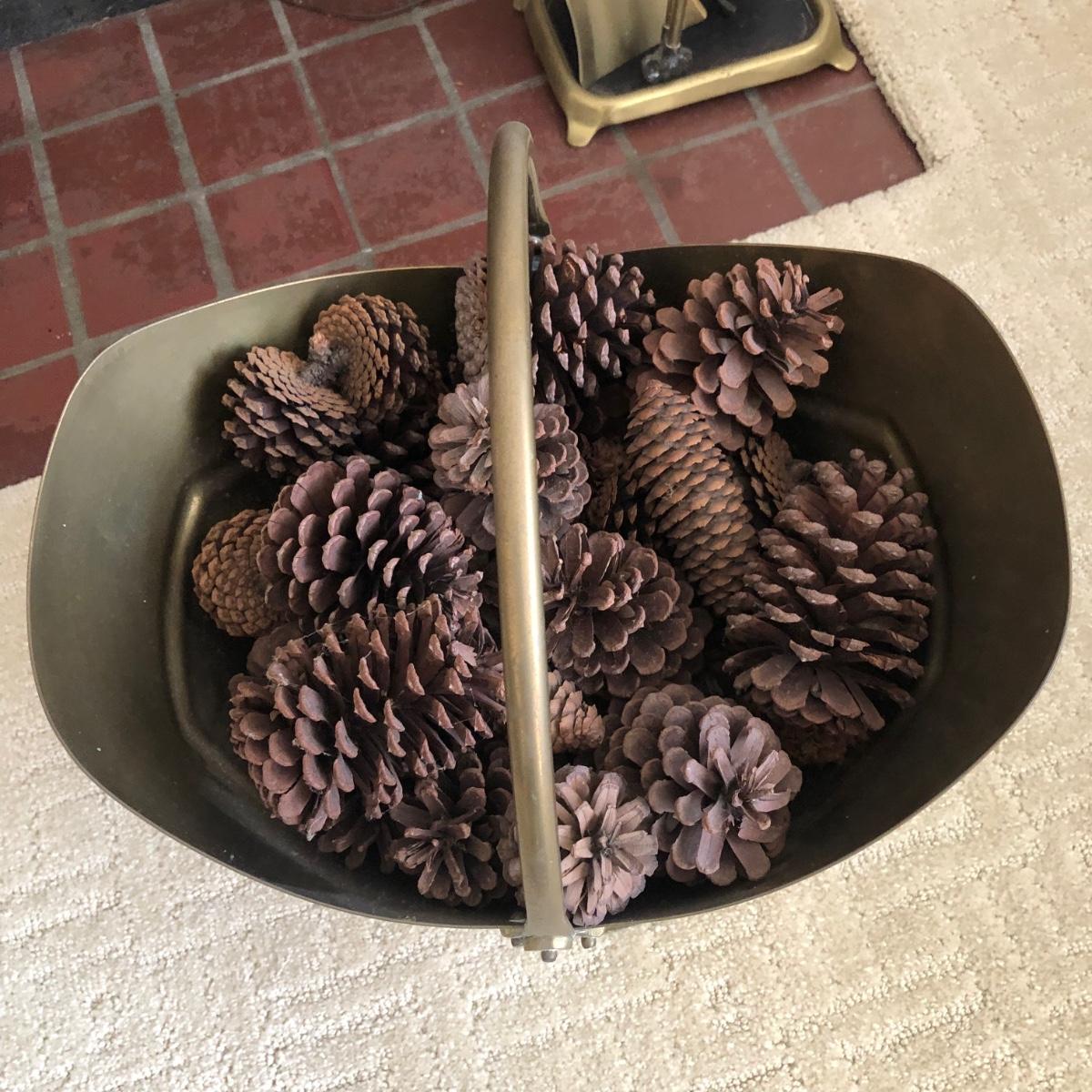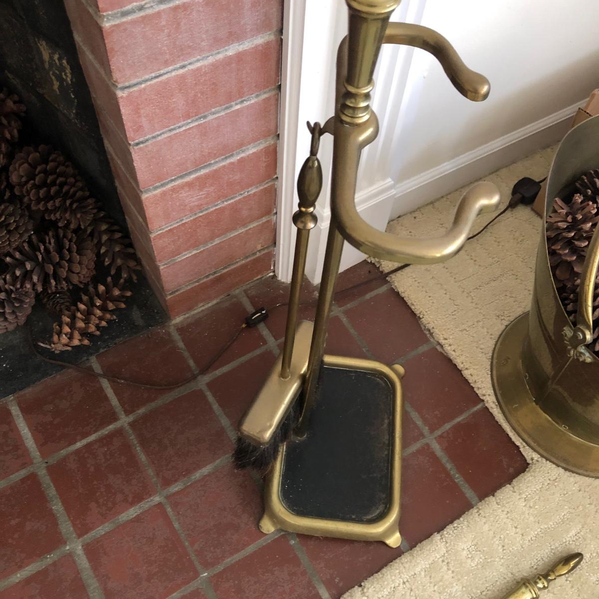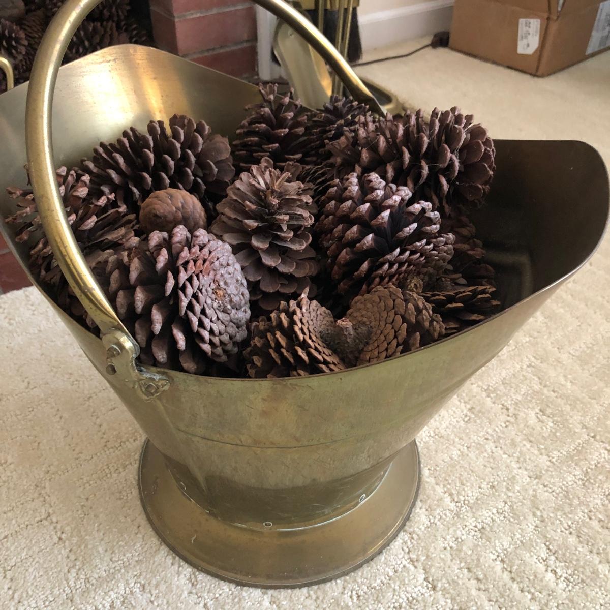 This lot includes a set of fireplace tools and a coal bucket. The coal bucket’s handle is on a hinge and measures 15.5” x 12” x 17” (handle). The fireplace set has four tools and stands almost 30” tall. The base measures 9” x 7”. Pinecones in bucket are included. (Andiron not included.) Local pick up only.
