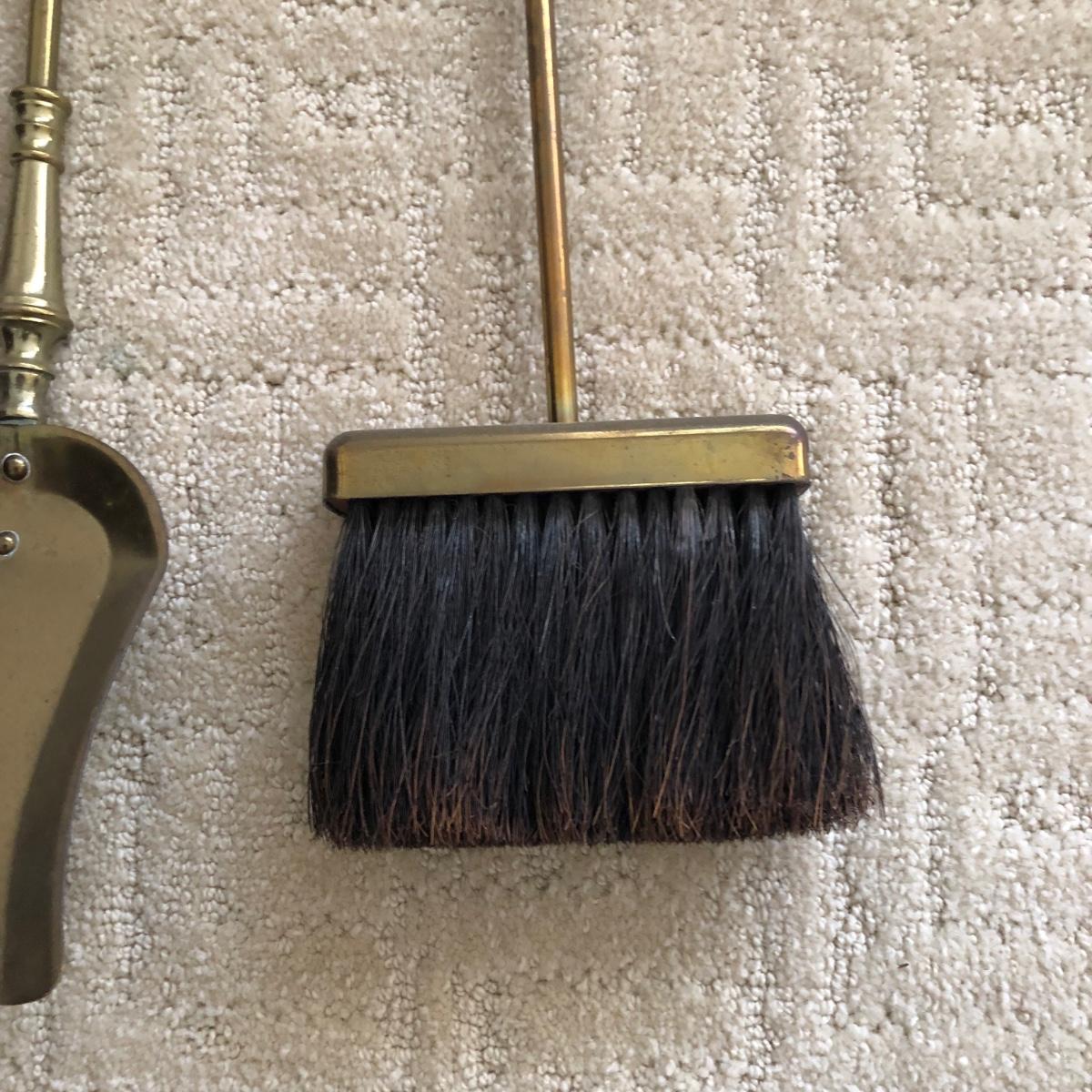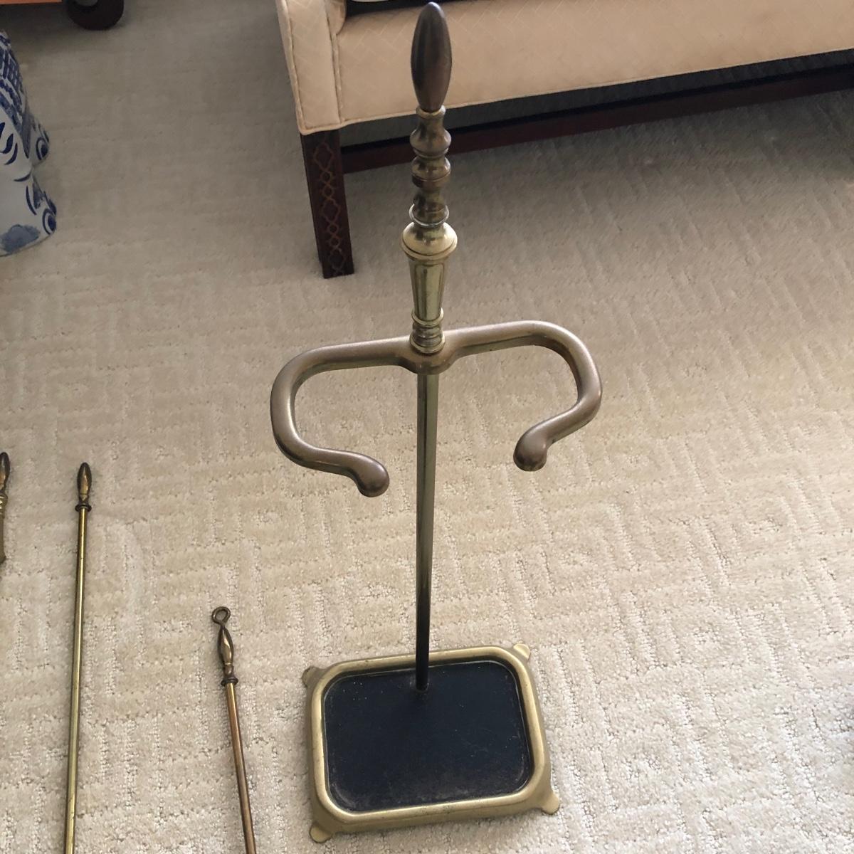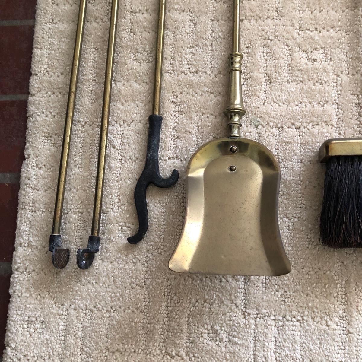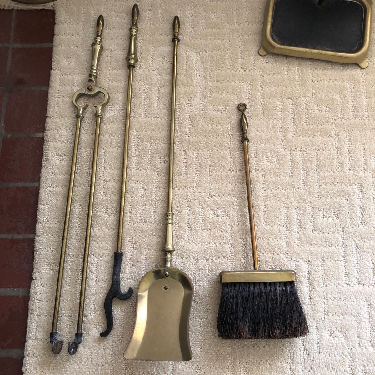 This lot includes a set of fireplace tools and a coal bucket. The coal bucket’s handle is on a hinge and measures 15.5” x 12” x 17” (handle). The fireplace set has four tools and stands almost 30” tall. The base measures 9” x 7”. Pinecones in bucket are included. (Andiron not included.) Local pick up only.