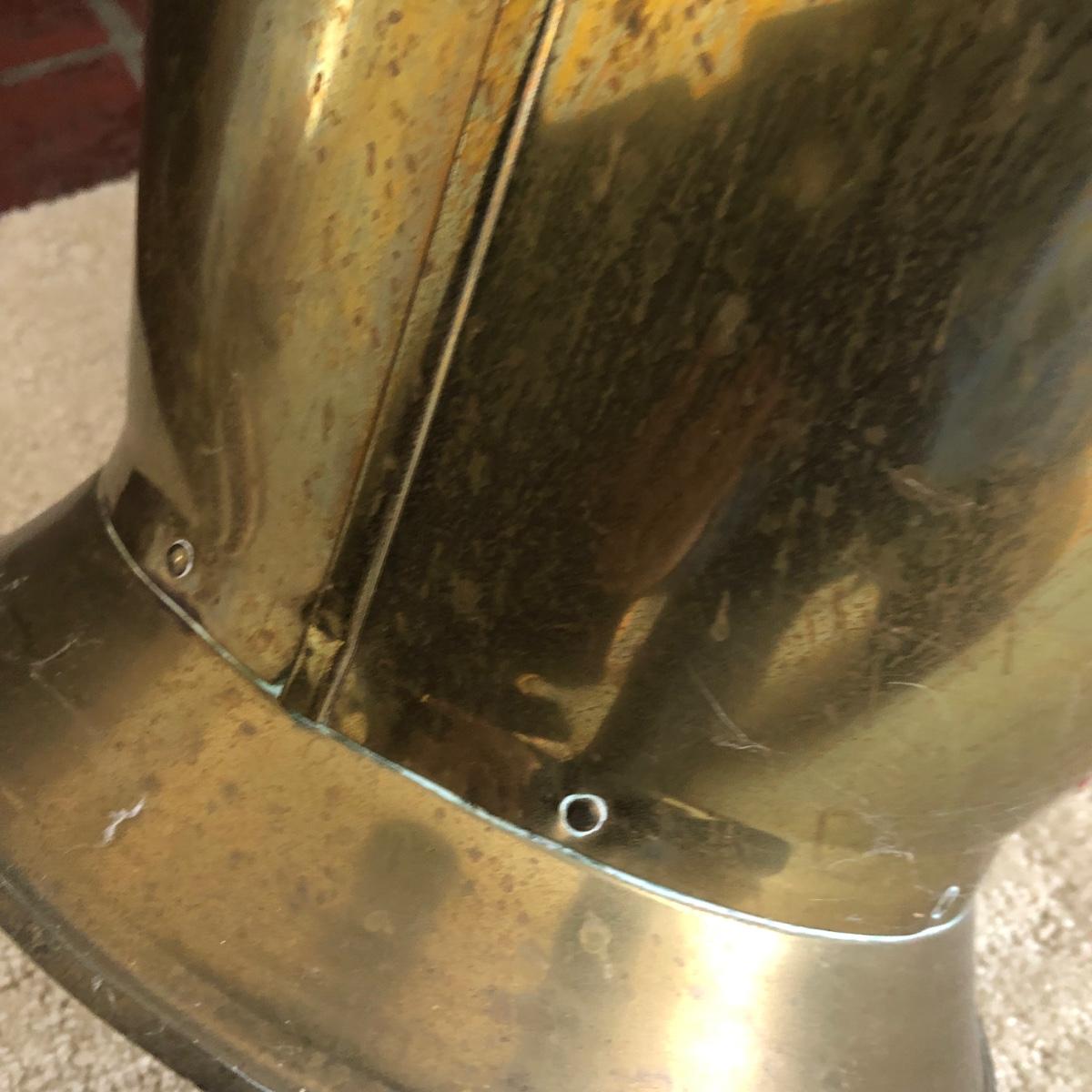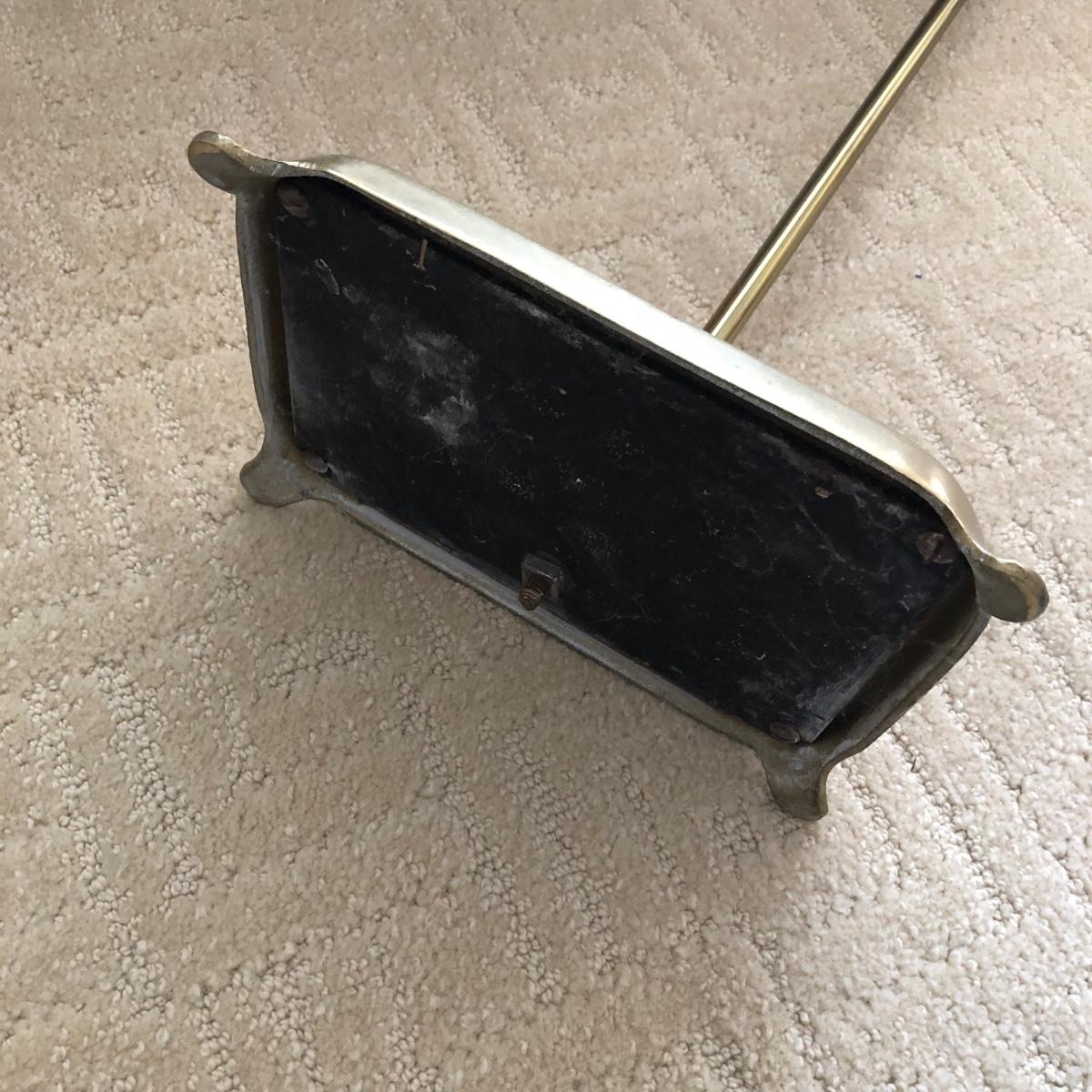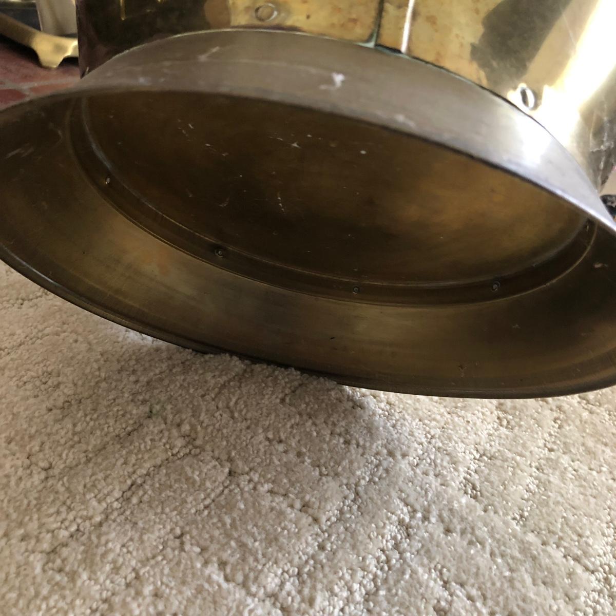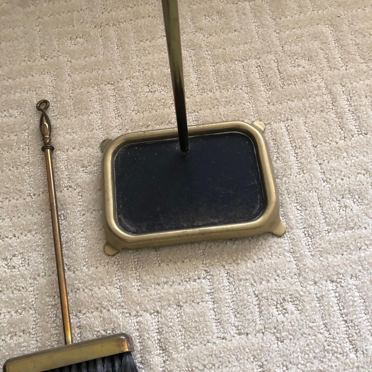 This lot includes a set of fireplace tools and a coal bucket. The coal bucket’s handle is on a hinge and measures 15.5” x 12” x 17” (handle). The fireplace set has four tools and stands almost 30” tall. The base measures 9” x 7”. Pinecones in bucket are included. (Andiron not included.) Local pick up only.