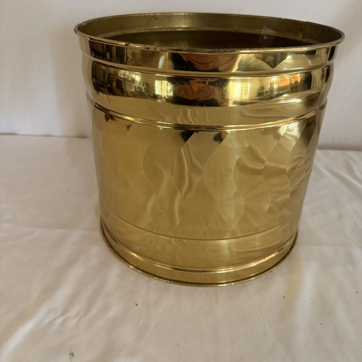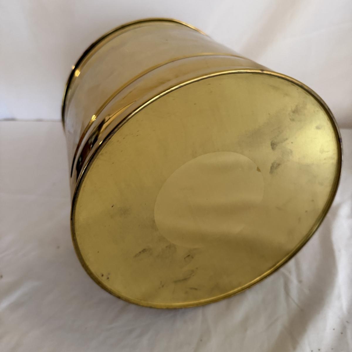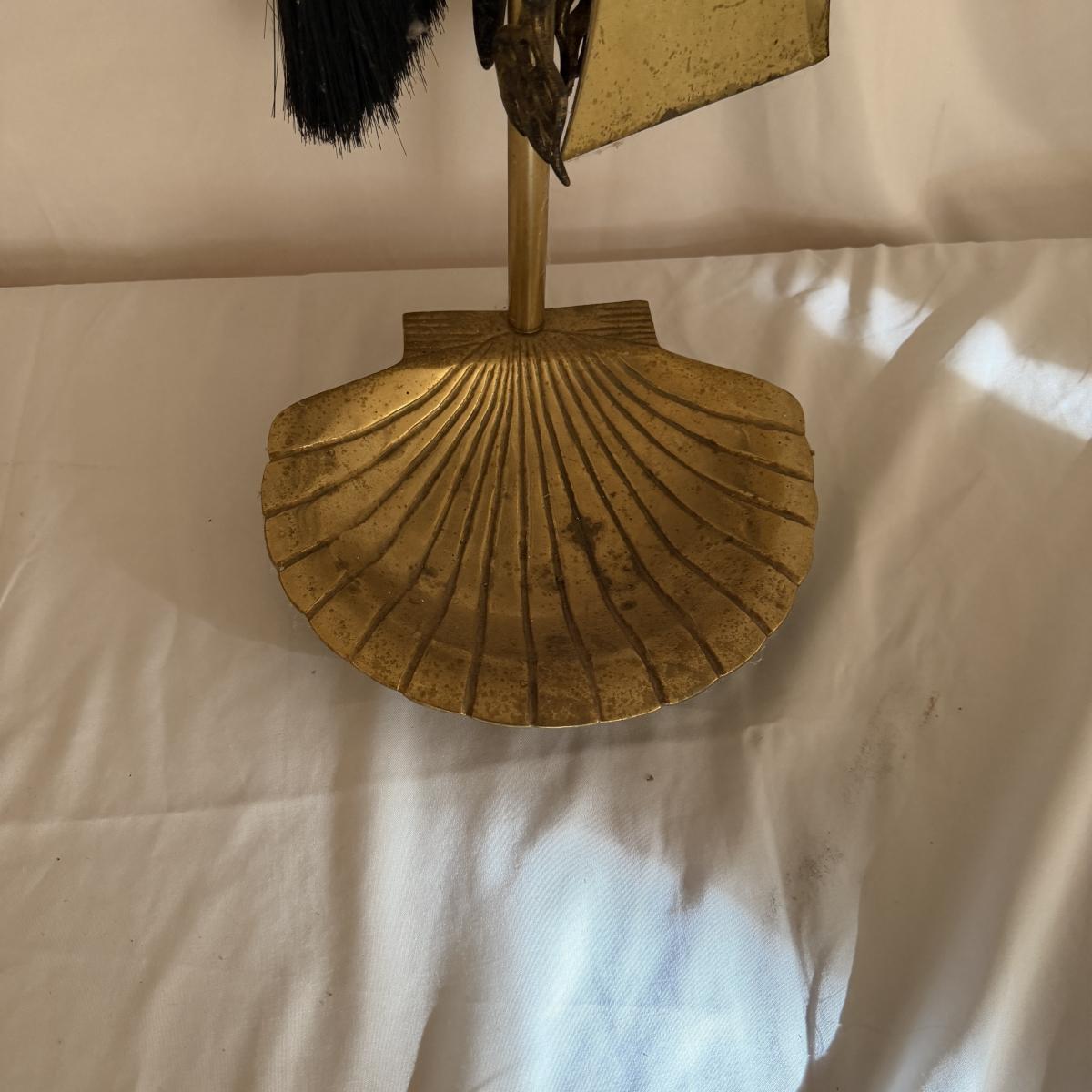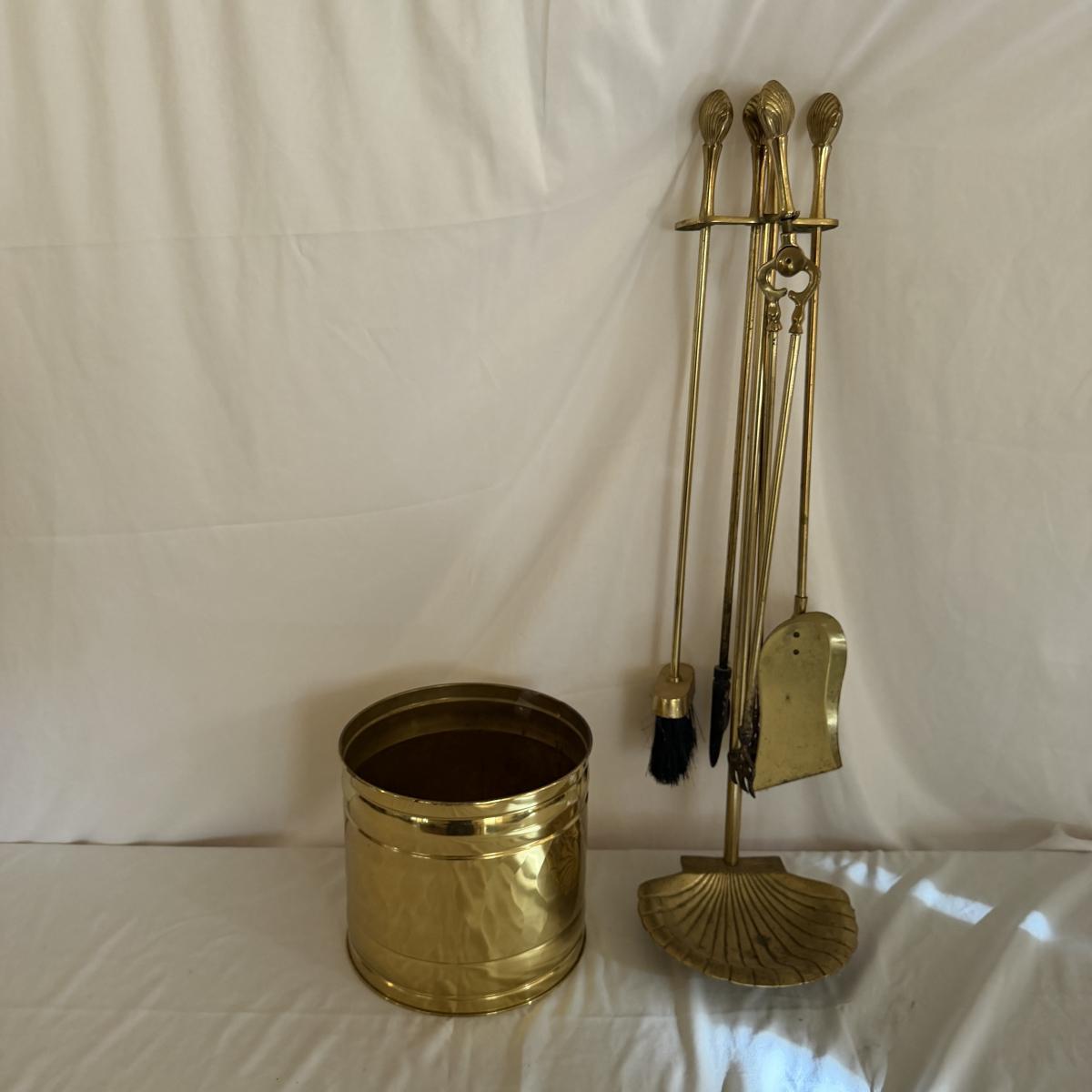 Lot contains a brass fireplace set that includes stand, broom, shovel, poker, pinchers and bucket. Set measures 11” x 9” x 34”H.