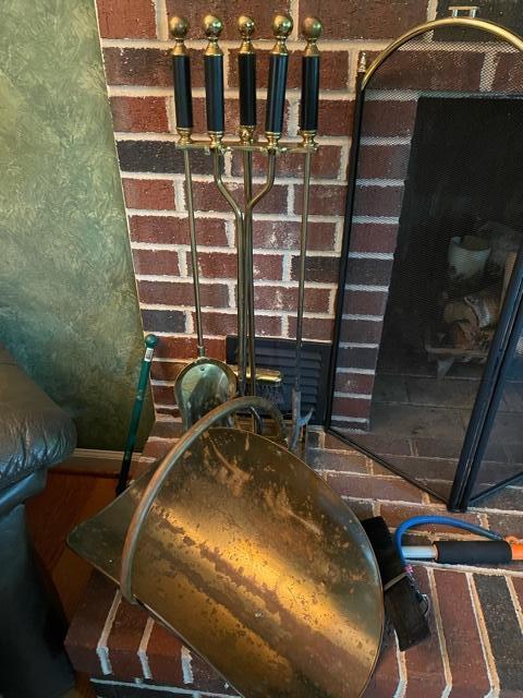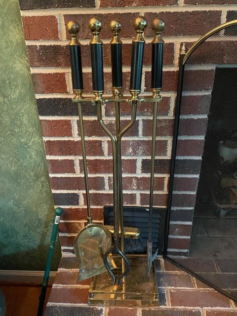 Brass Fireplace Tools, Stand and Wood Carrier Set