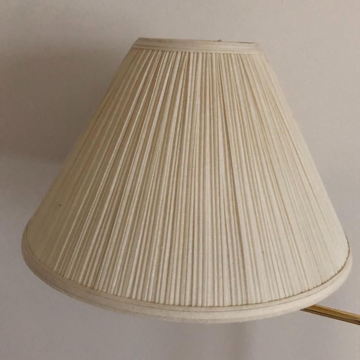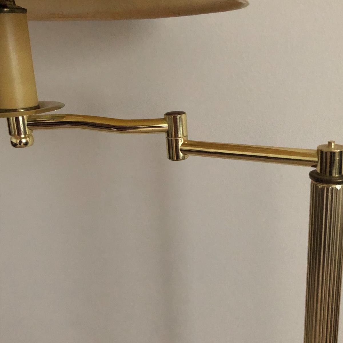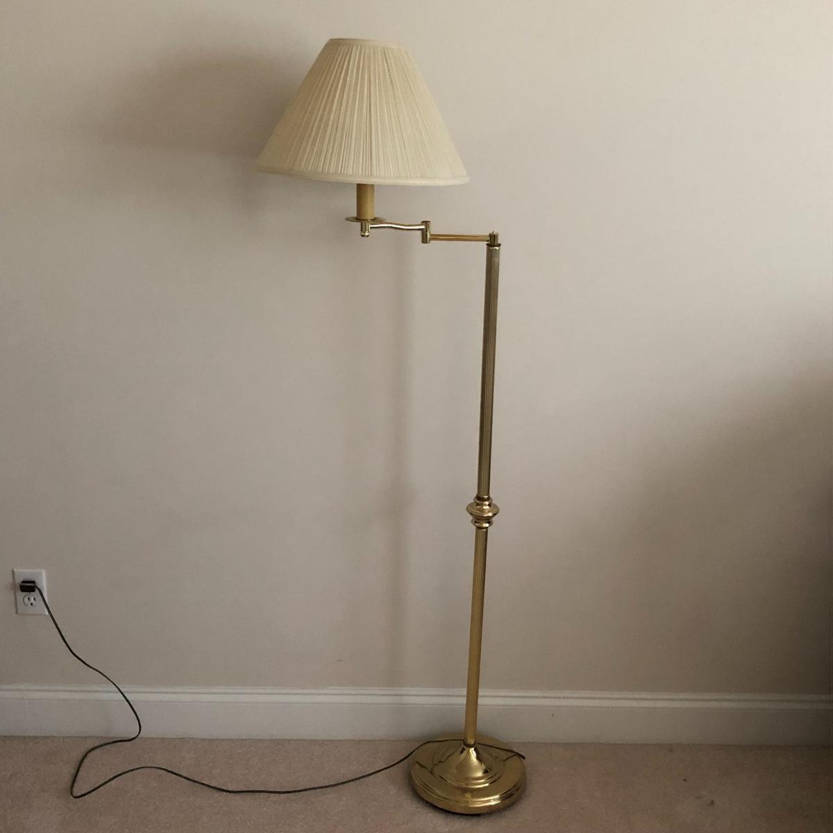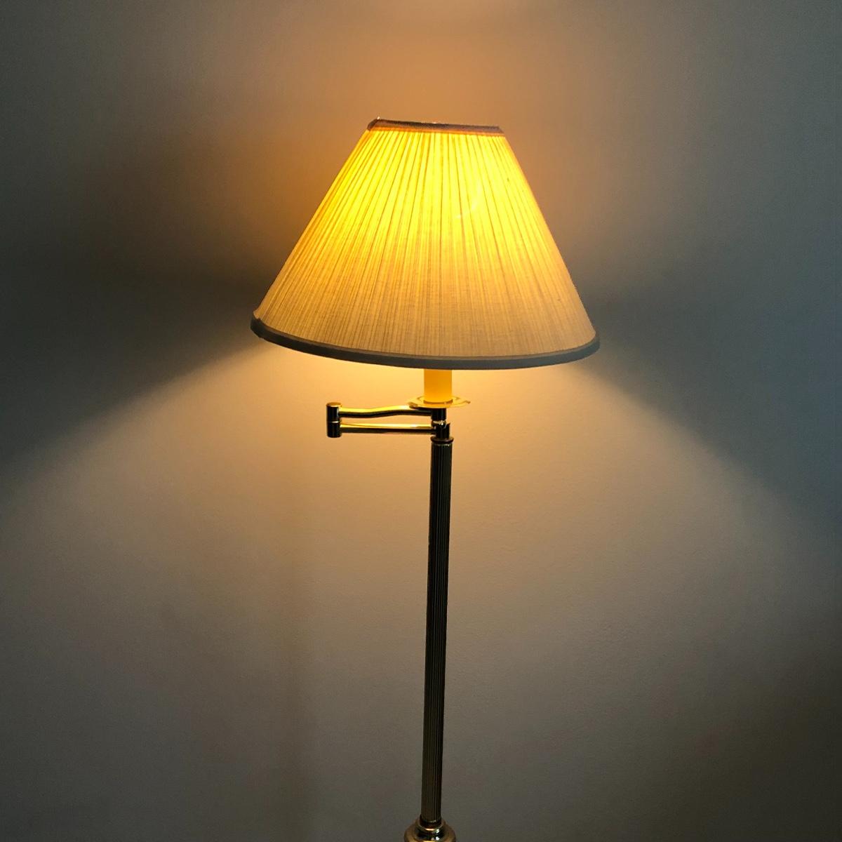 This brass colored floor lamp is in great shape and conveniently extends out if needed. Shade is an ivory color.