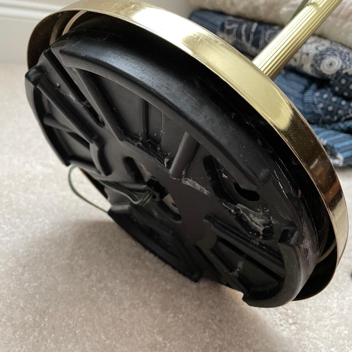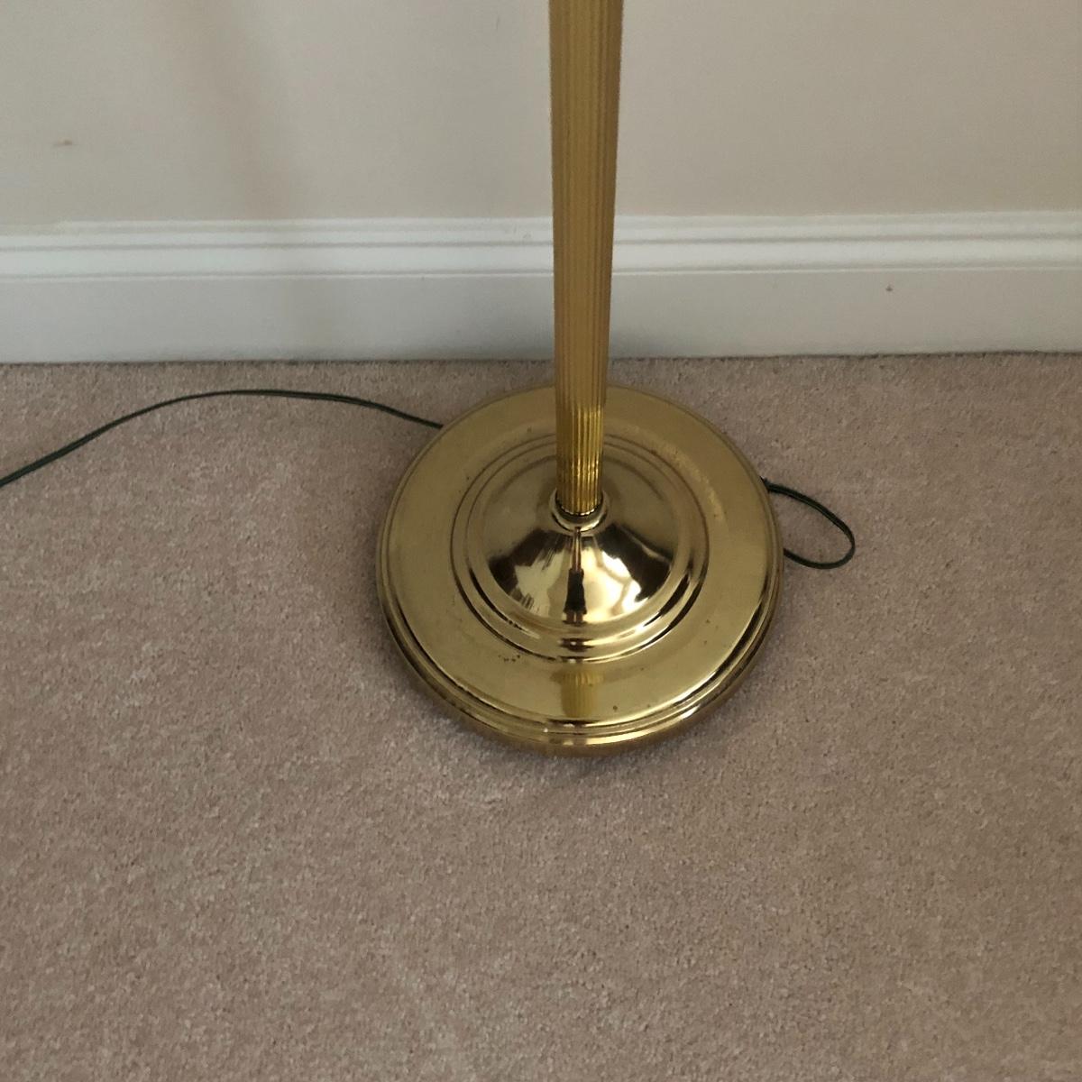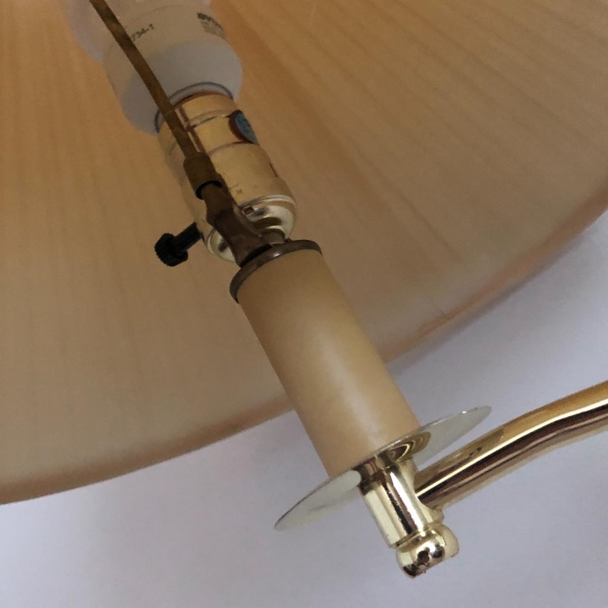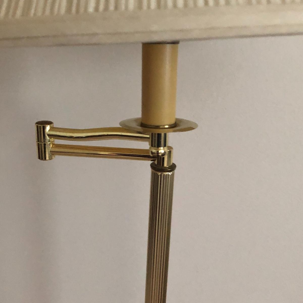 This brass colored floor lamp is in great shape and conveniently extends out if needed. Shade is an ivory color.