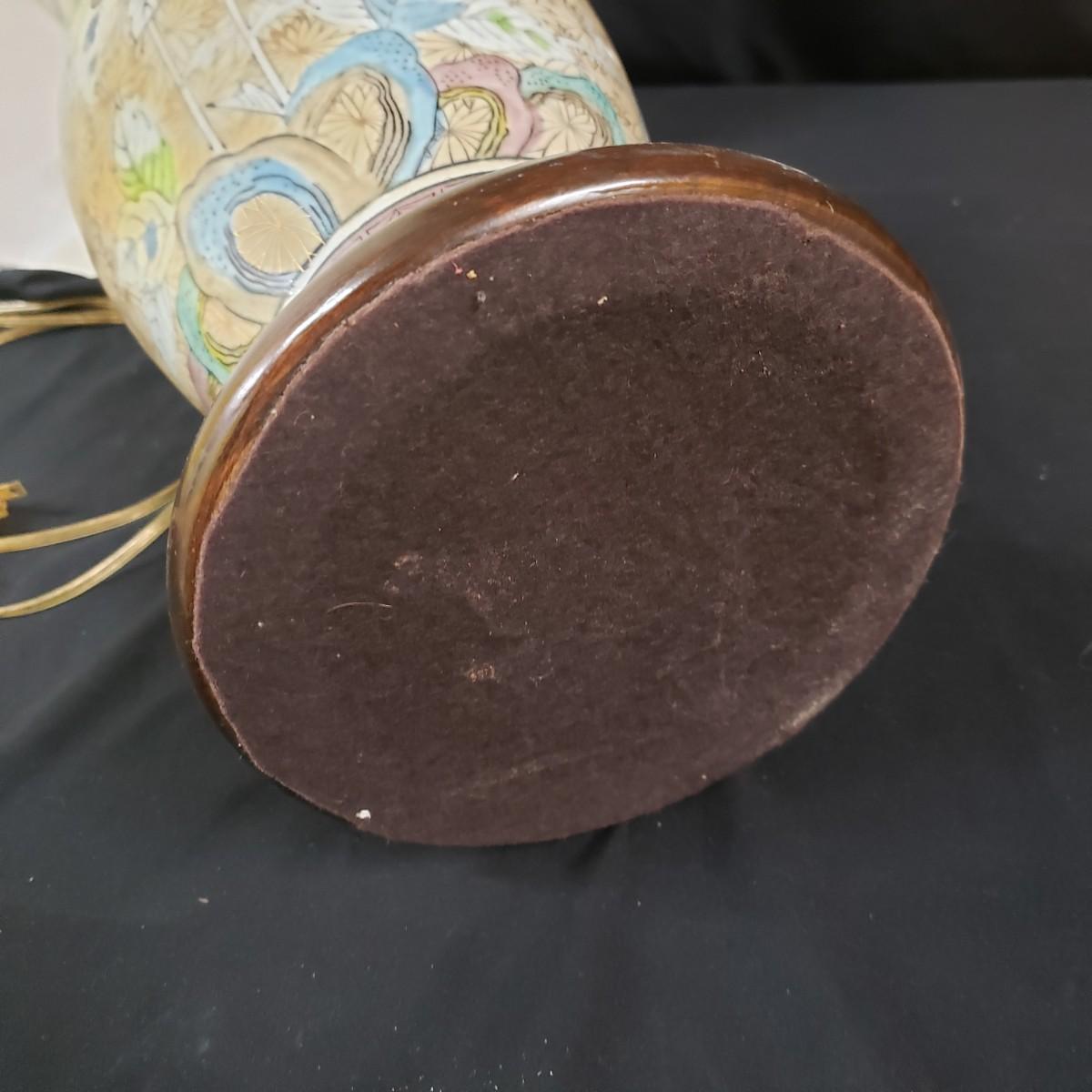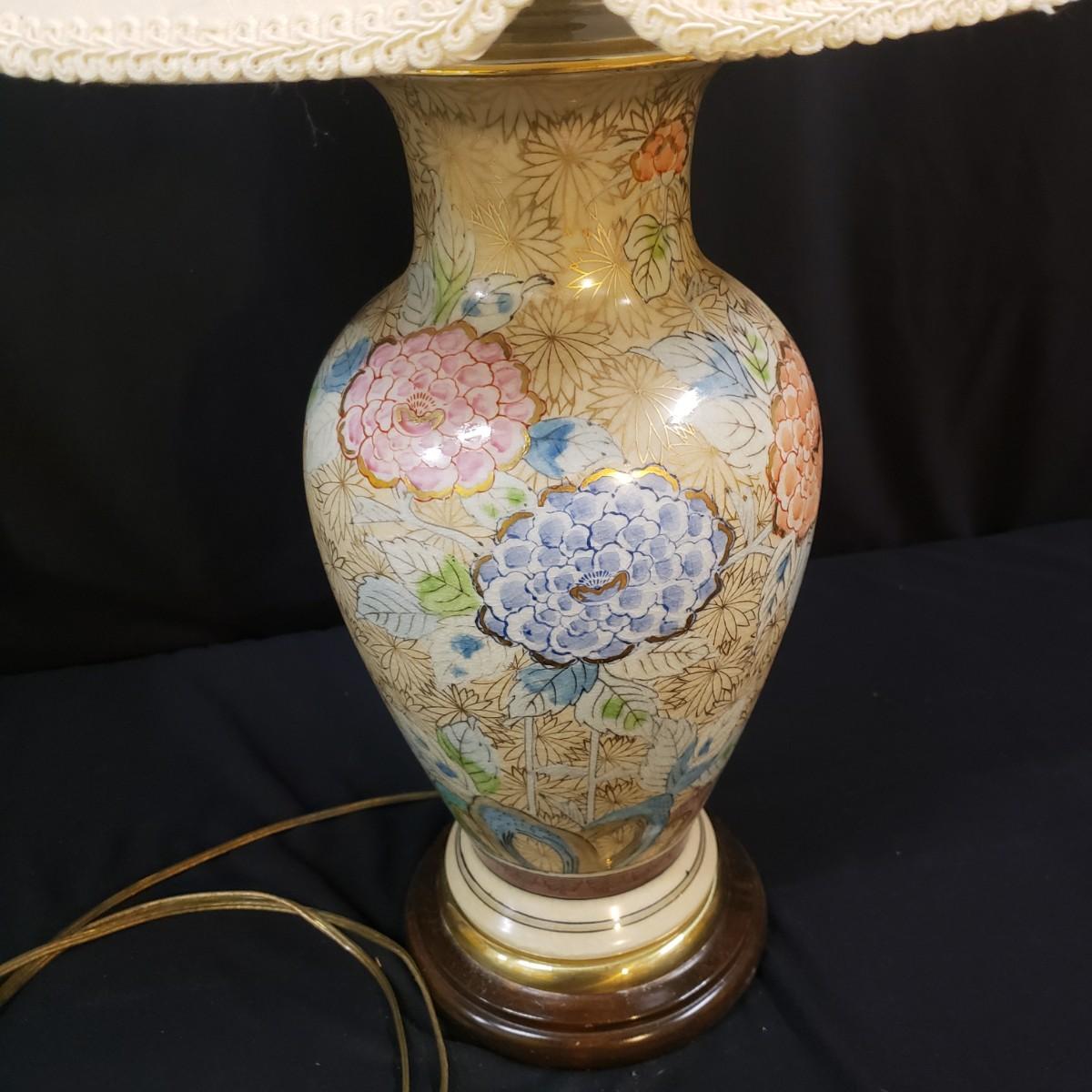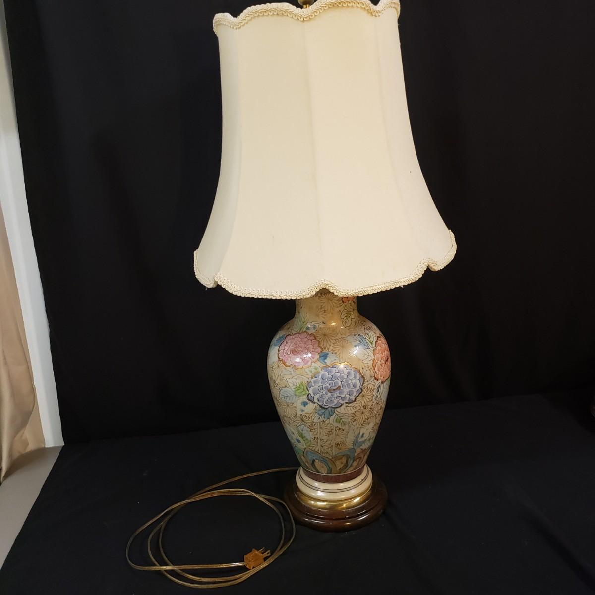 This lamp measures 7"x32" with the shade on. The shade itself measures 14"x5". The wooden base has a brass rim and the porcelain piece has a floral design with gold highlights. The lamp worked when plugged in and appears to be in good condition.