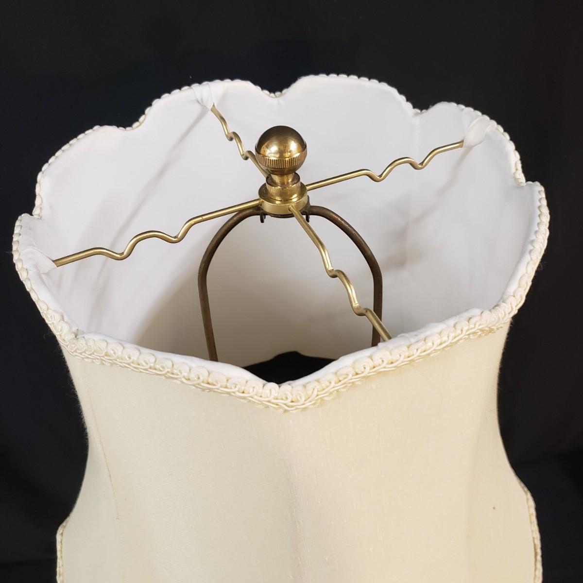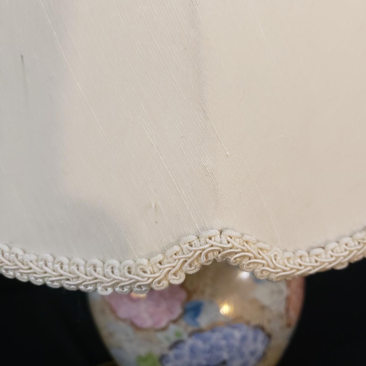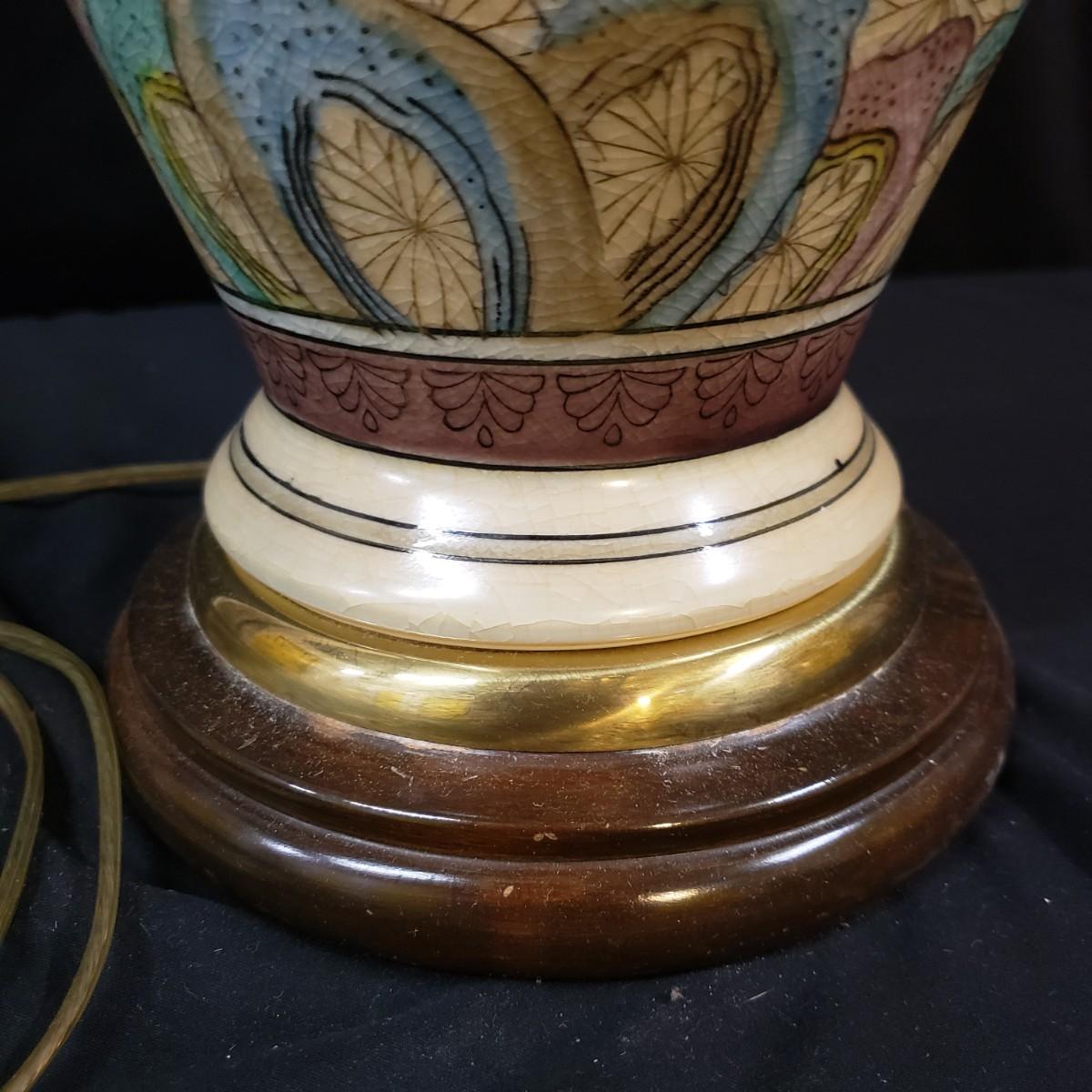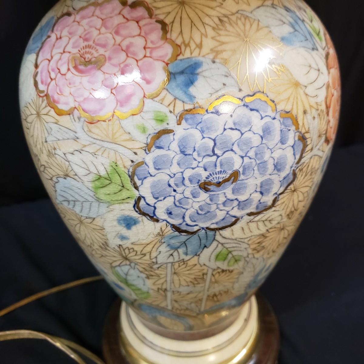 This lamp measures 7"x32" with the shade on. The shade itself measures 14"x5". The wooden base has a brass rim and the porcelain piece has a floral design with gold highlights. The lamp worked when plugged in and appears to be in good condition.