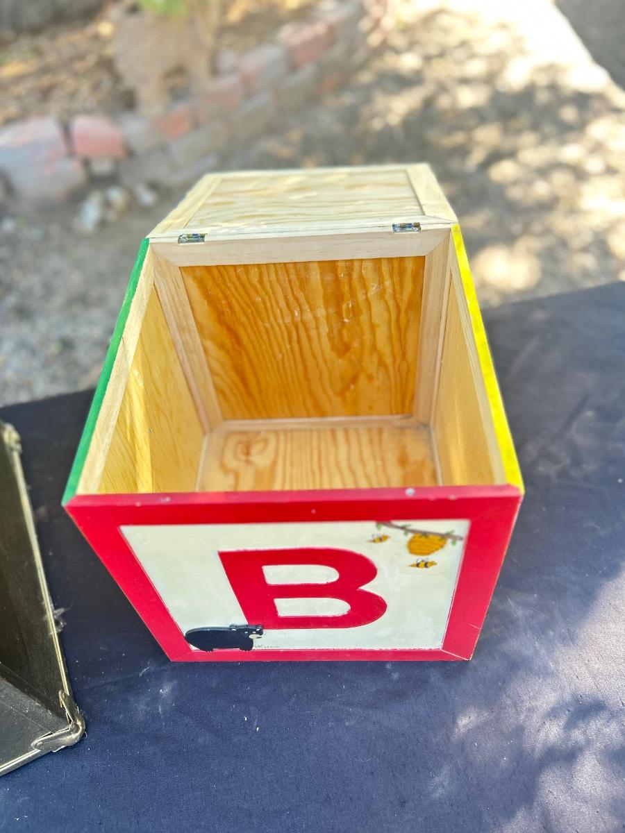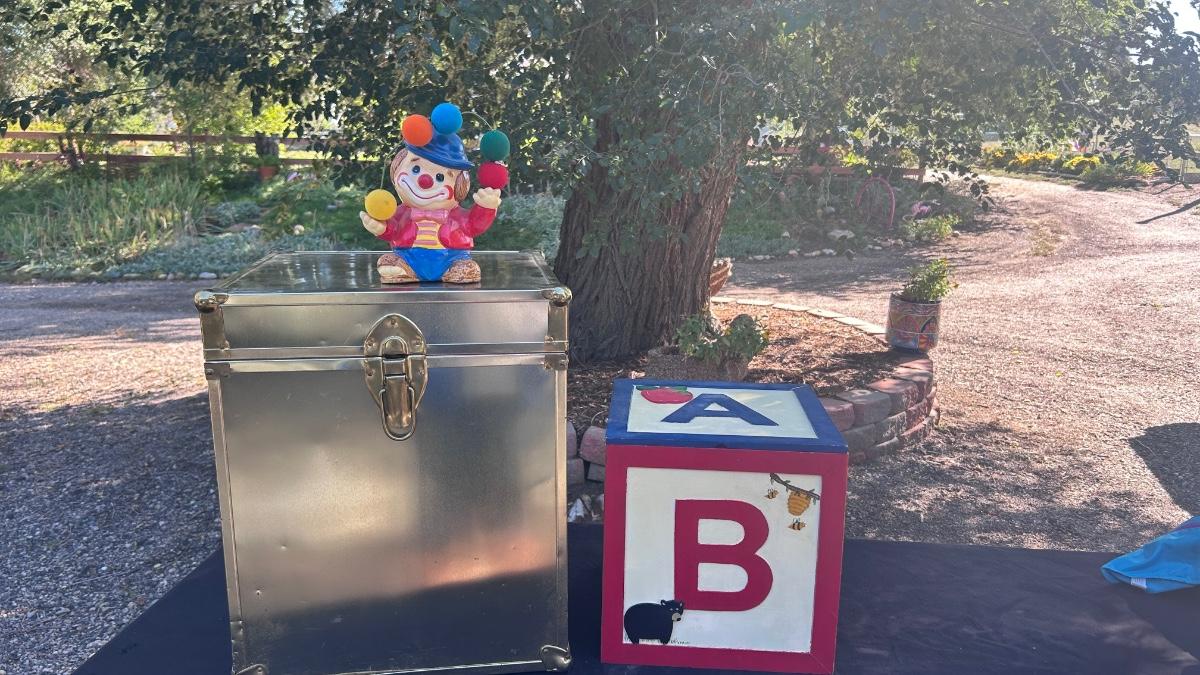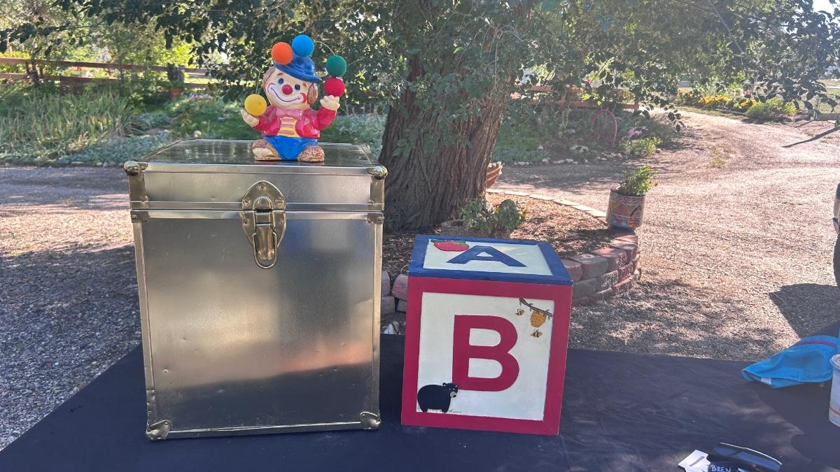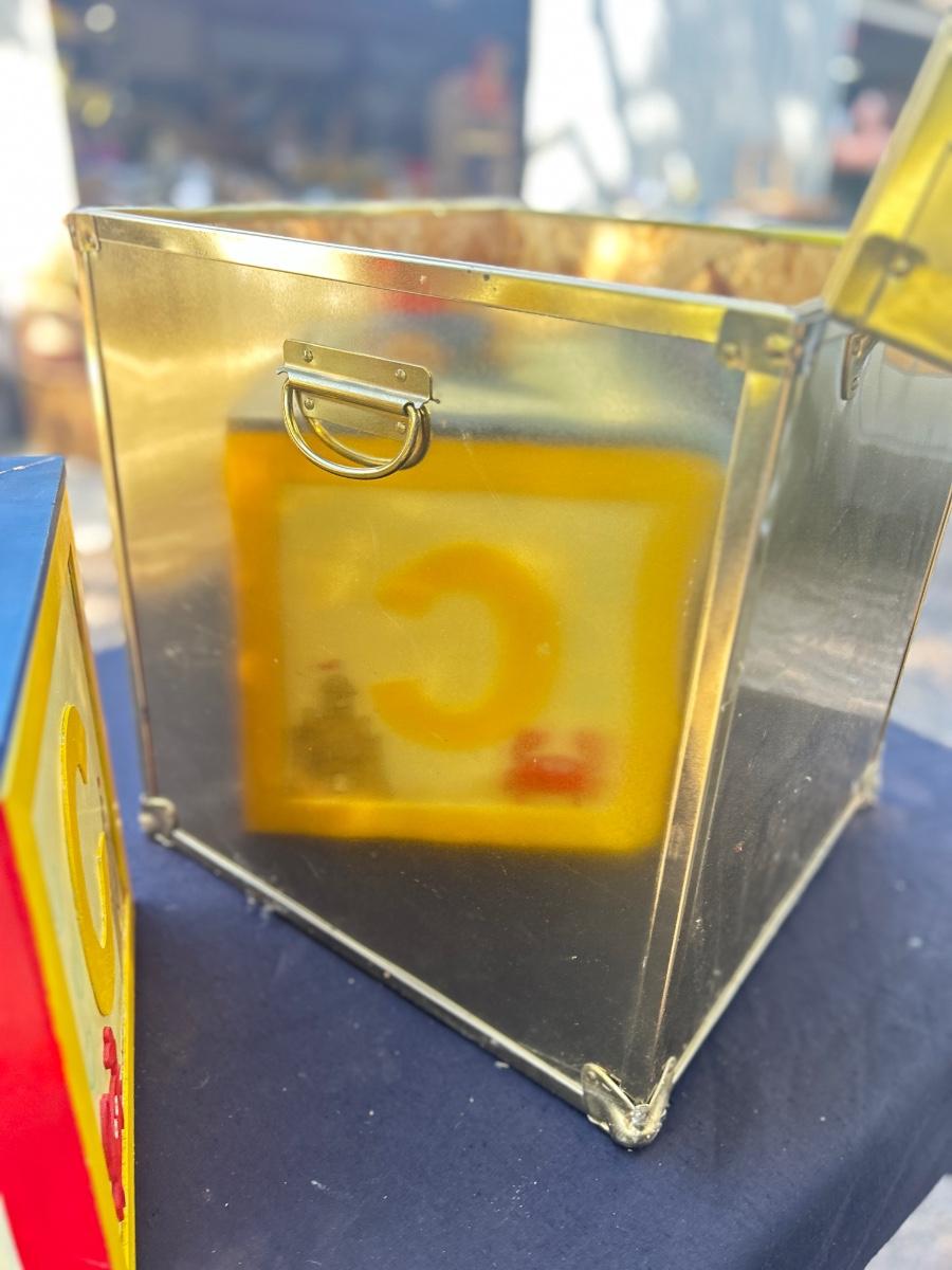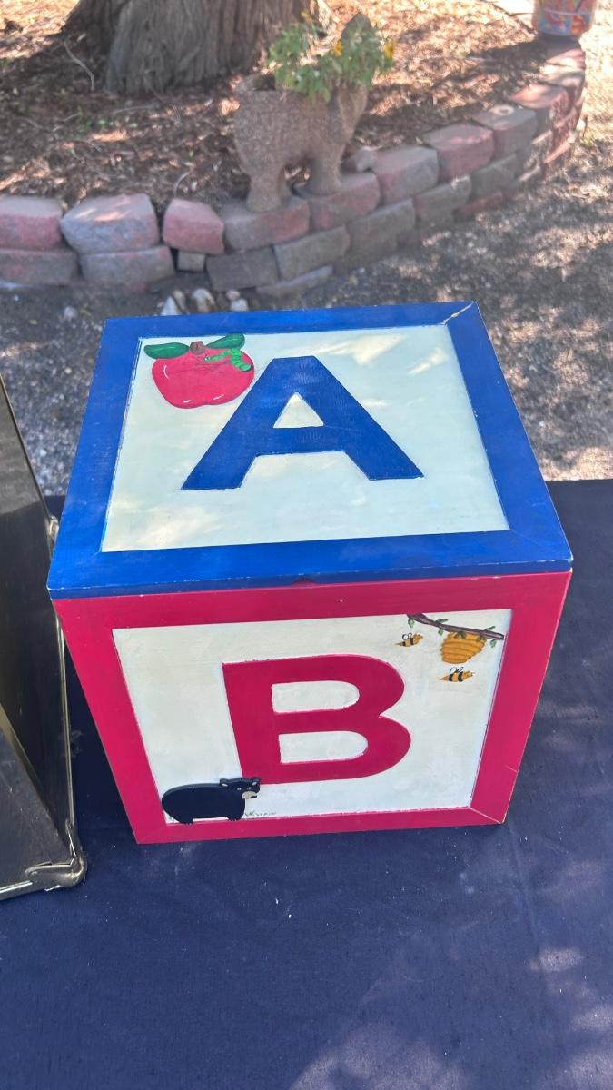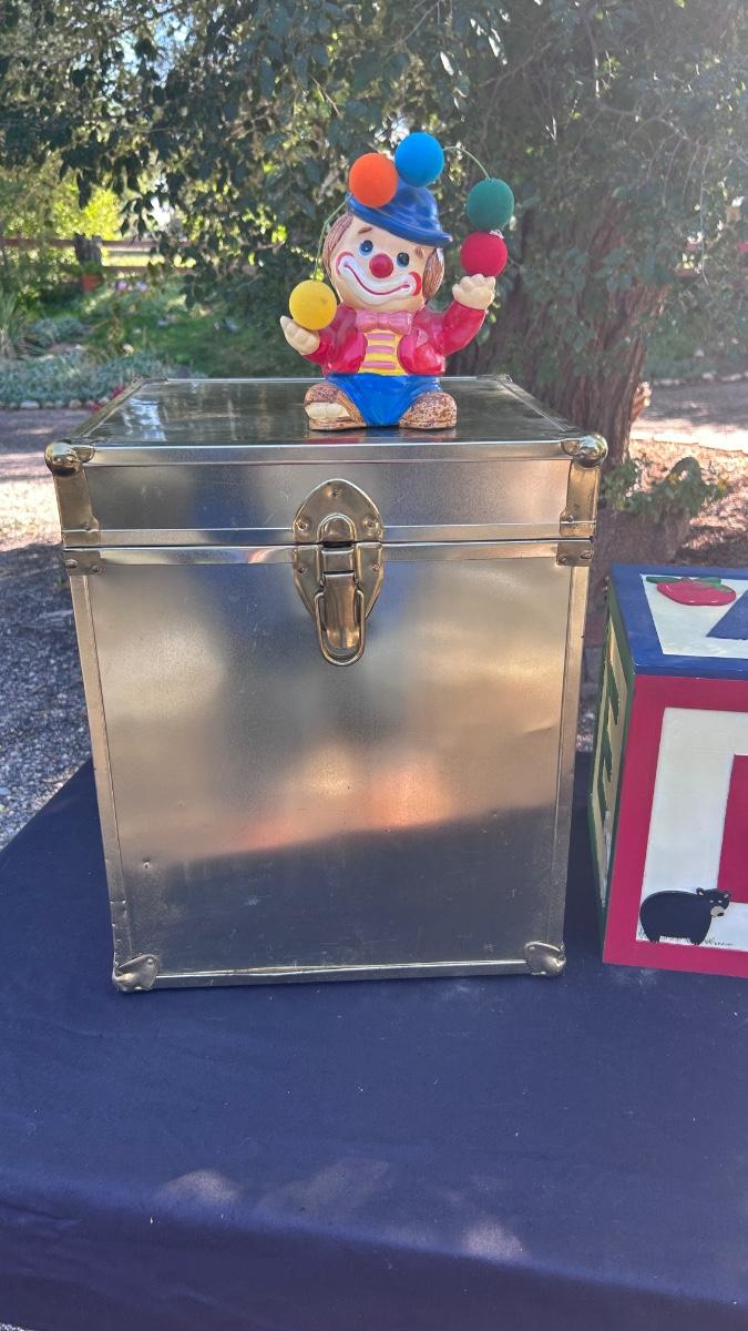 BRASS COLORED CUBE TRUNK, ABC BLOCK BOX AND CLOWN BANK