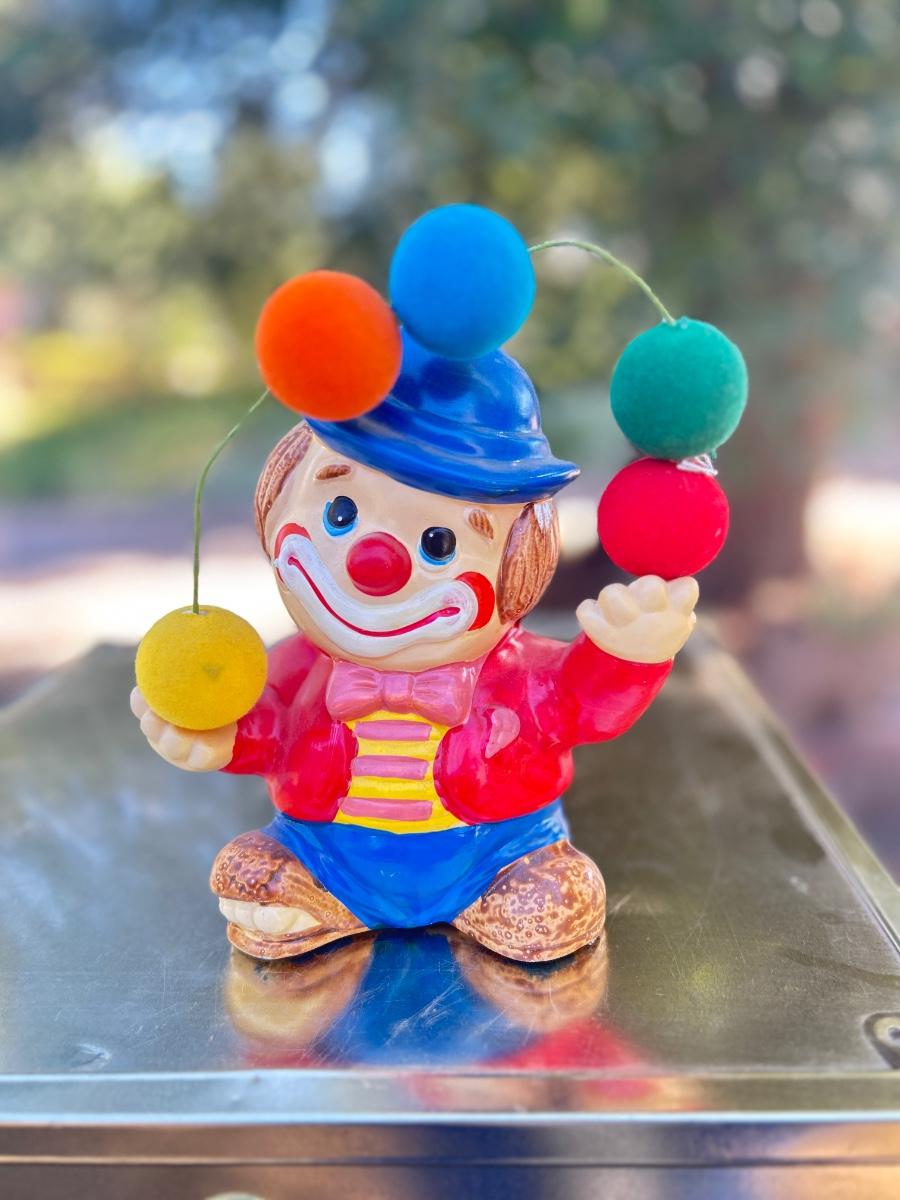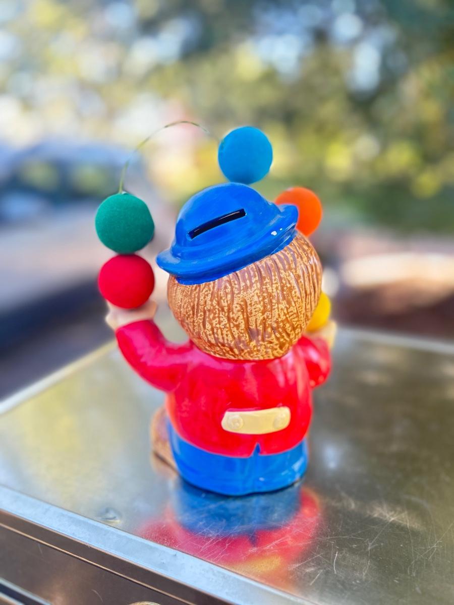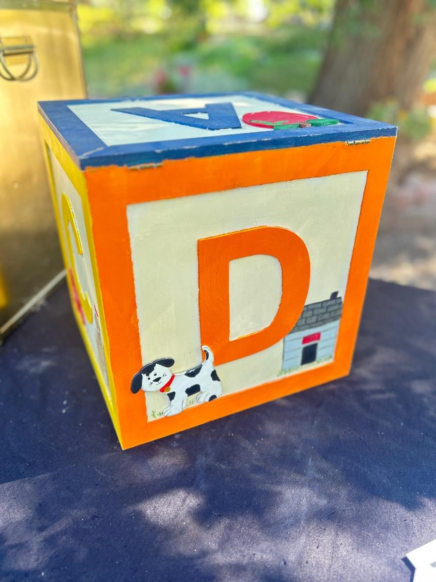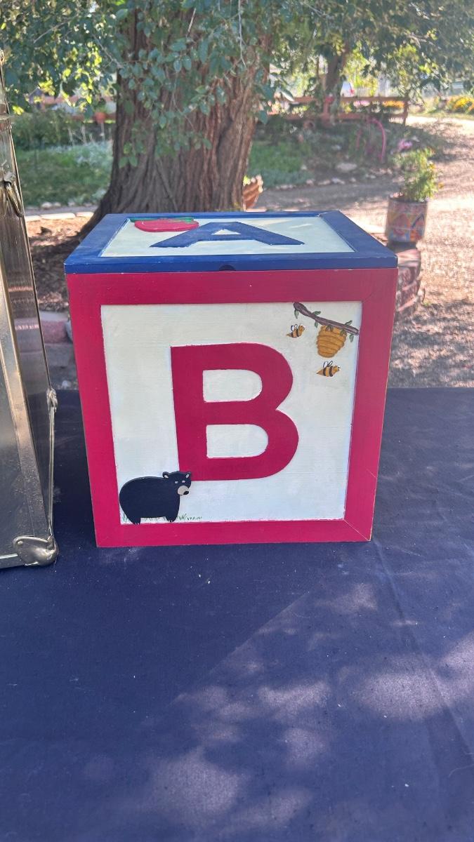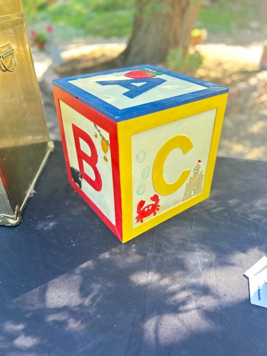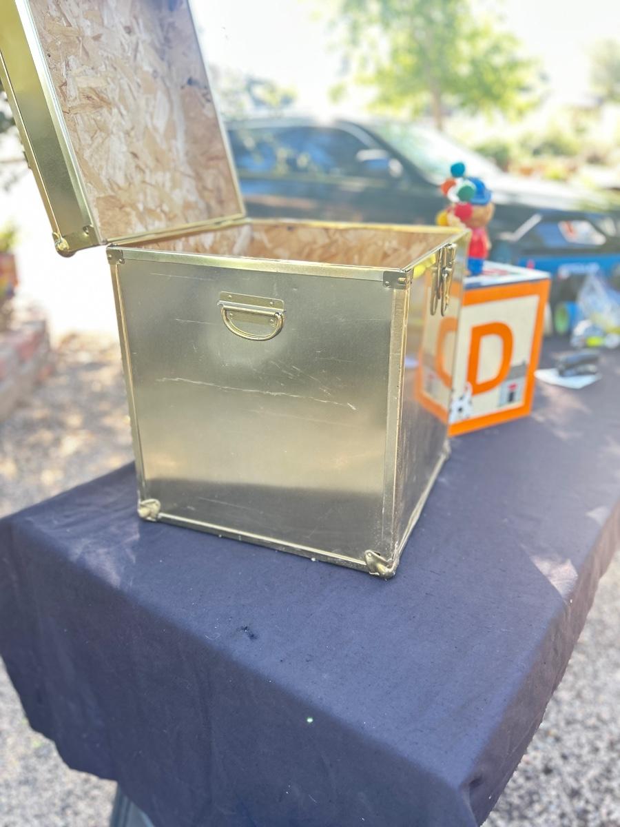 BRASS COLORED CUBE TRUNK, ABC BLOCK BOX AND CLOWN BANK