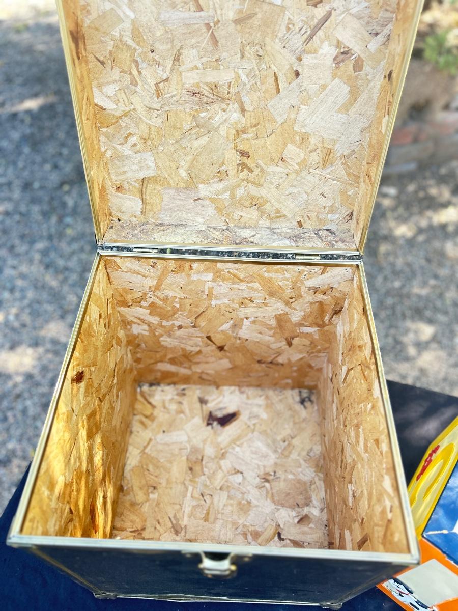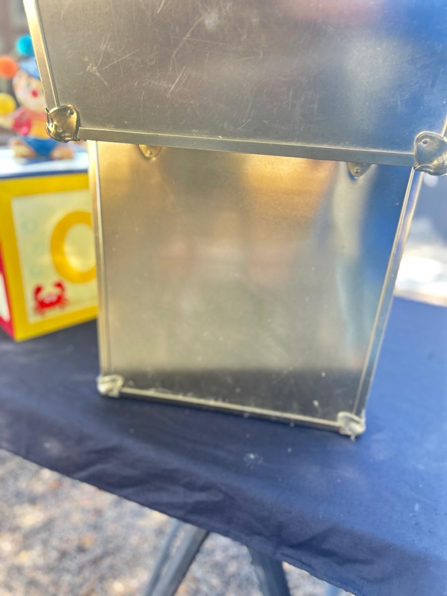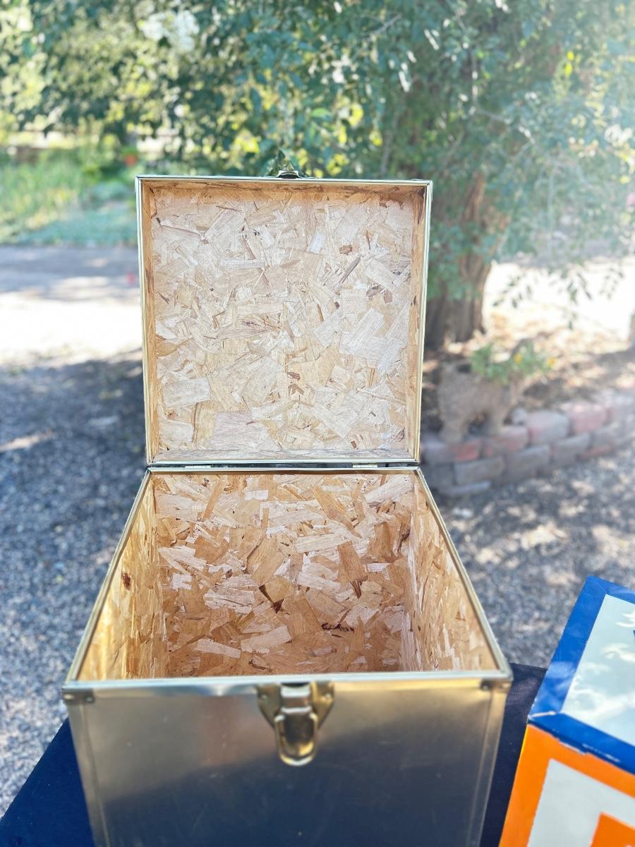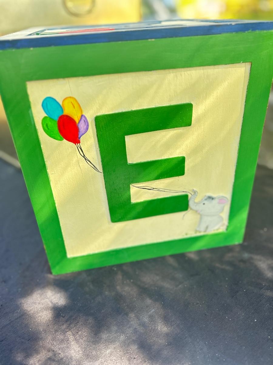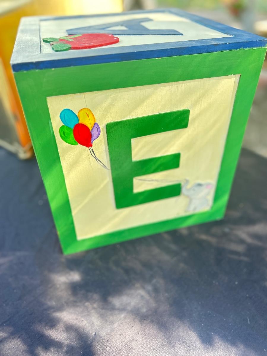 BRASS COLORED CUBE TRUNK, ABC BLOCK BOX AND CLOWN BANK