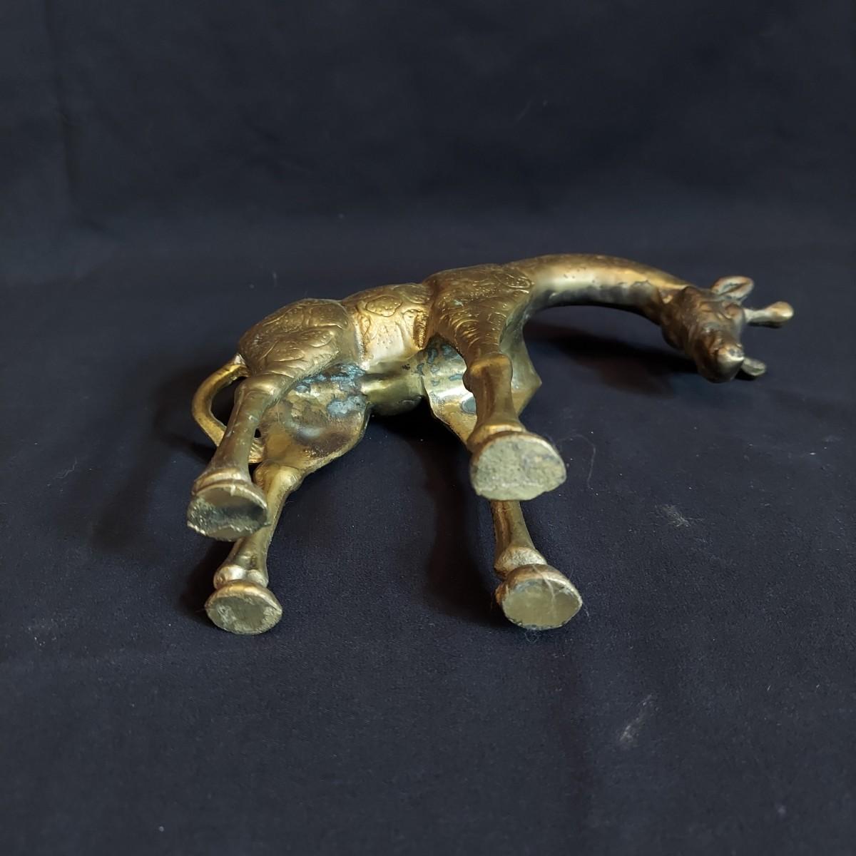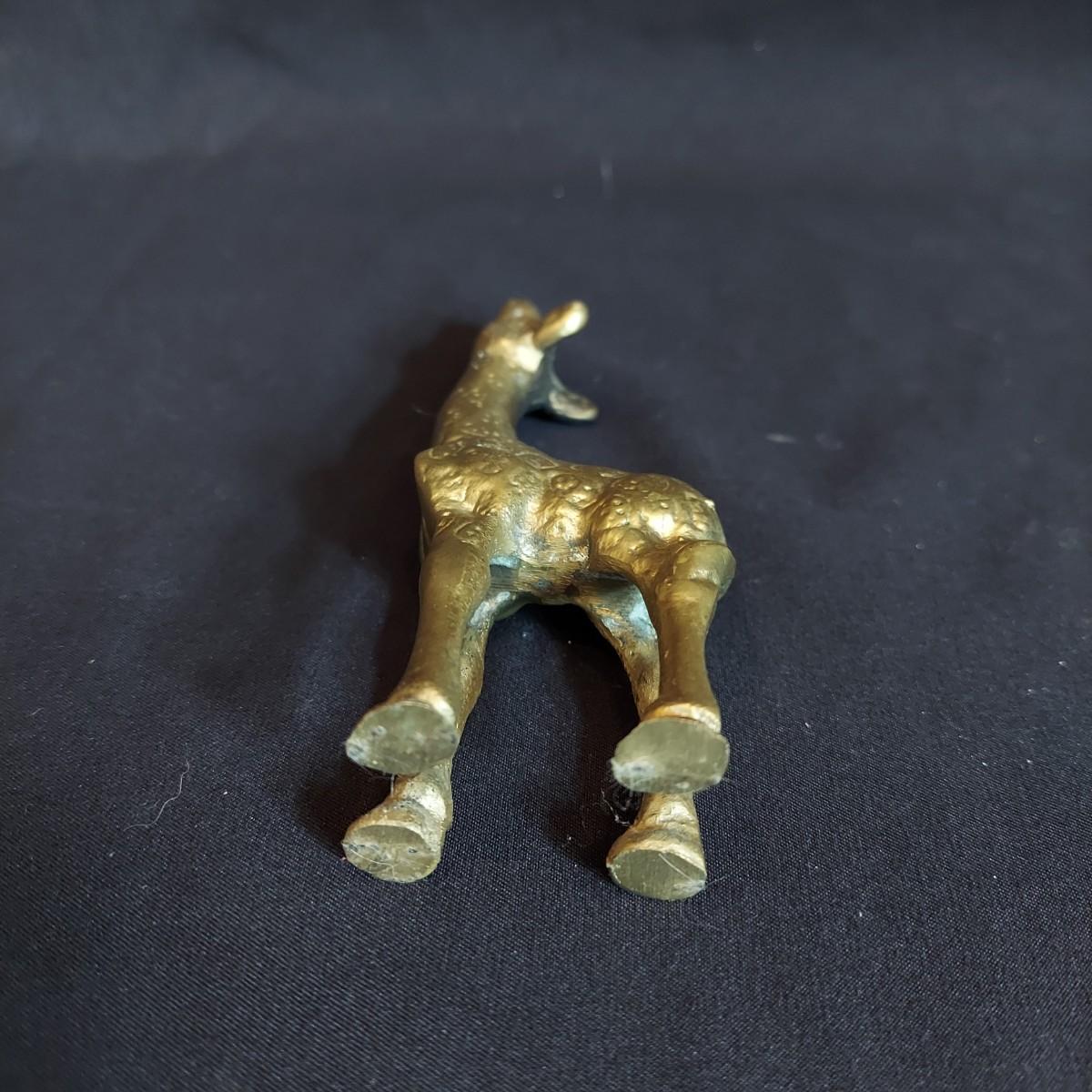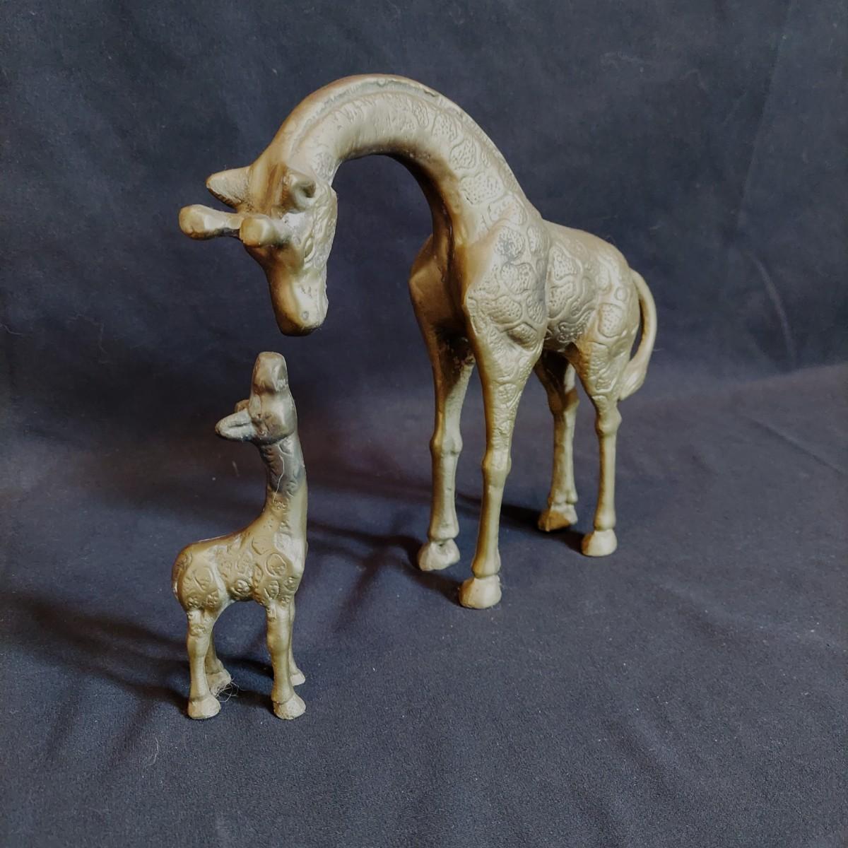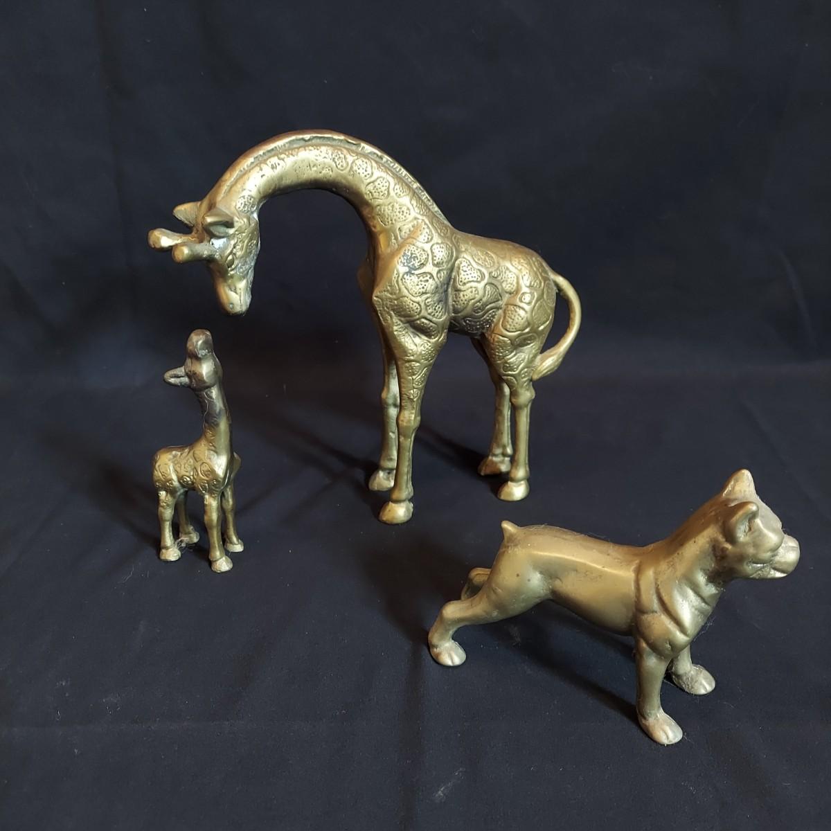 Two unmarked brass giraffe figures. The large one is 8.5" tall and the small one is 5" tall. There is also a brass Boxer dog that is 4.5" long and 4" tall. Shipping available. Shipping certain items can be costly. We suggest contacting our preferred local shipping provider, Postage Express, with dimensions and getting an estimate before bidding: (828) 670-5501 or postageexpress@yahoo.com.
