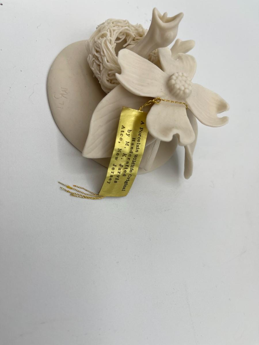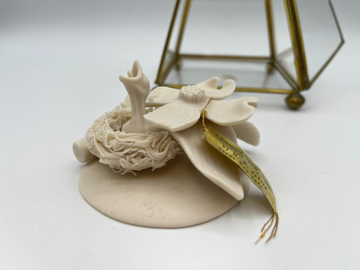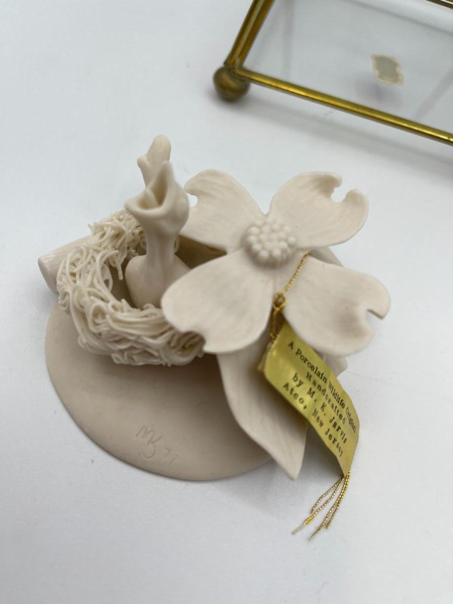 Brass and glass display box / trinket box with small procelain figure inside. Box is 5 1/2' x 4"; figurine is by MK Jarvis of Atco NJ.