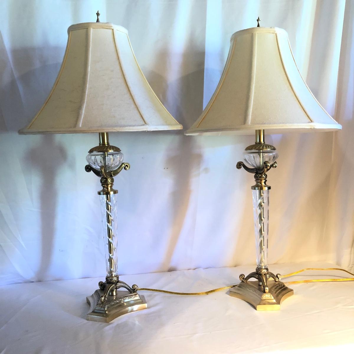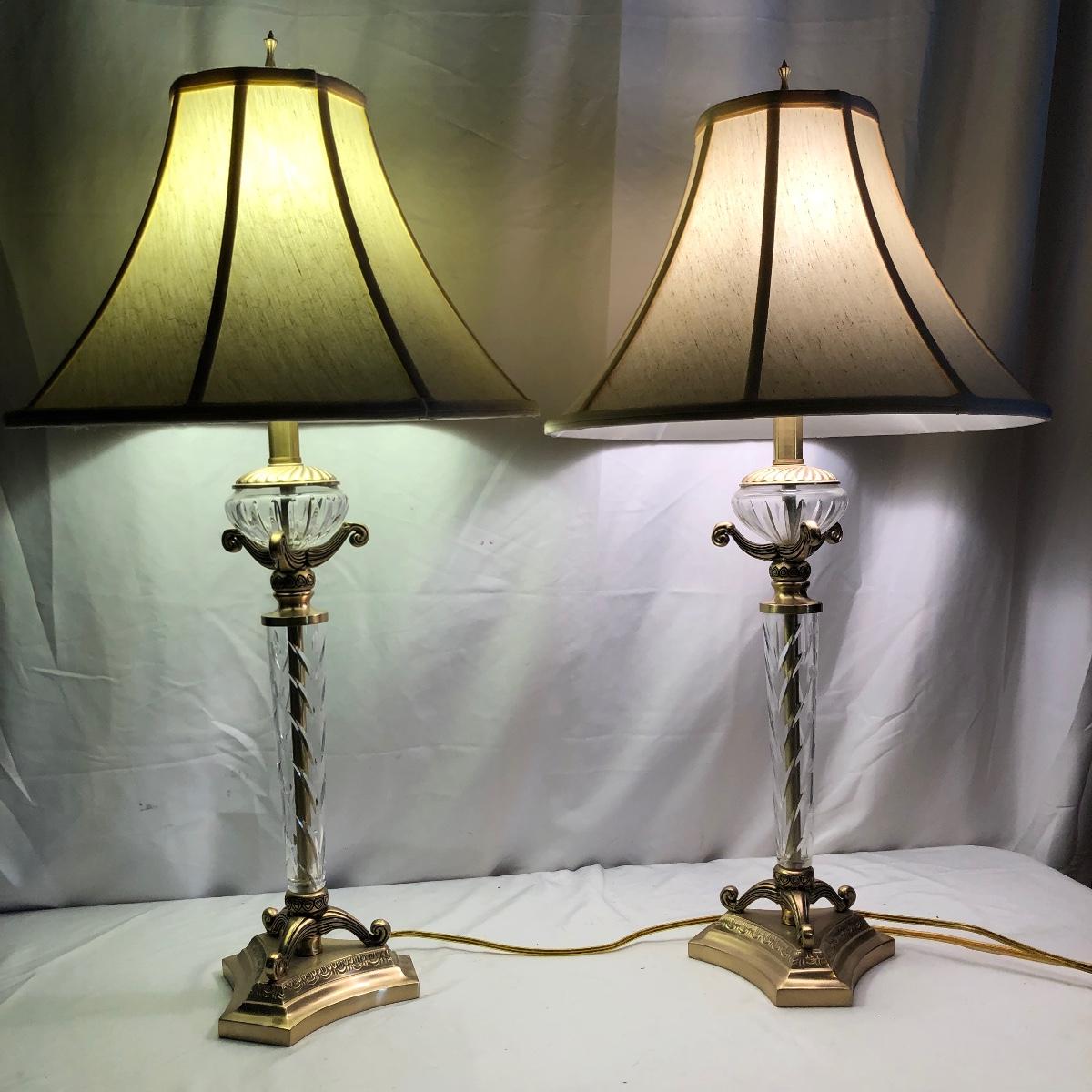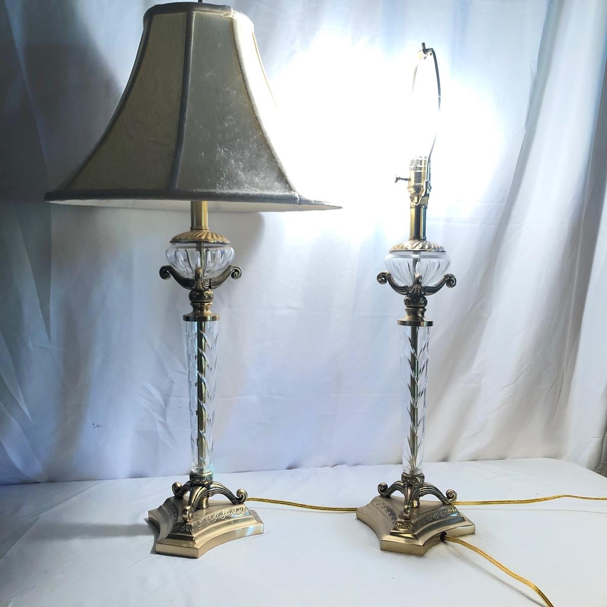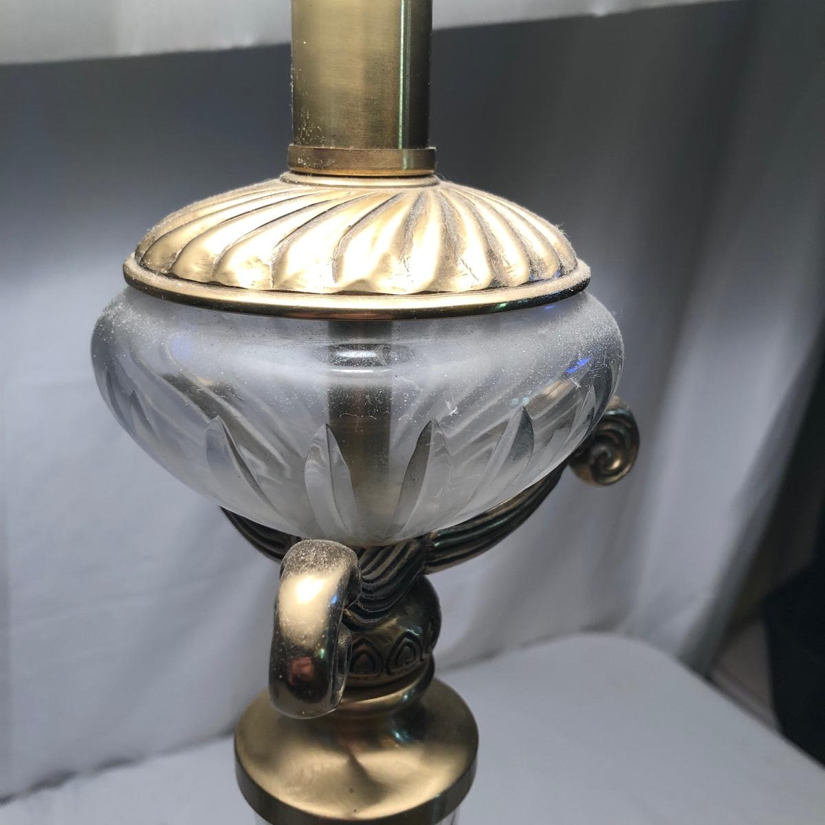 Lot includes pair of brass and glass table lamps. Both lamps worked when tested. Lamp with shade measures 17”D x 33” tall.
