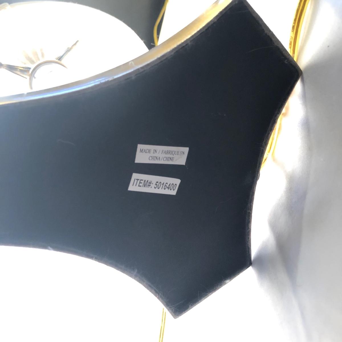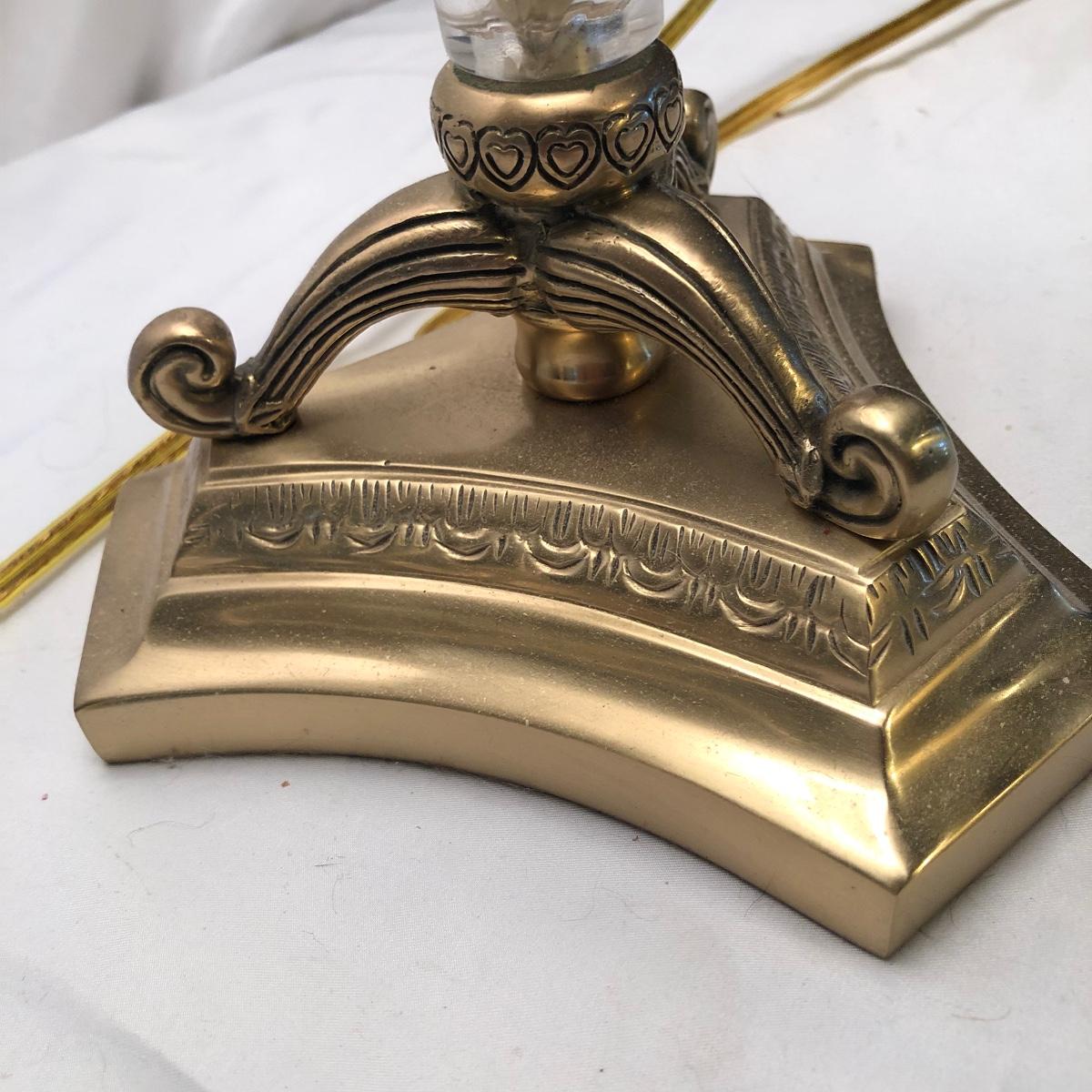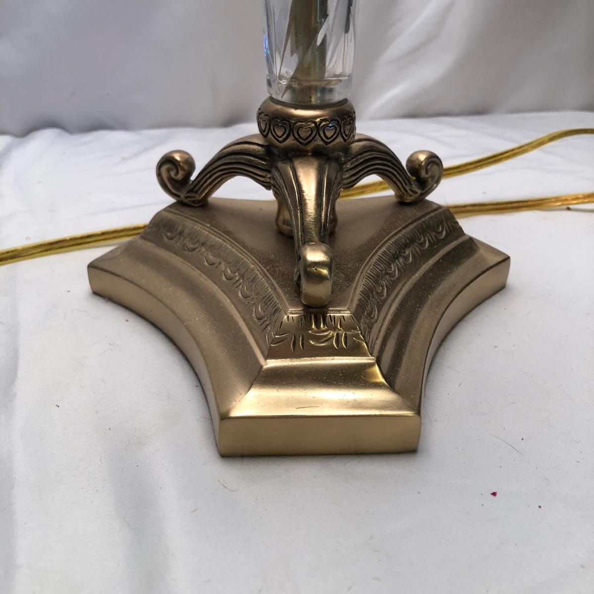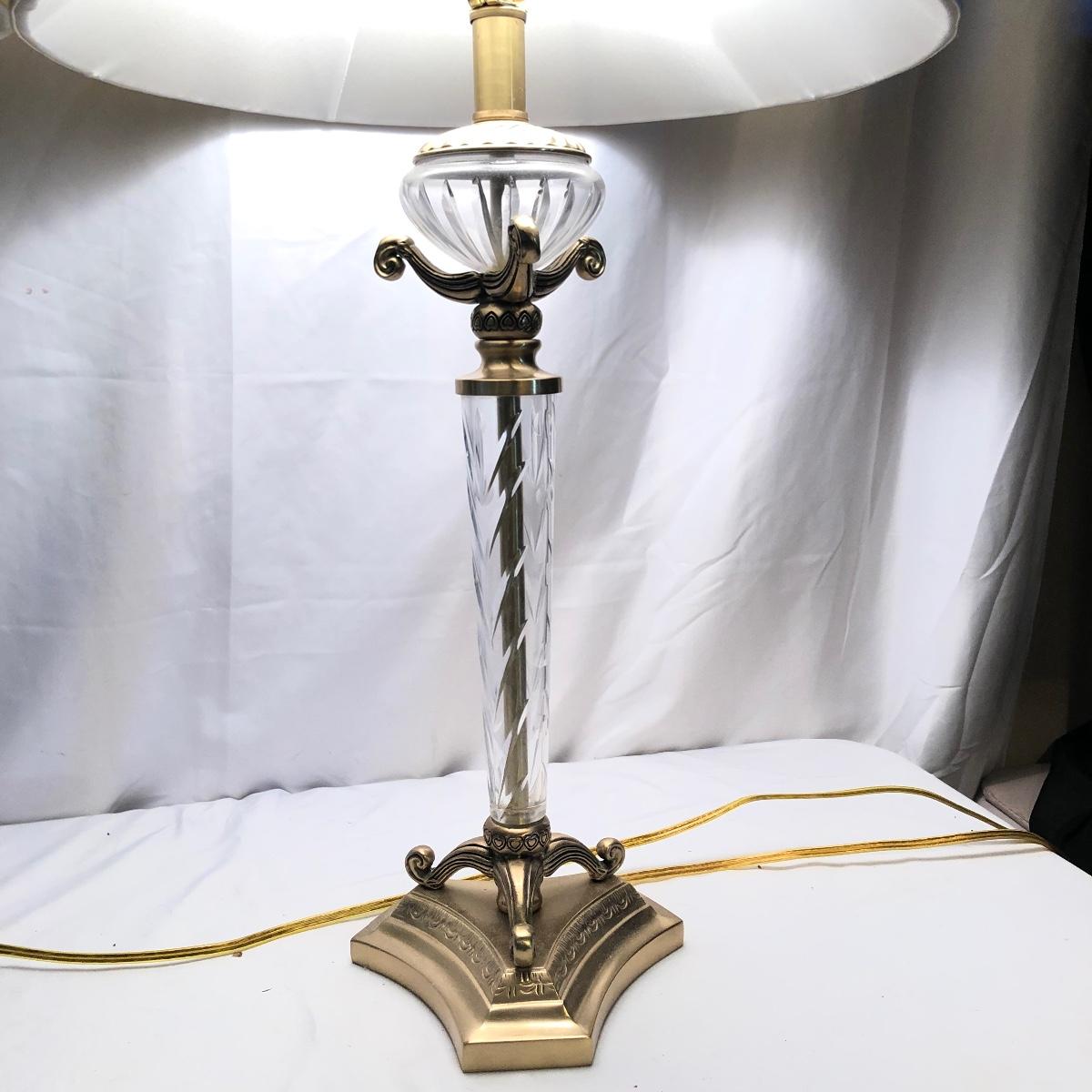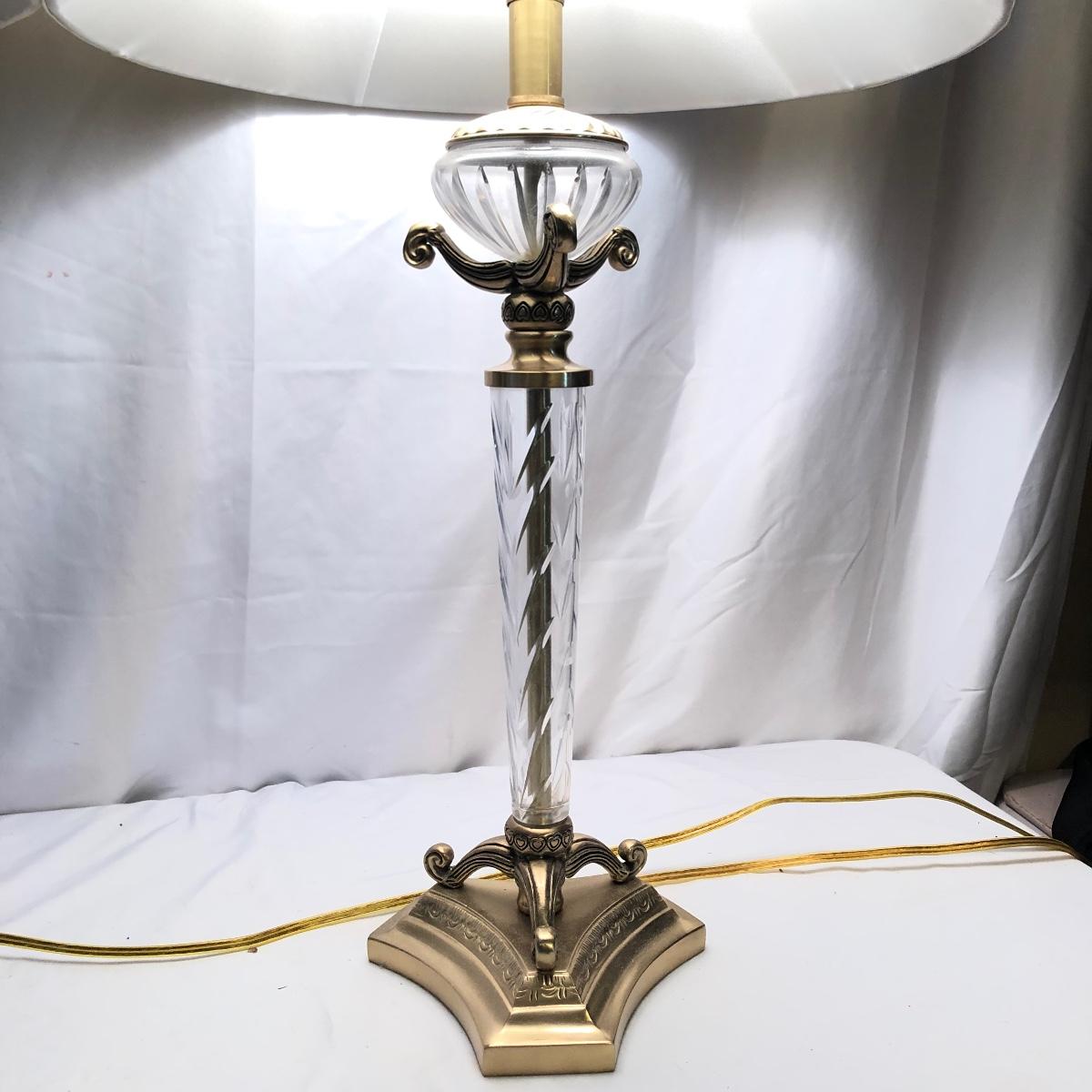 Lot includes pair of brass and glass table lamps. Both lamps worked when tested. Lamp with shade measures 17”D x 33” tall.