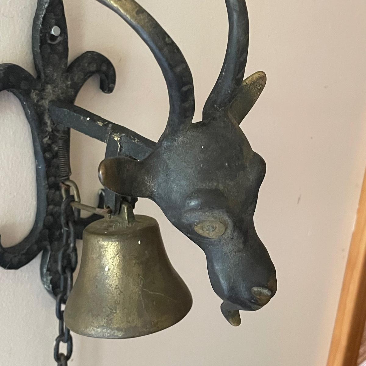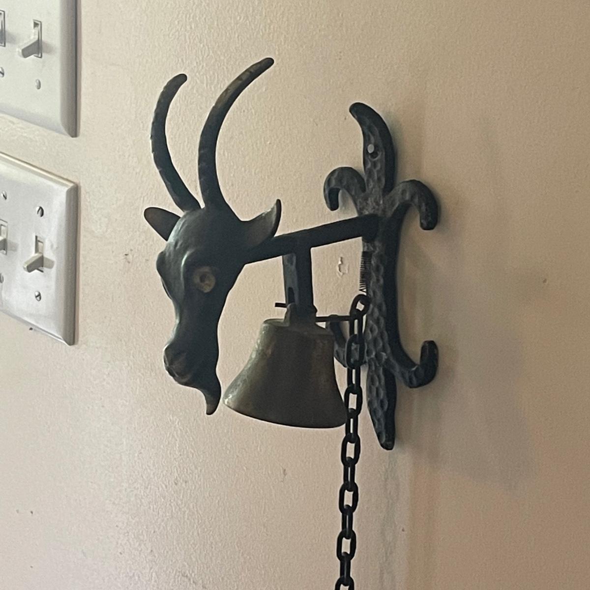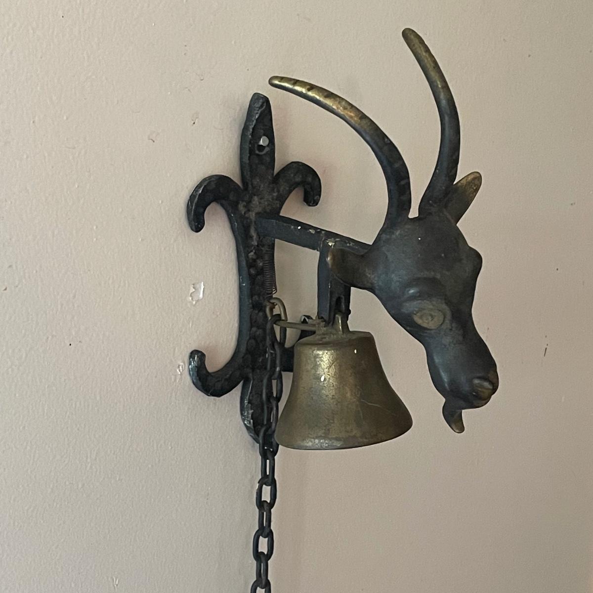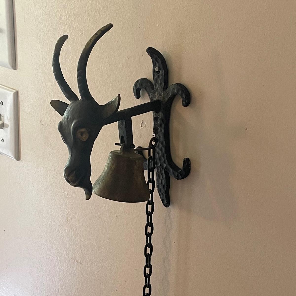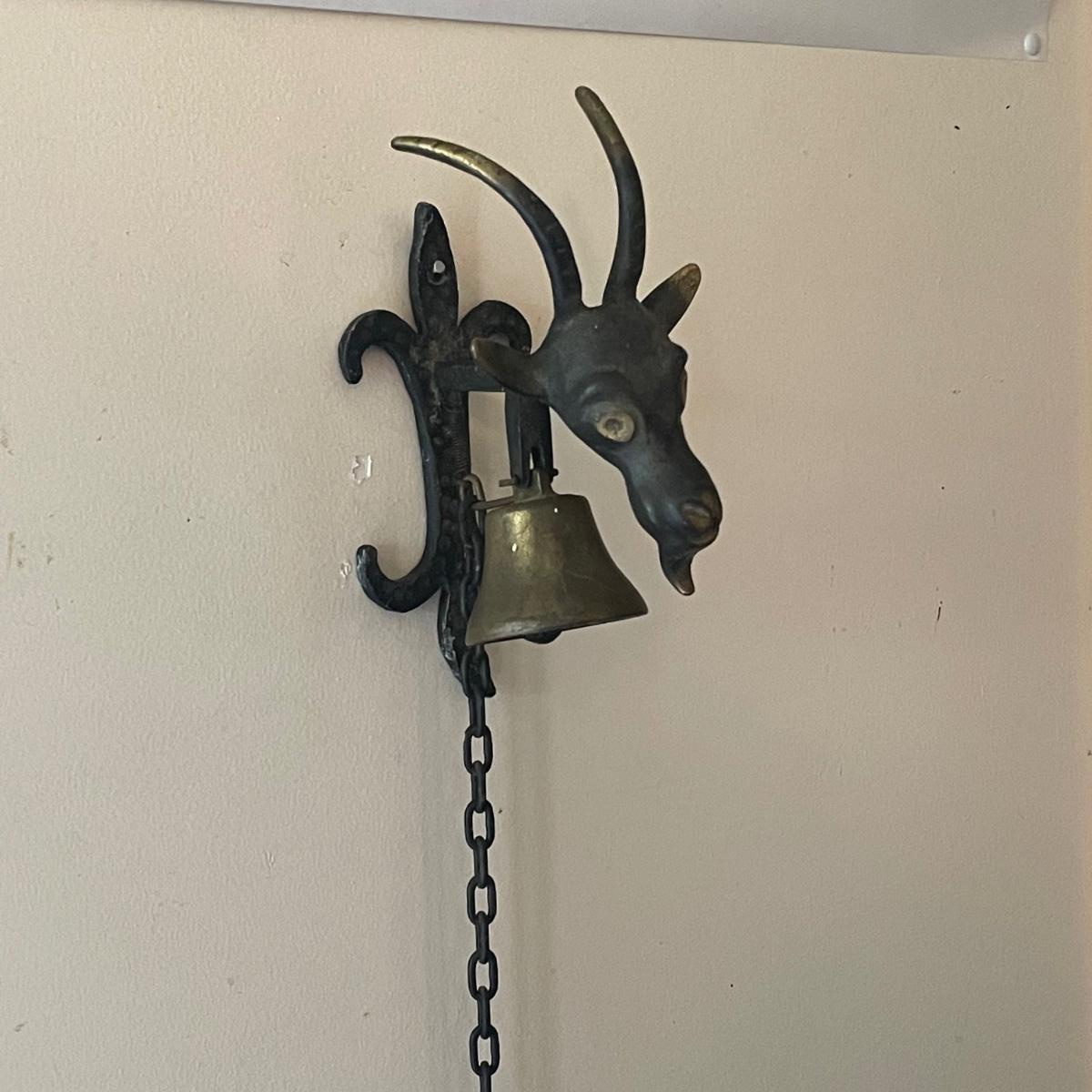 This unique brass goat is designed to hang on the wall, it appears to be a brass head and bell with the rest being steel. It measures 6” x 9” x 4”. Also included are a pair of brass bells on blue/red/white rope.