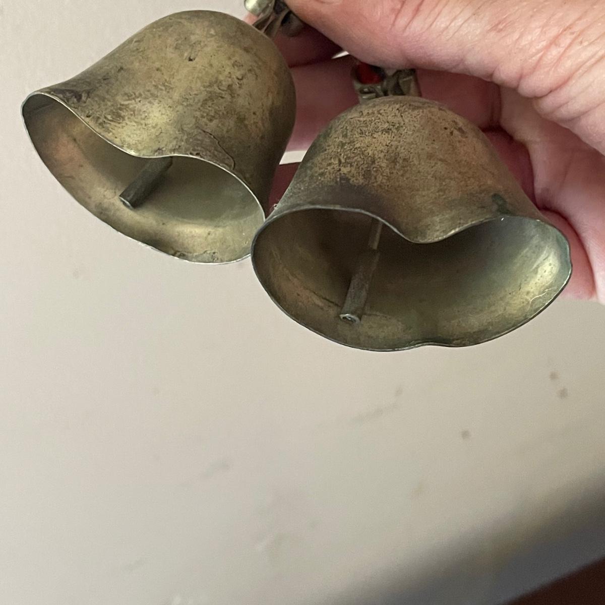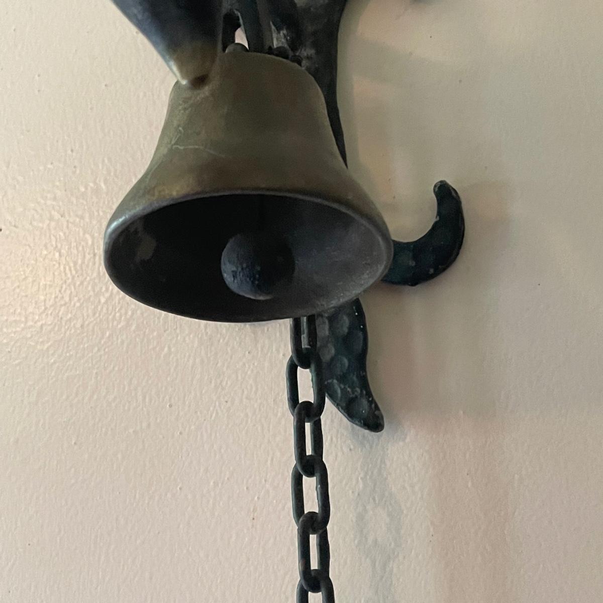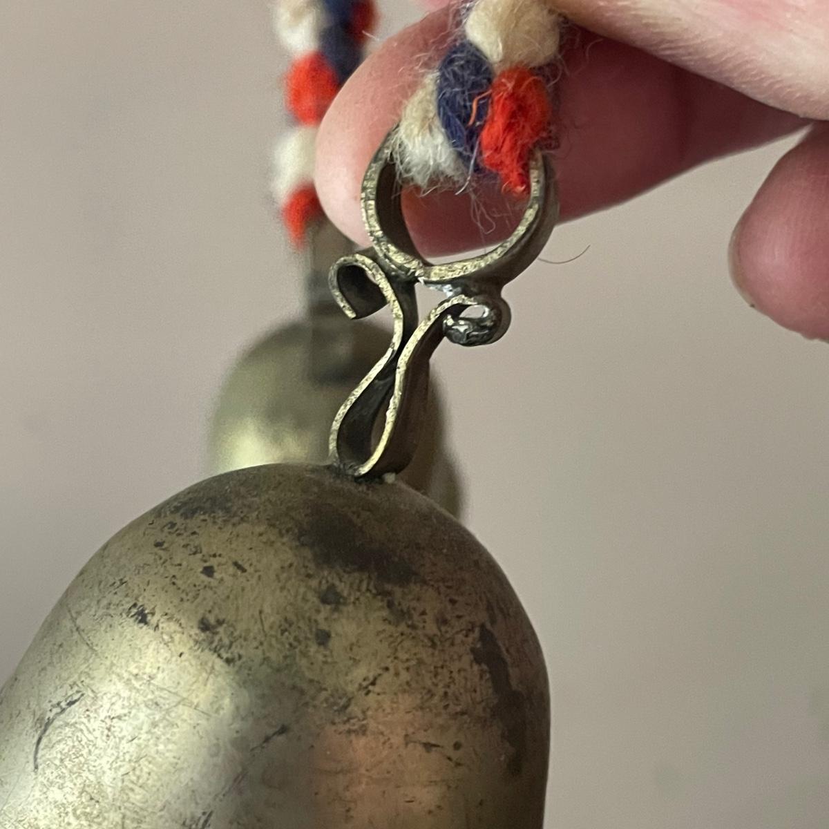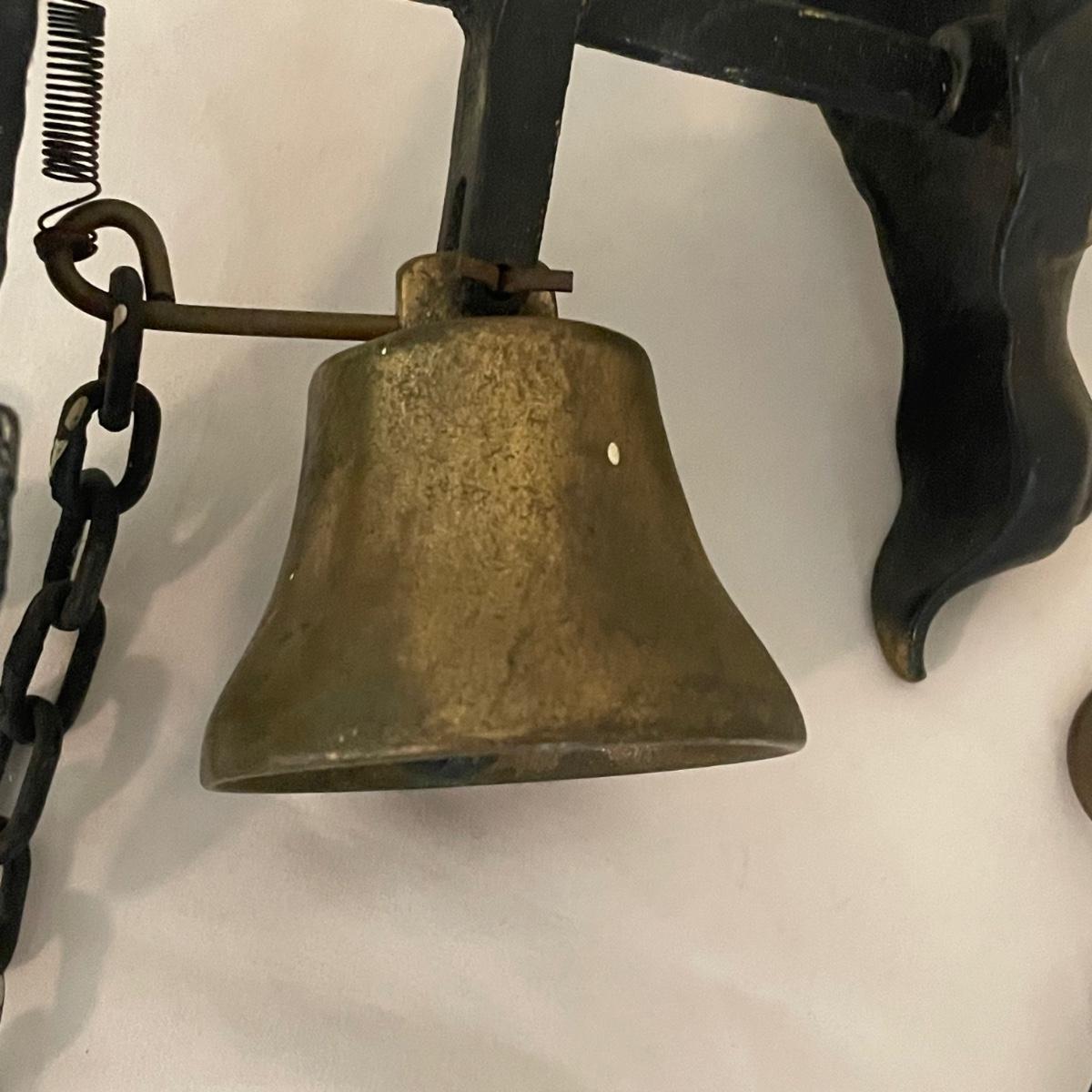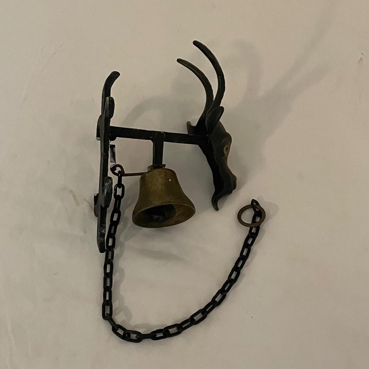 This unique brass goat is designed to hang on the wall, it appears to be a brass head and bell with the rest being steel. It measures 6” x 9” x 4”. Also included are a pair of brass bells on blue/red/white rope.