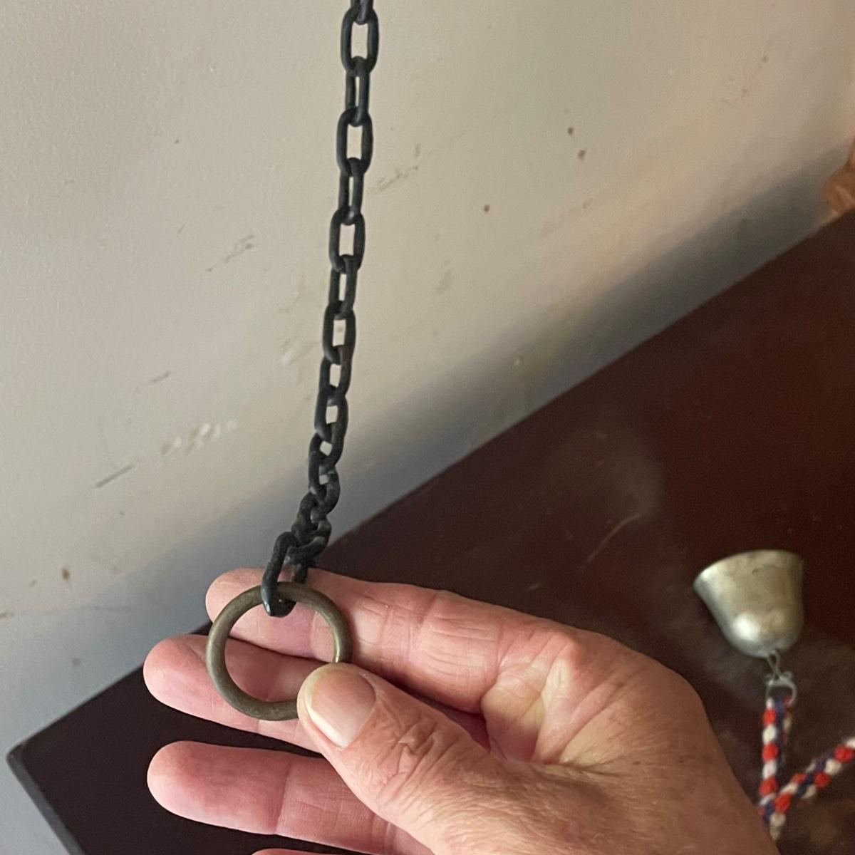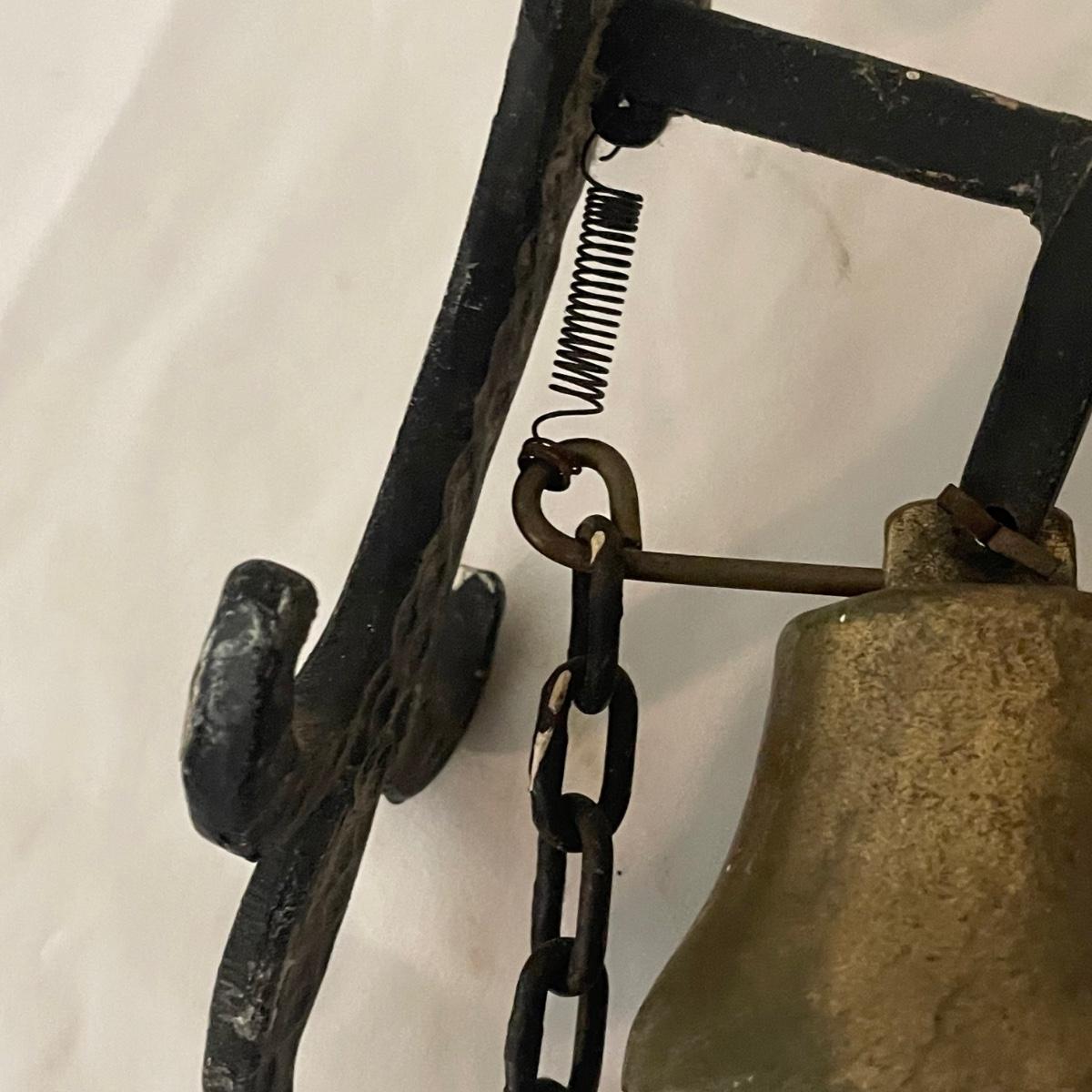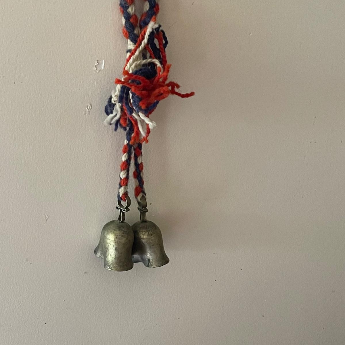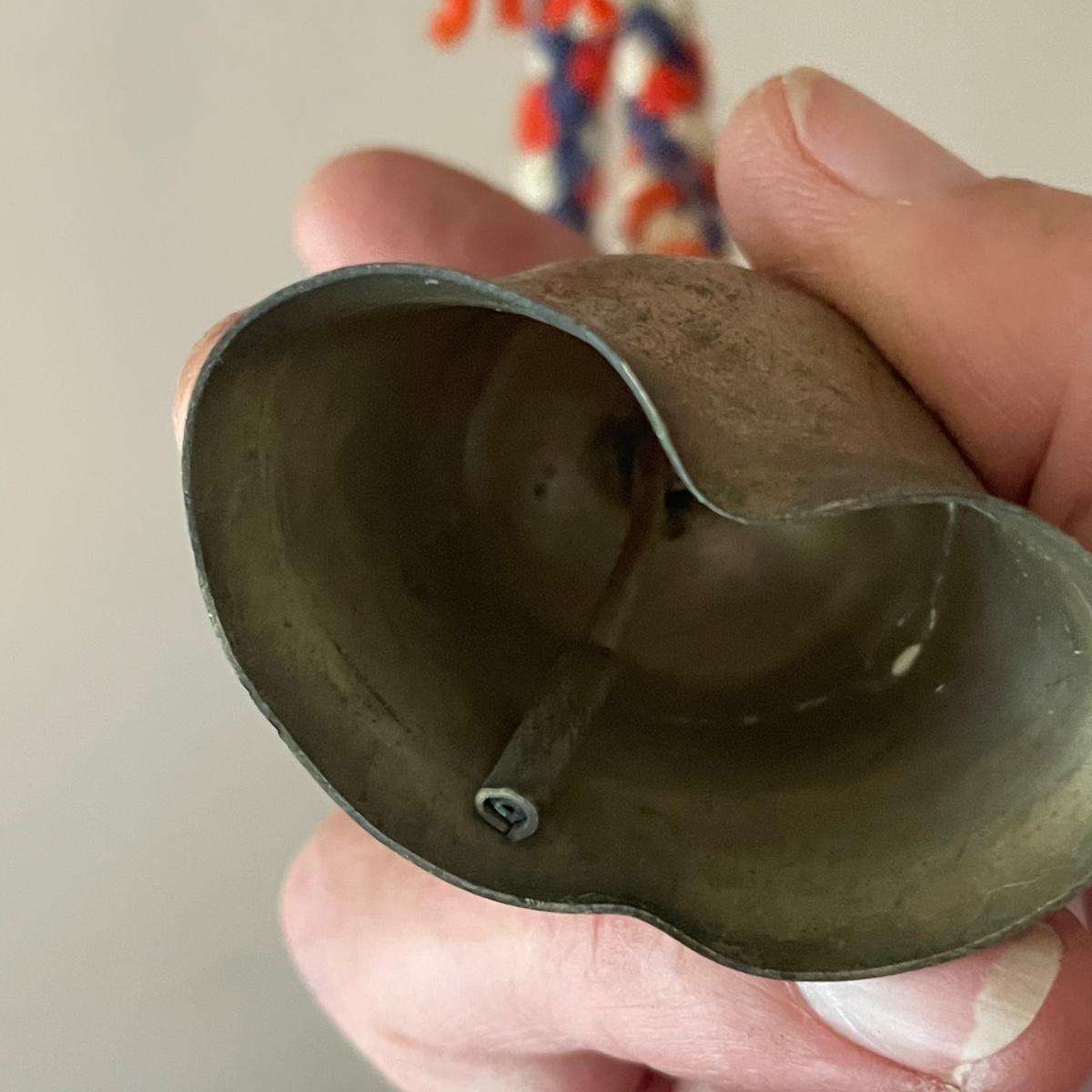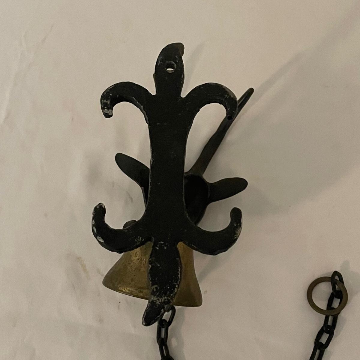 This unique brass goat is designed to hang on the wall, it appears to be a brass head and bell with the rest being steel. It measures 6” x 9” x 4”. Also included are a pair of brass bells on blue/red/white rope.