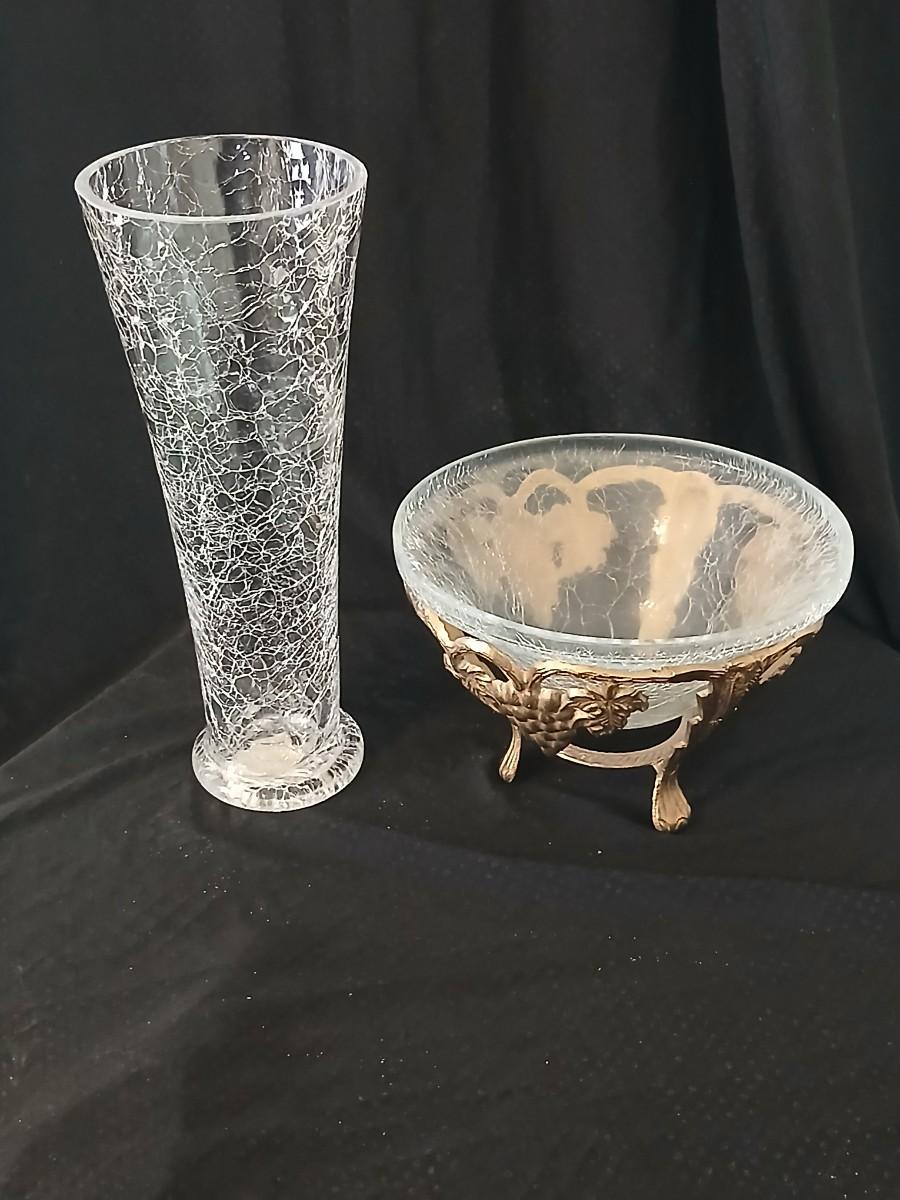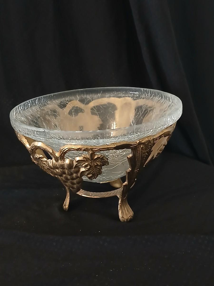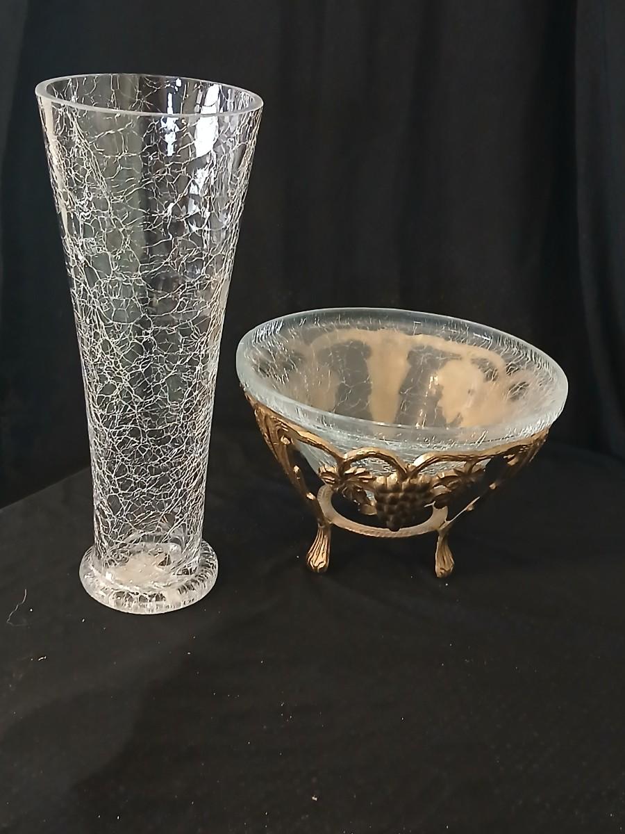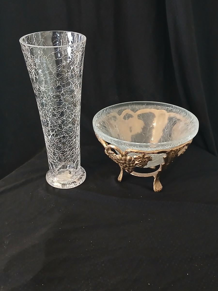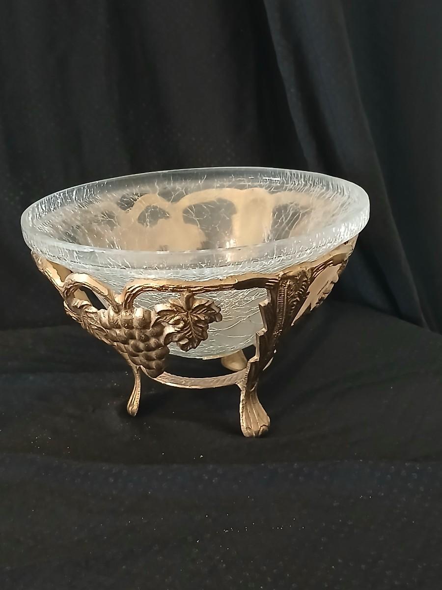 Brass grape stand with a detachable crackle glass bowl and a matching crackle glass vase.