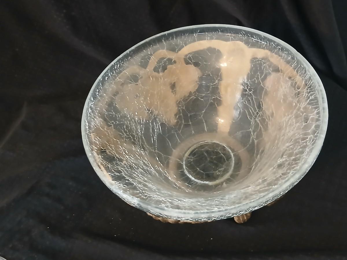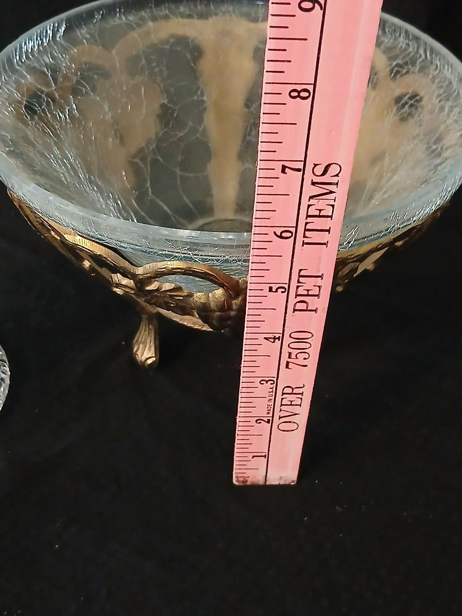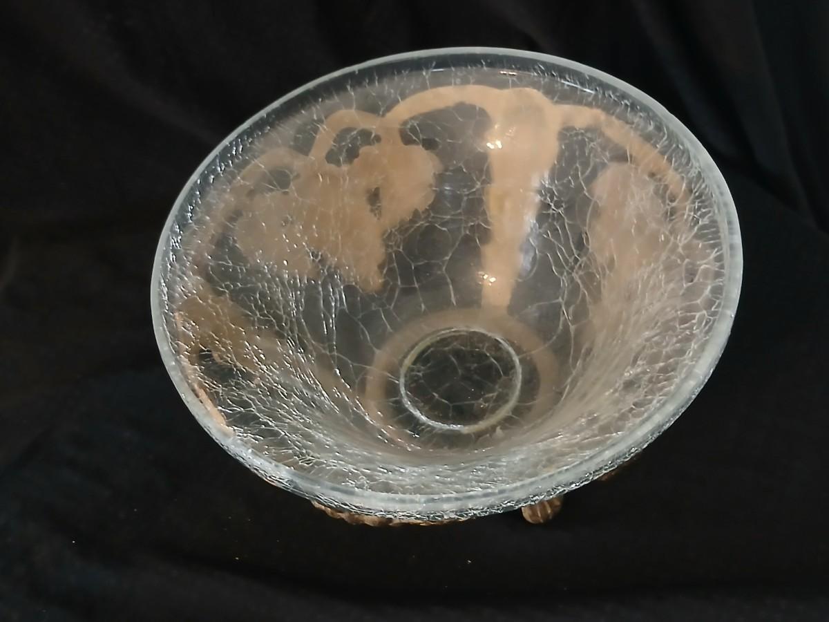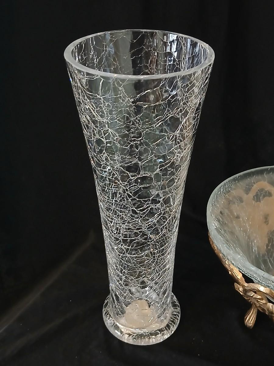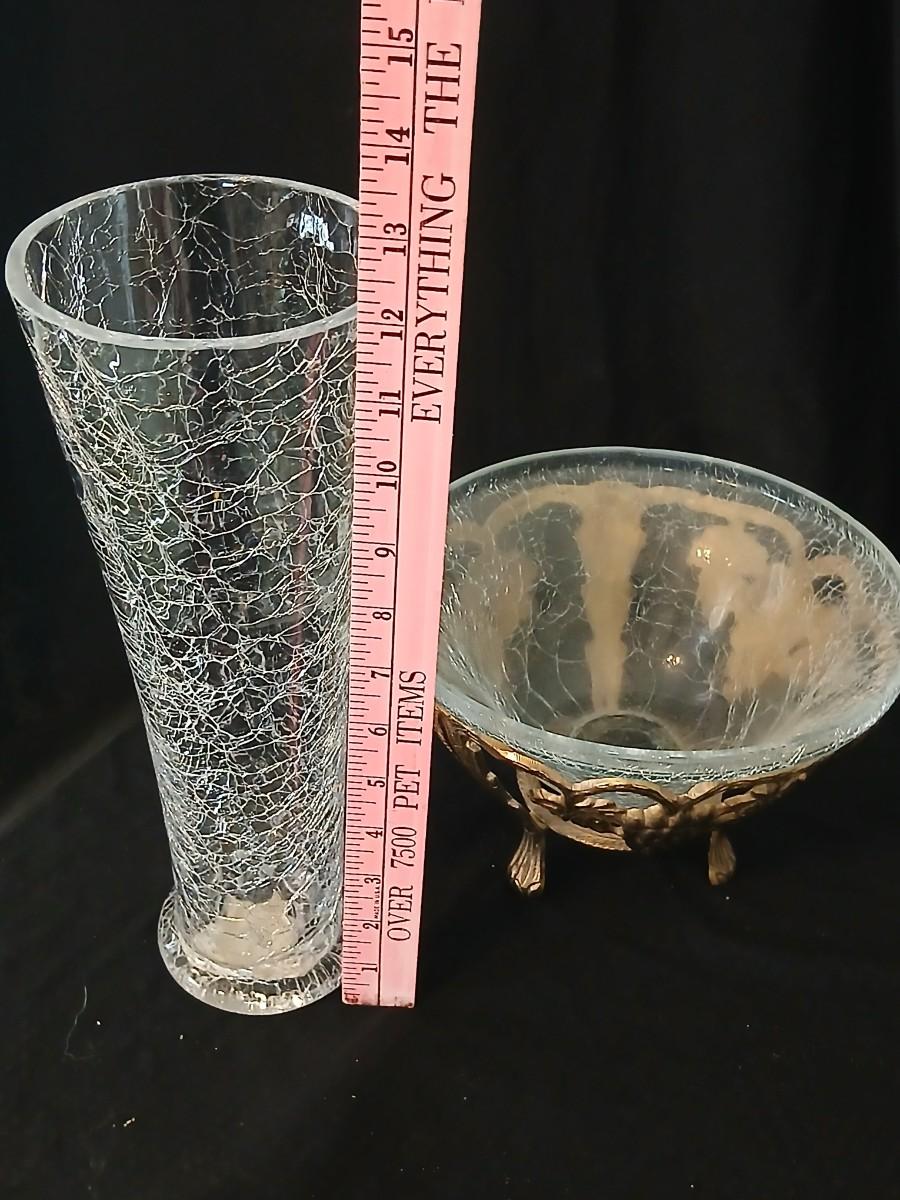 Brass grape stand with a detachable crackle glass bowl and a matching crackle glass vase.