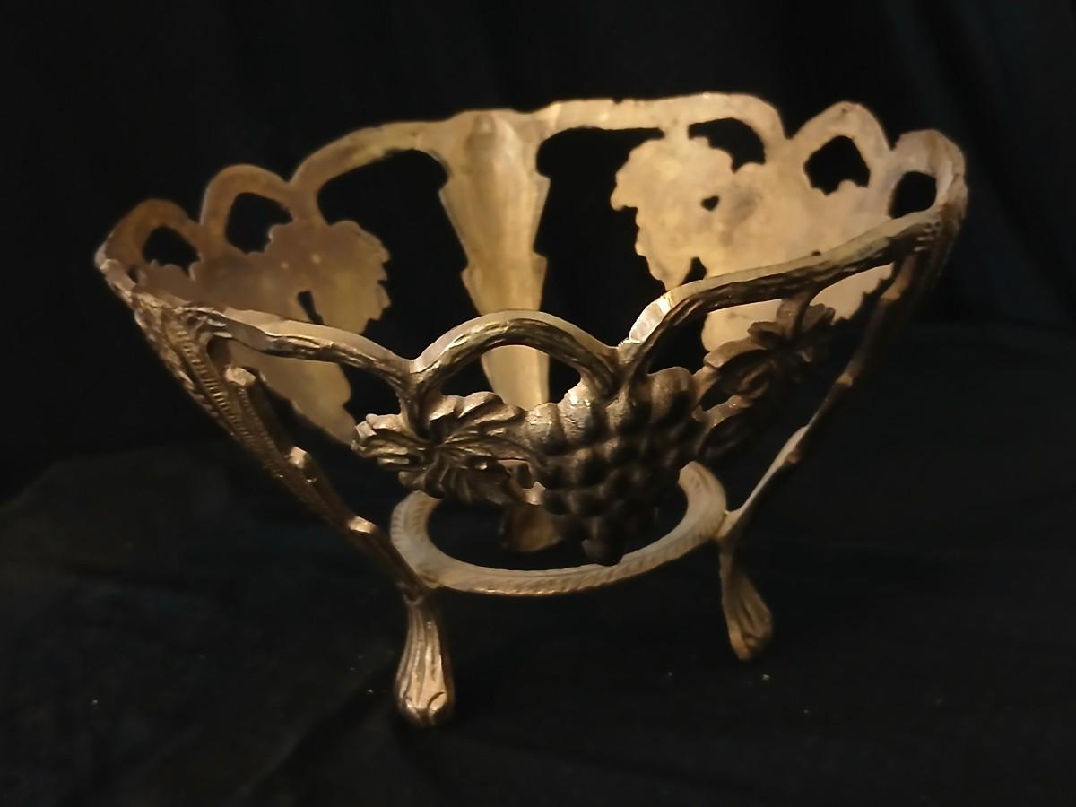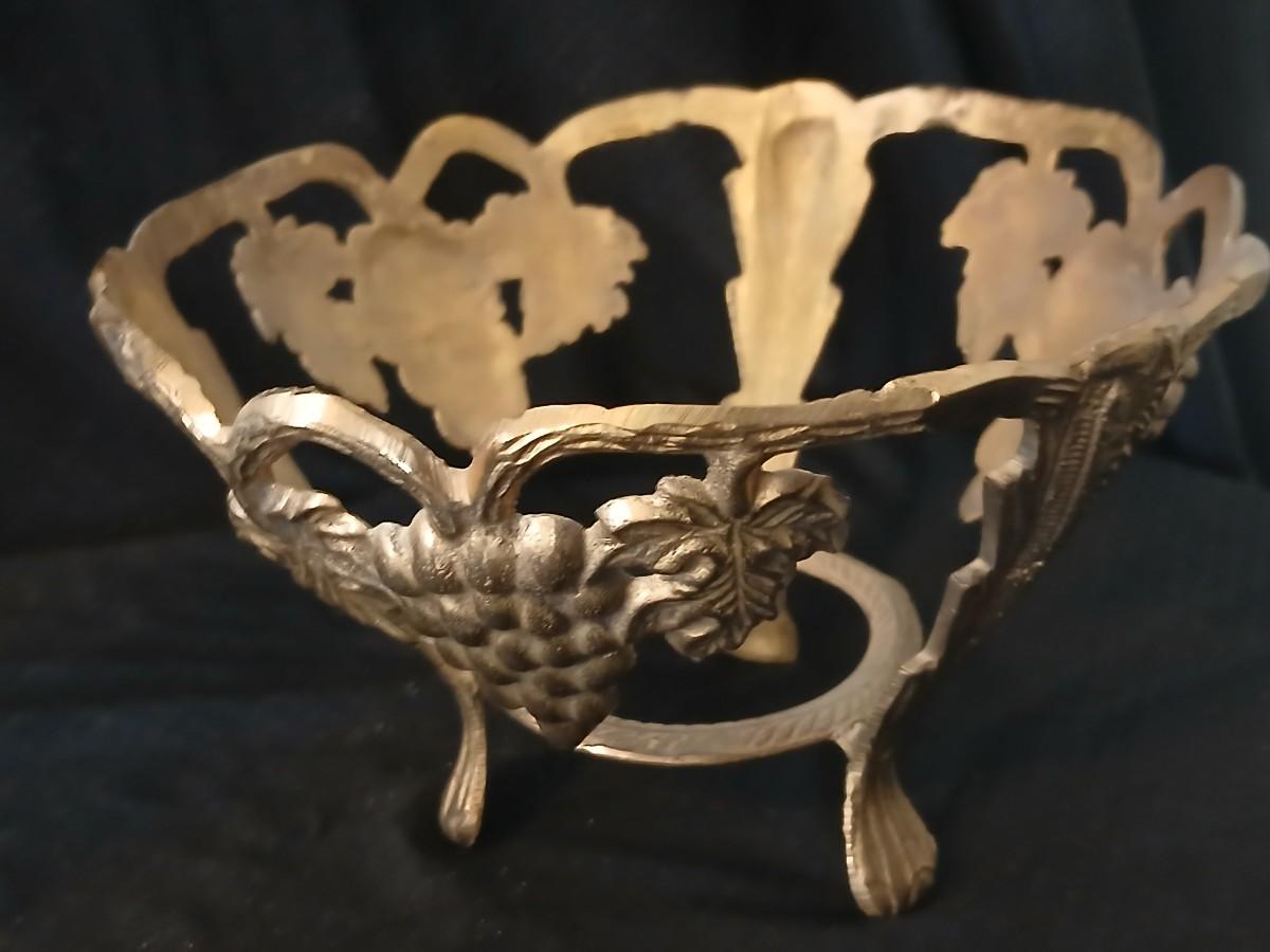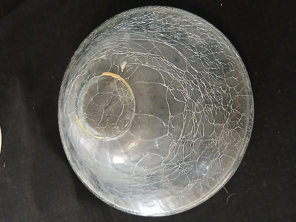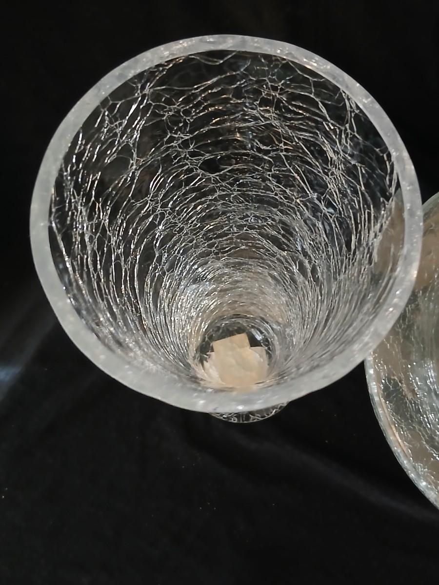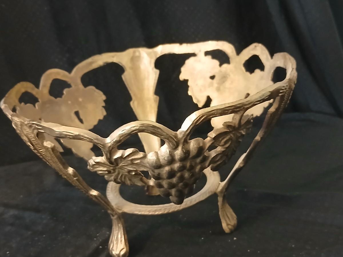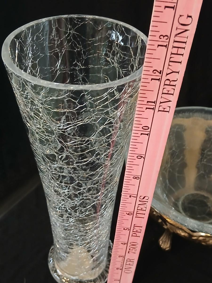 Brass grape stand with a detachable crackle glass bowl and a matching crackle glass vase.