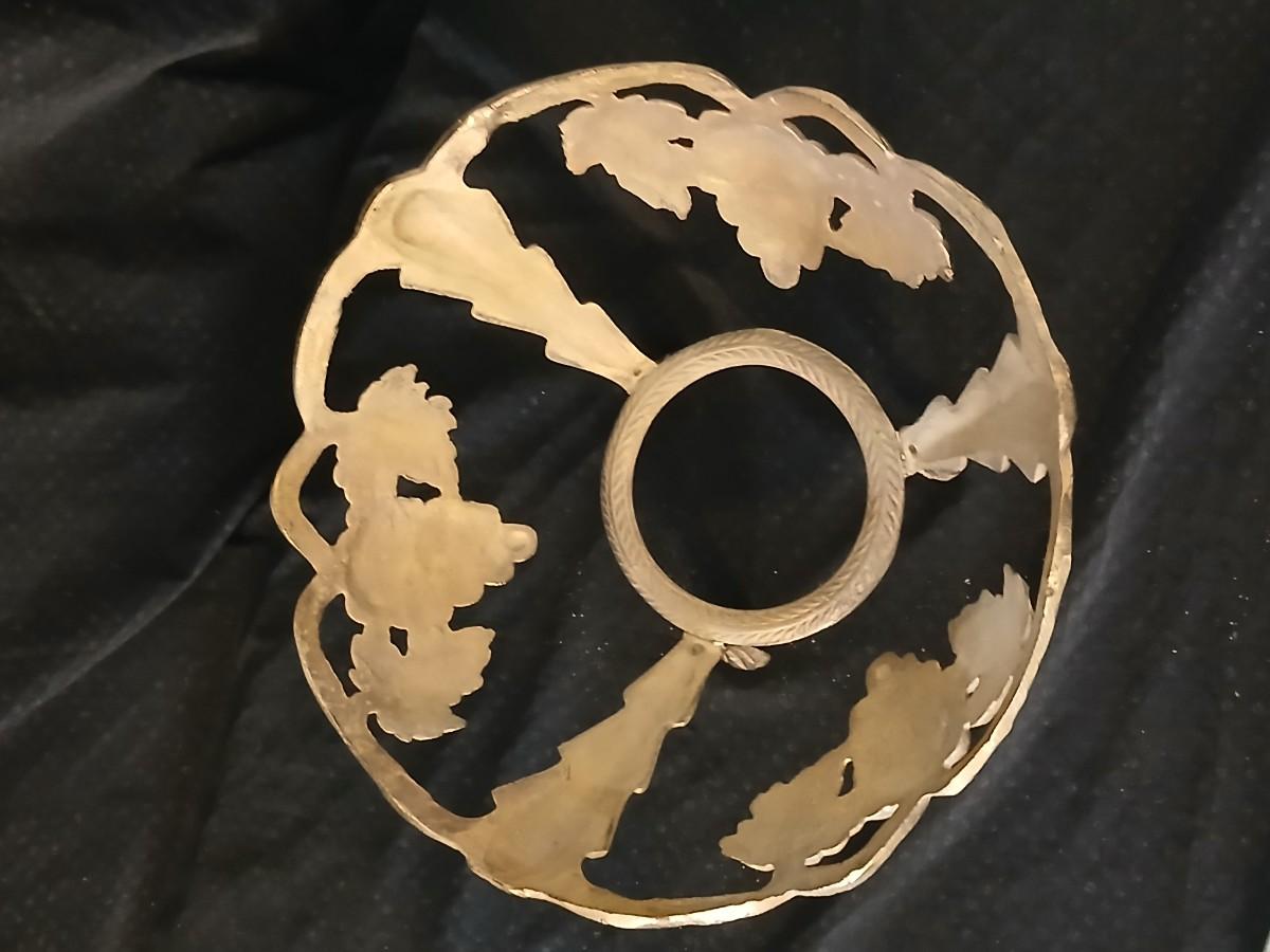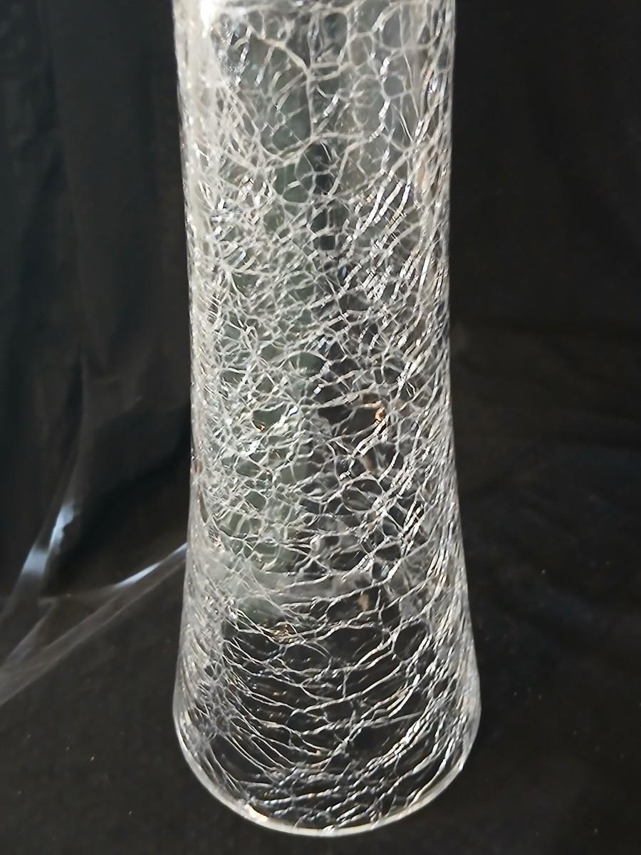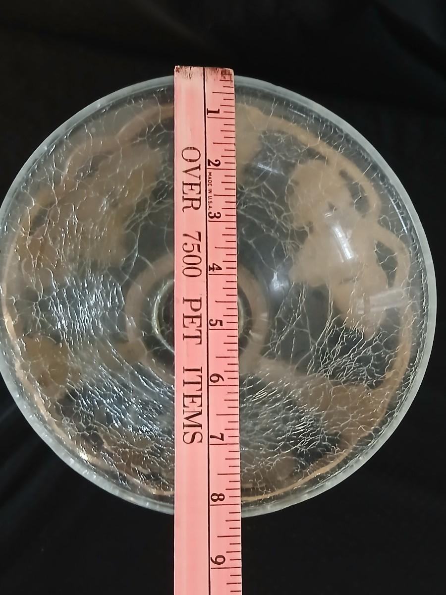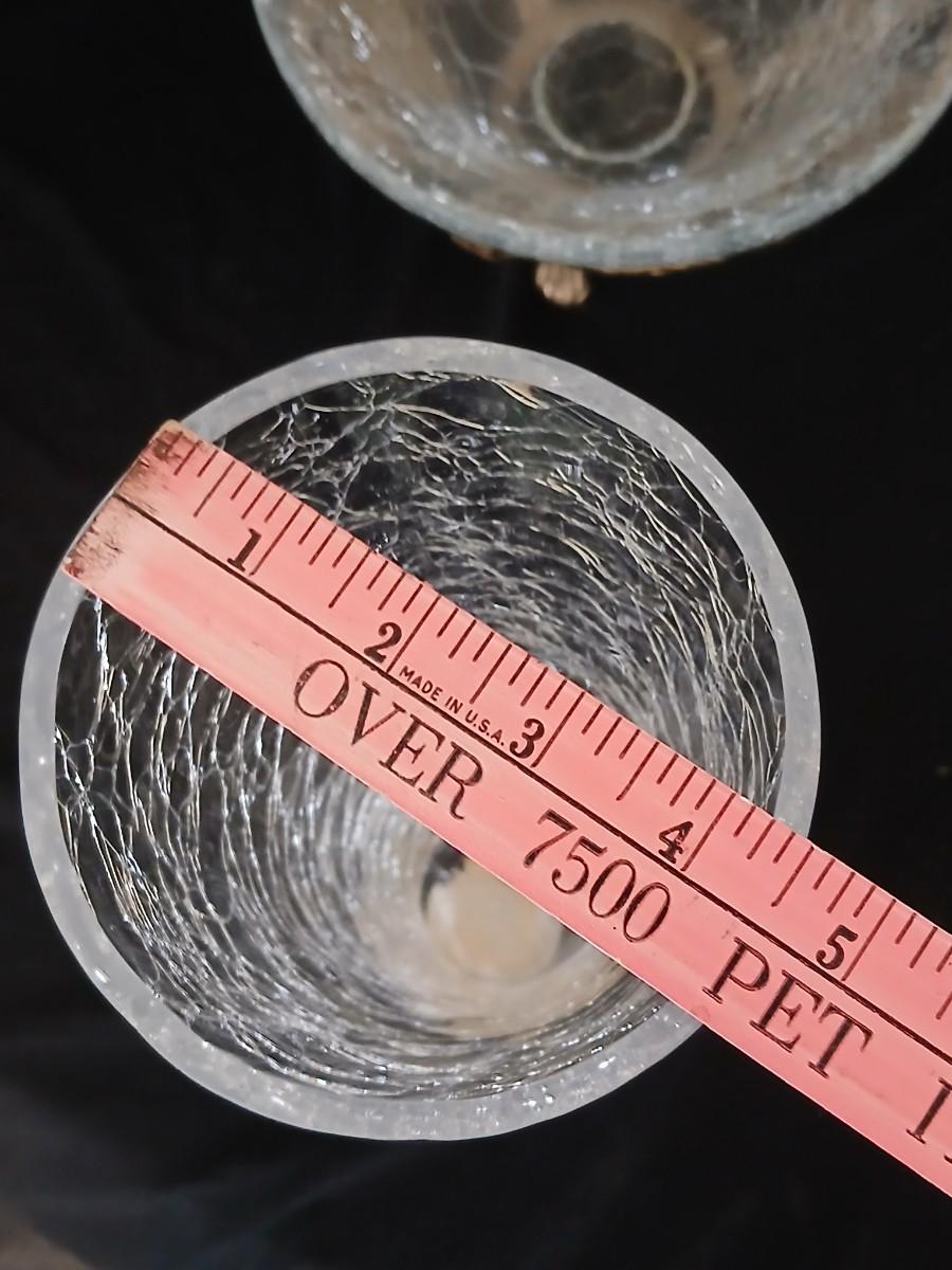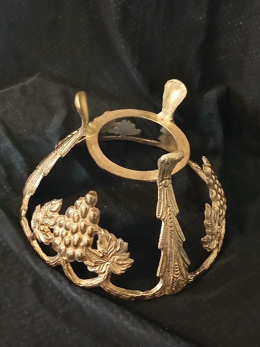 Brass grape stand with a detachable crackle glass bowl and a matching crackle glass vase.