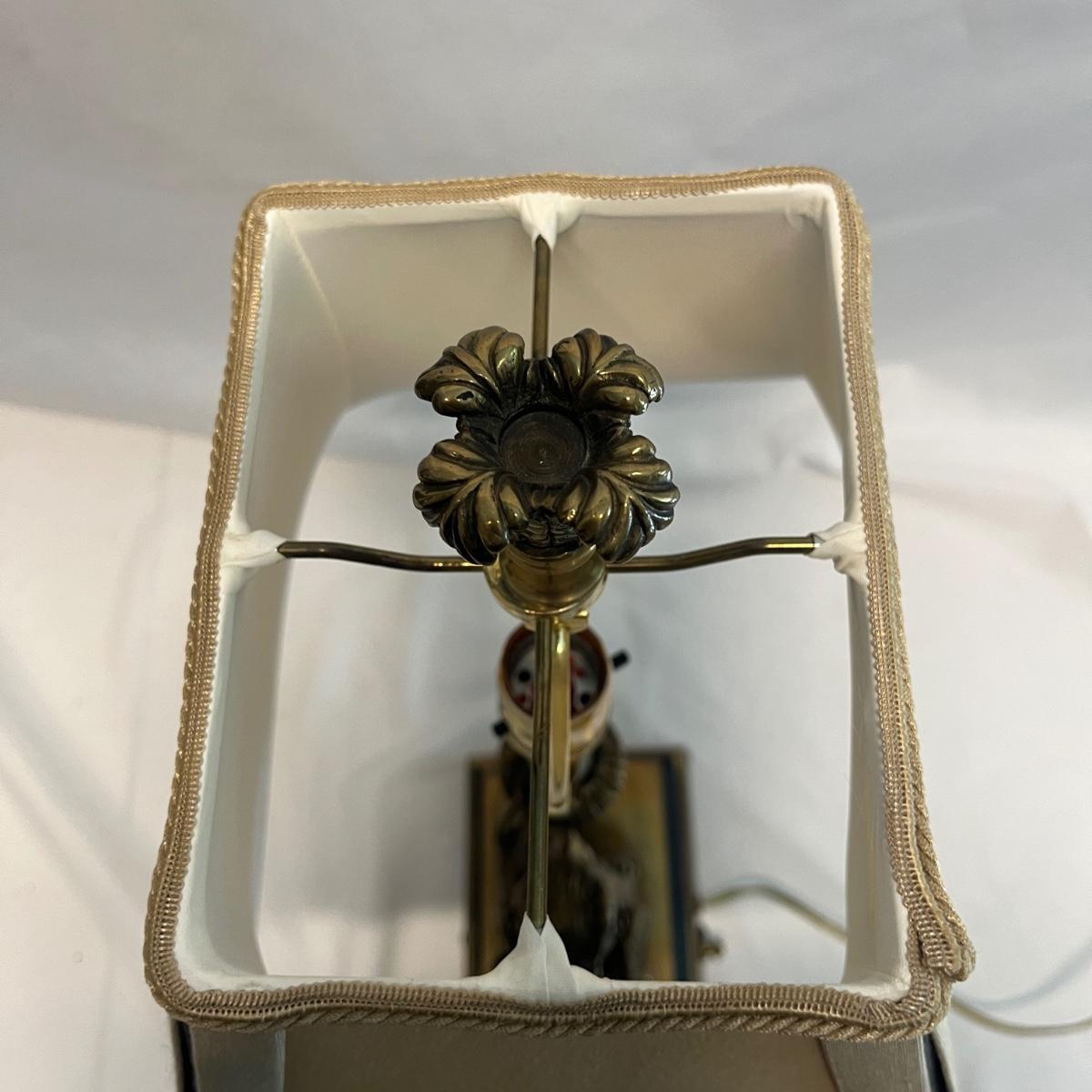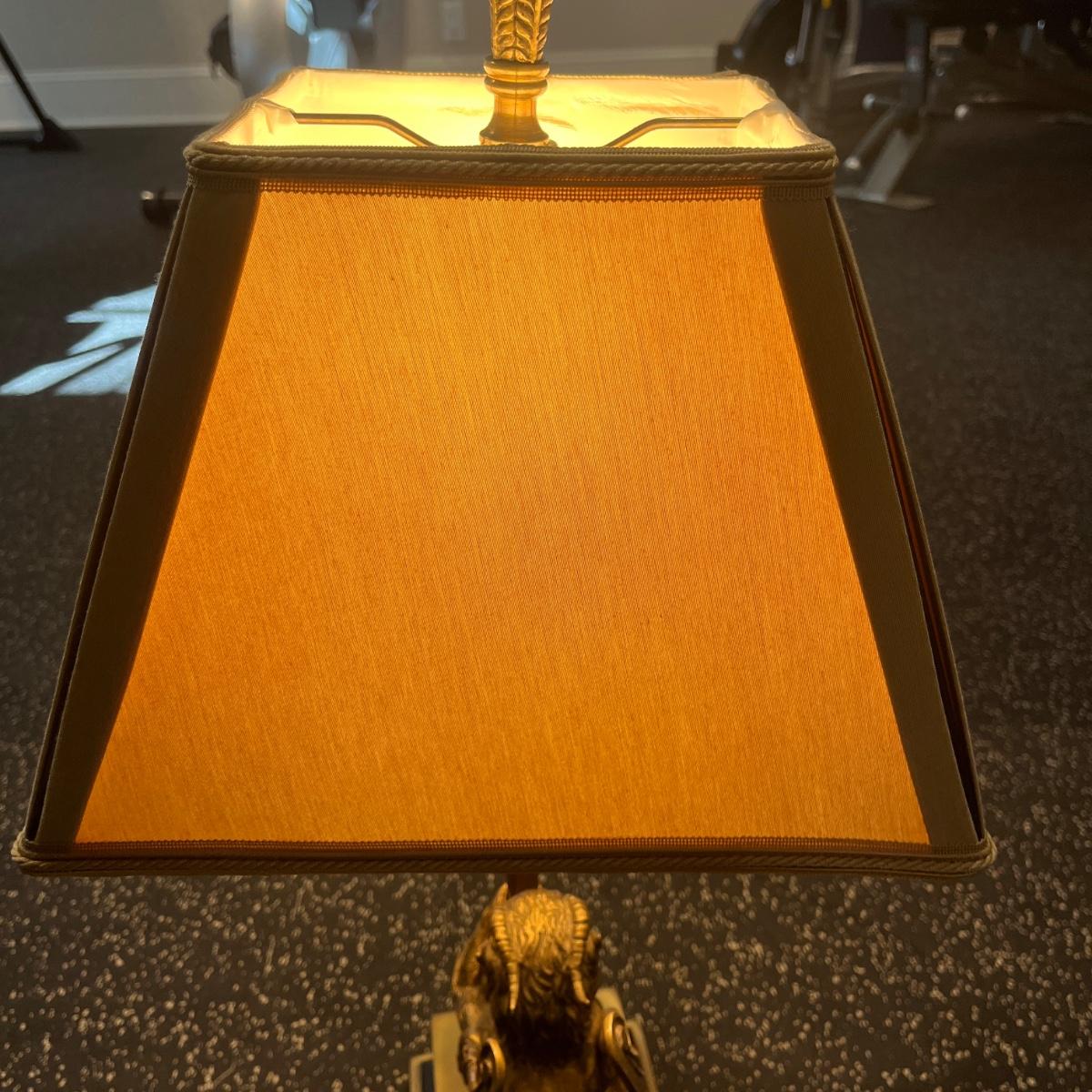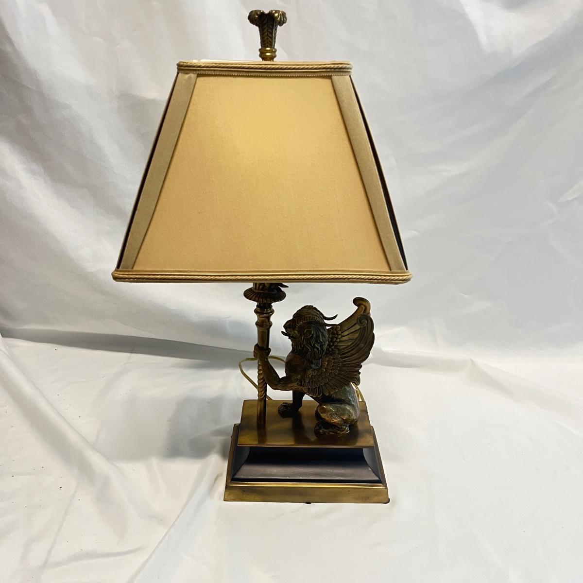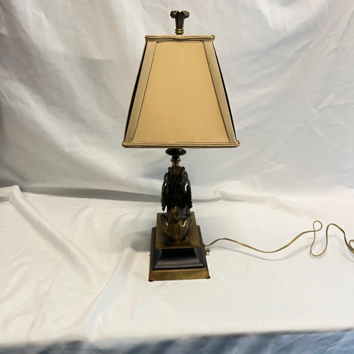 This solid brass Griffin table lamp has an on off switch and powered on when plugged in. Shade is a dark ivory color. Lamp measures 5” x 8” x 24”H.