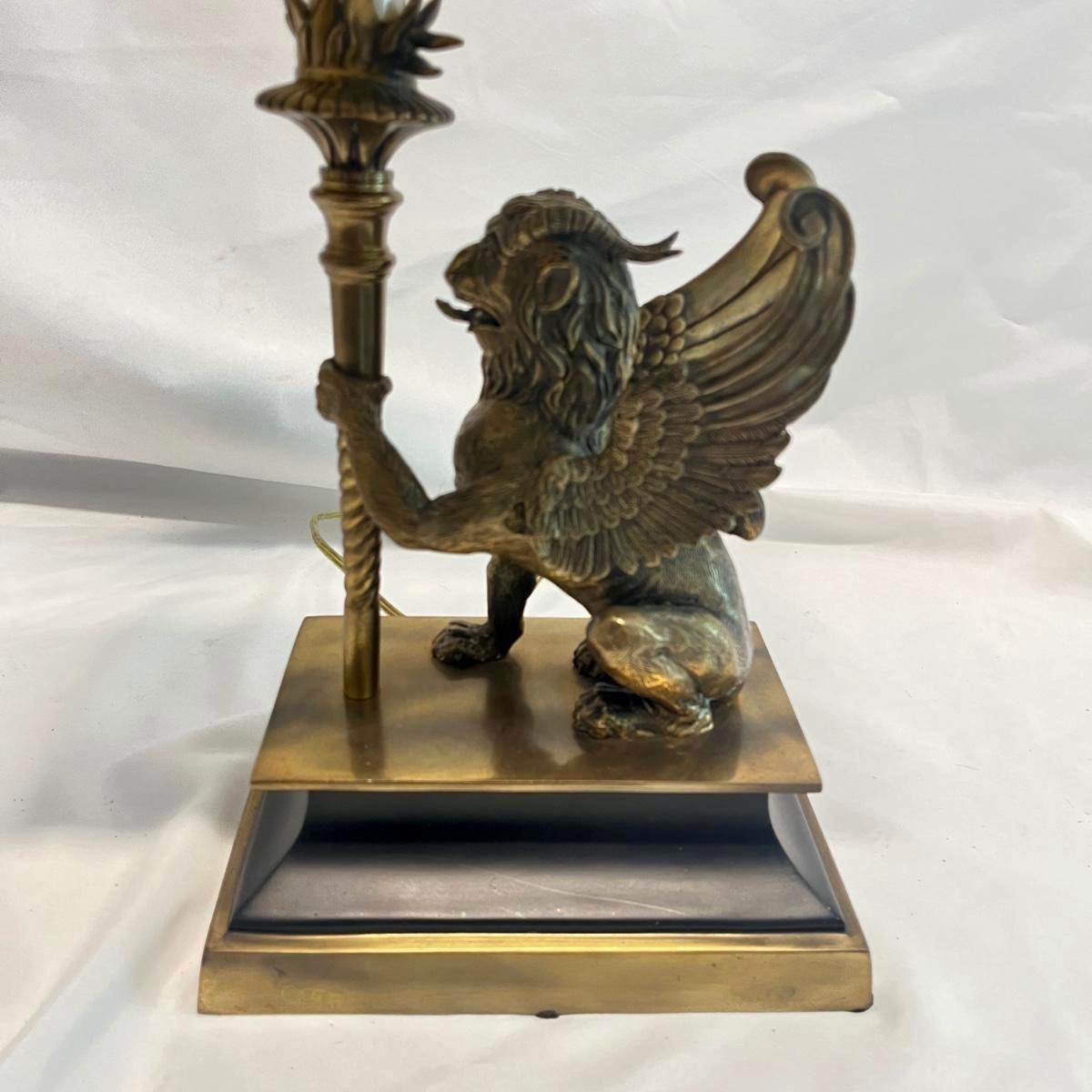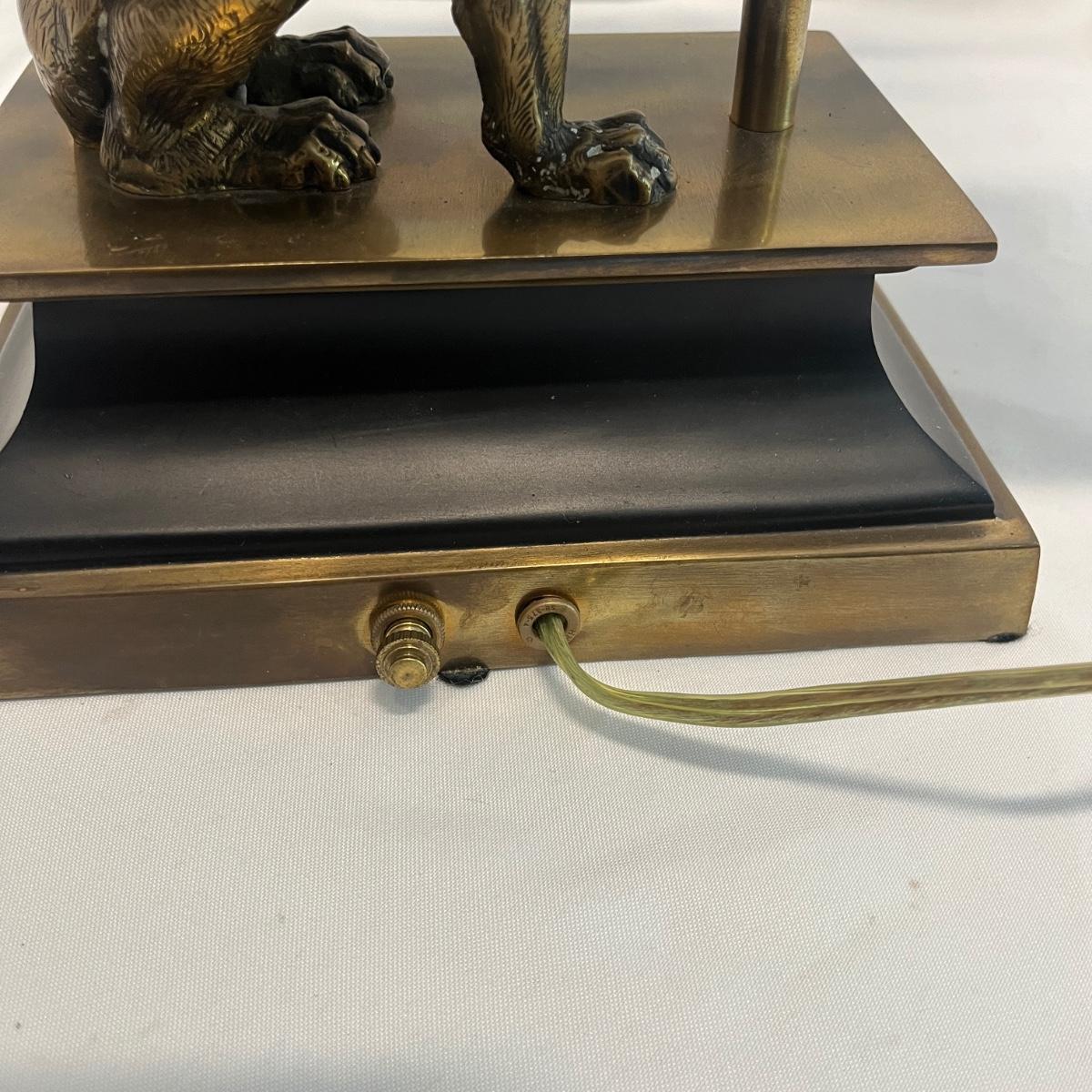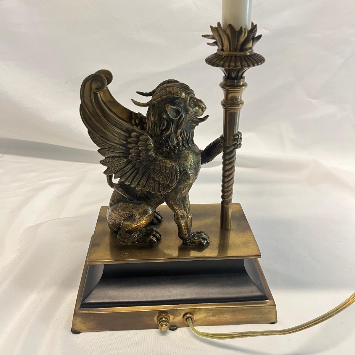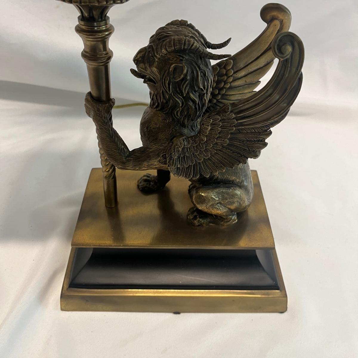 This solid brass Griffin table lamp has an on off switch and powered on when plugged in. Shade is a dark ivory color. Lamp measures 5” x 8” x 24”H.