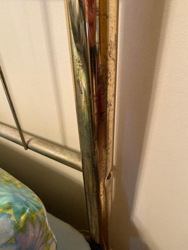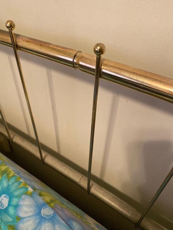 Brass/metal headboard. Believe it is for a full size bed. Needs some cleaning, Has signs of age. Might be brass colored painted metal. Comes apart in center.