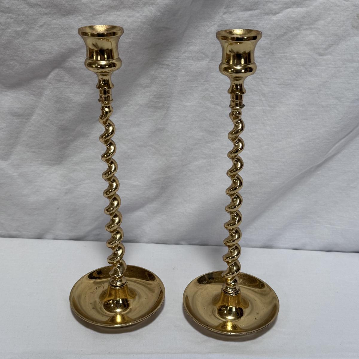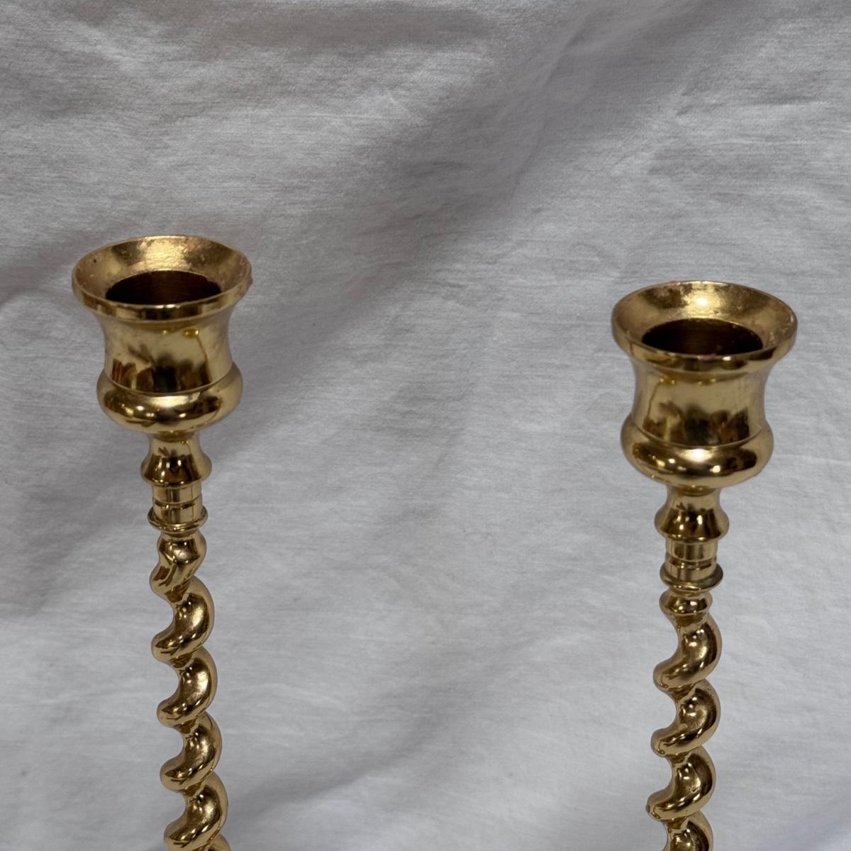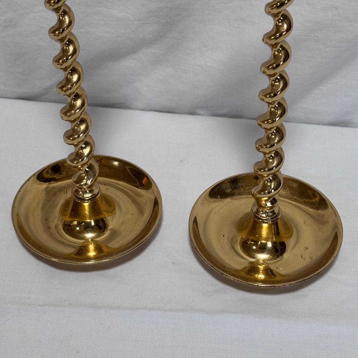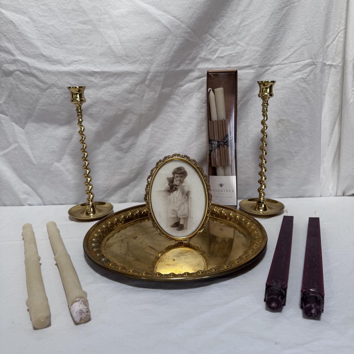 This lot includes two brass twisted candlesticks, one brass serving tray, one brass picture frame, and six variously colored tapered candles. See pictures for details. The dish measures 12”D x 1”H. Shipping available.