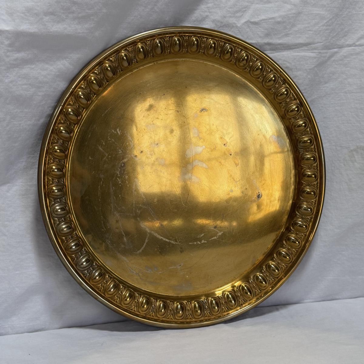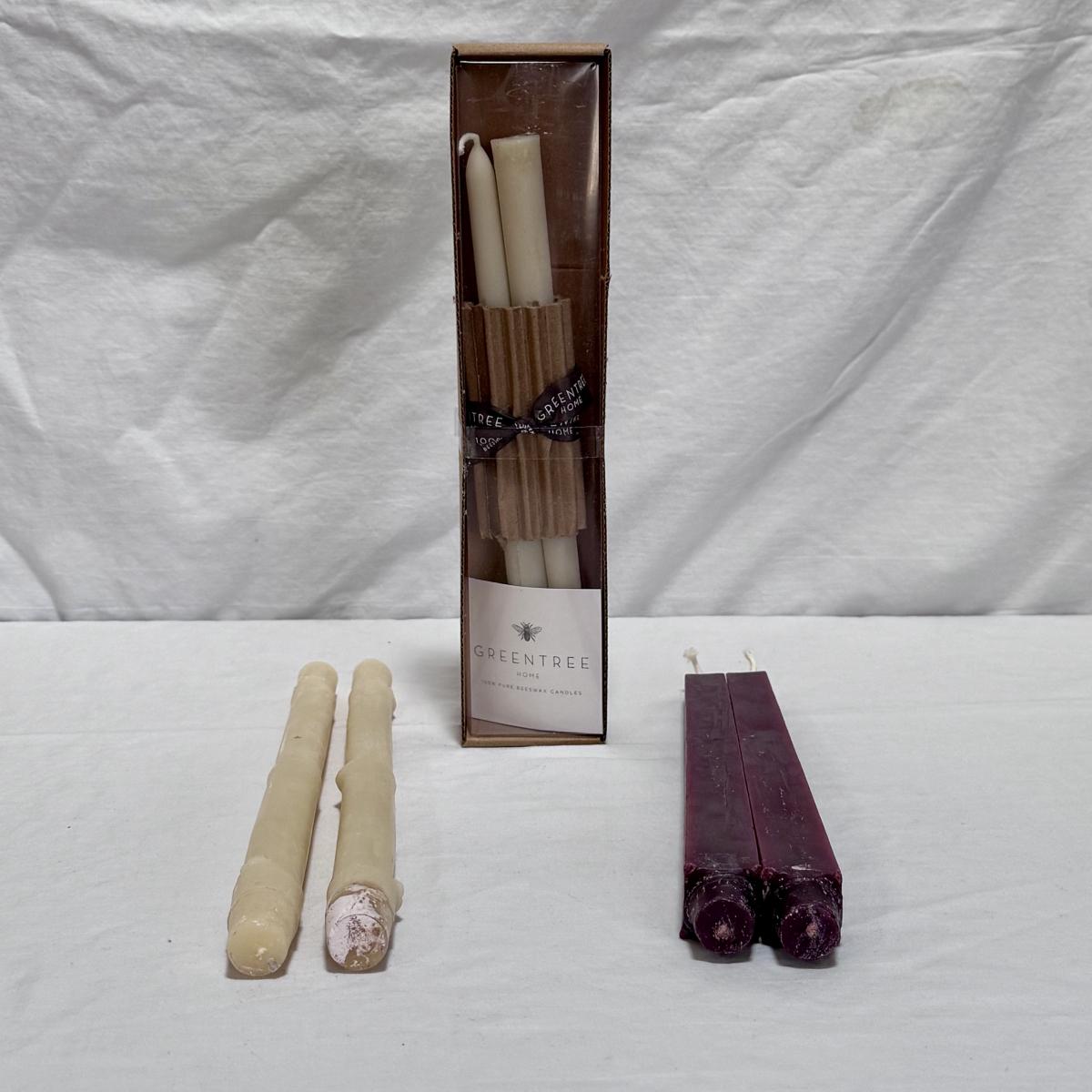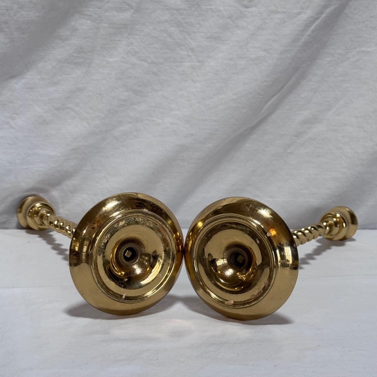 This lot includes two brass twisted candlesticks, one brass serving tray, one brass picture frame, and six variously colored tapered candles. See pictures for details. The dish measures 12”D x 1”H. Shipping available.