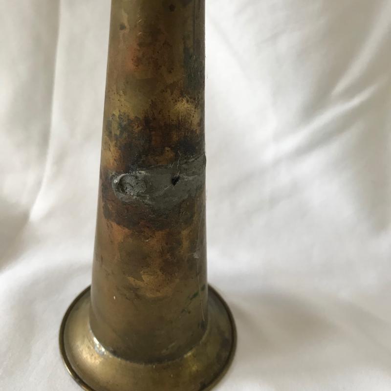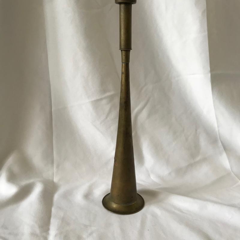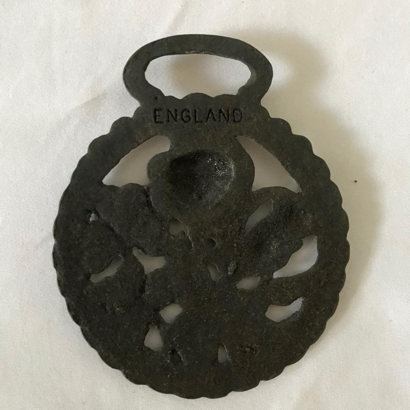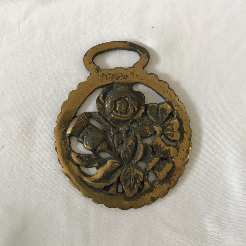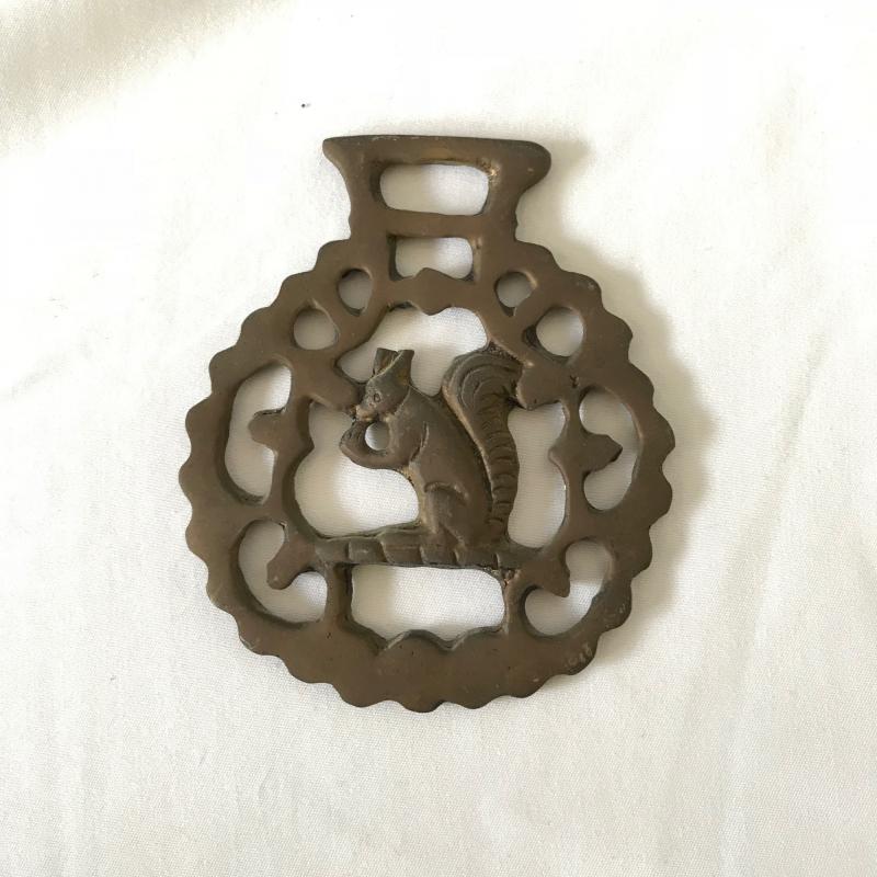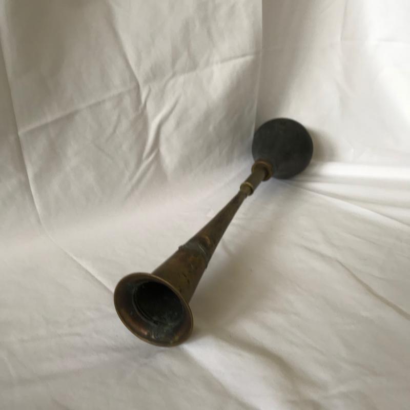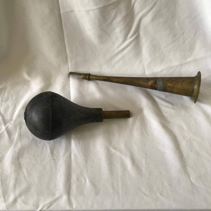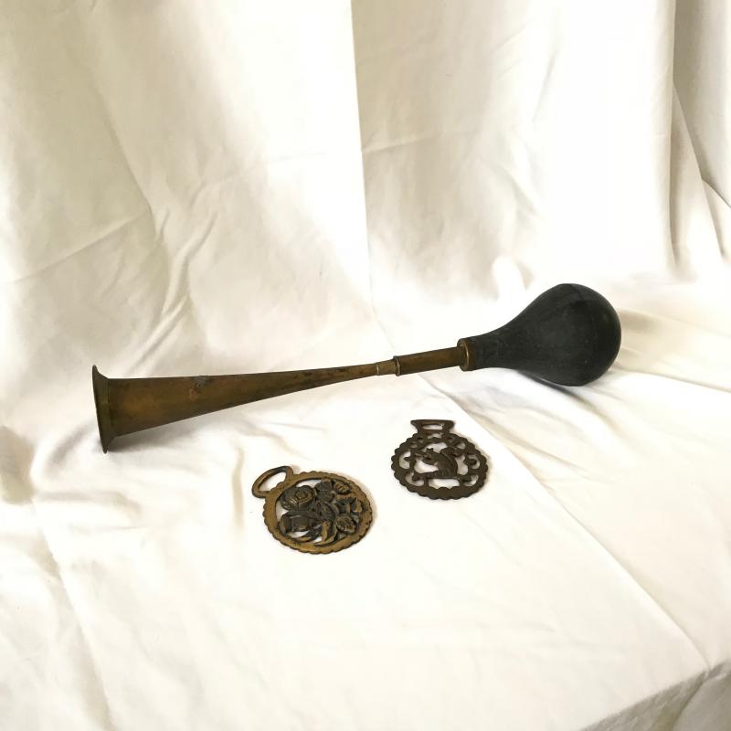 Lot contains antique brass horn with rubber ball (approx. 18” tall), and two metal pieces, one floral and one with a squirrel. Each is approx. 4” x 3”. Shipping available or local pickup in Hendersonville, NC.