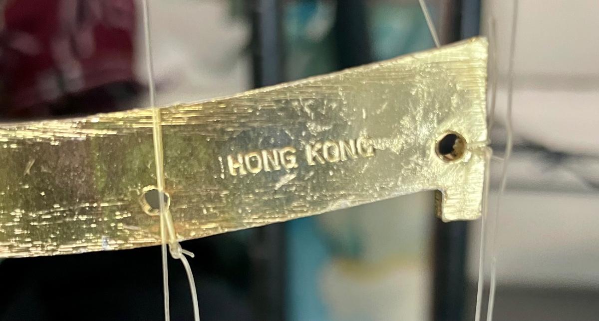 7 brass horses suspended from a brass horseshoe. Made in Hong Kong. In good condition