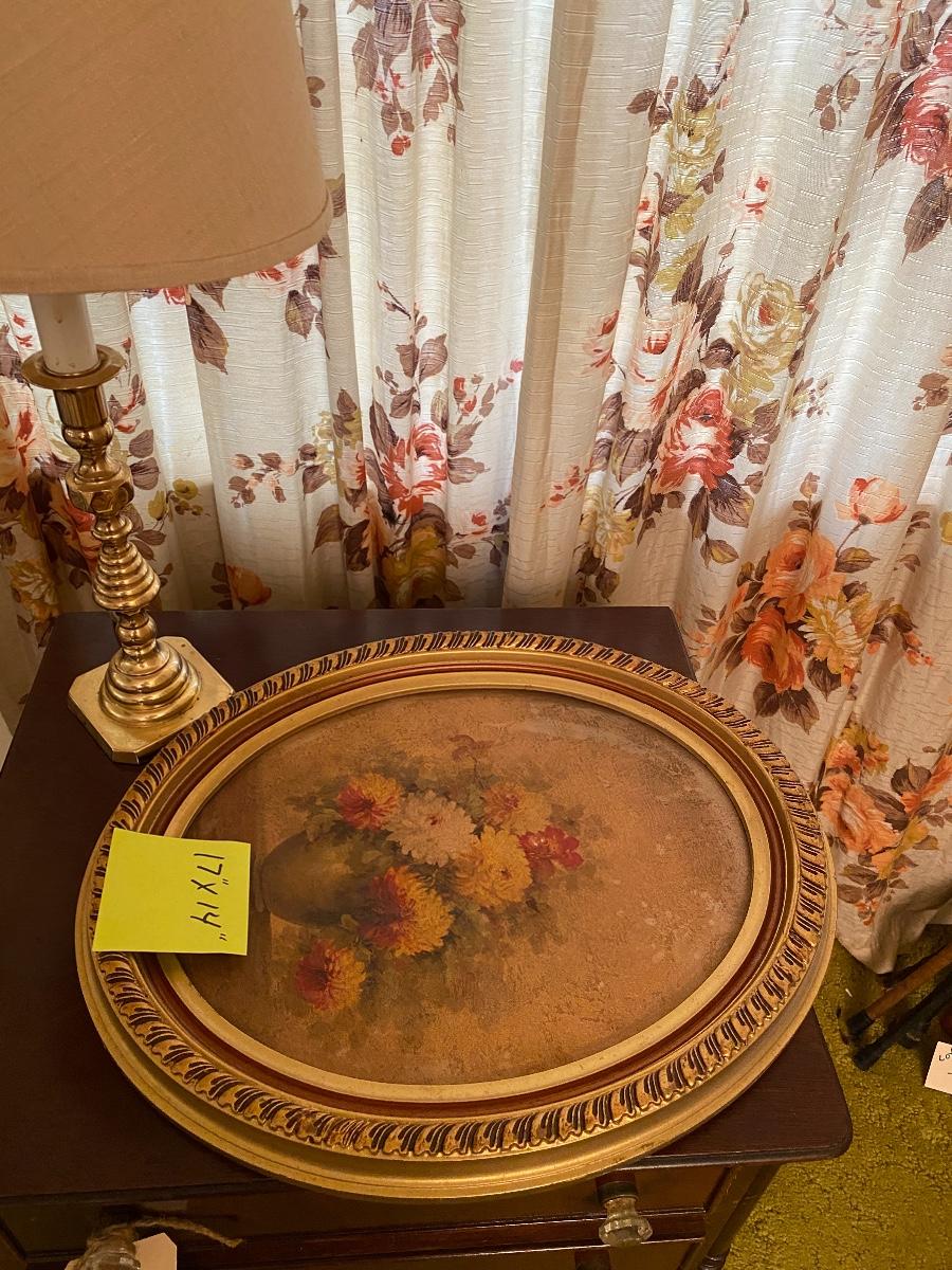 Brass Lamp and Oval Picture Lot