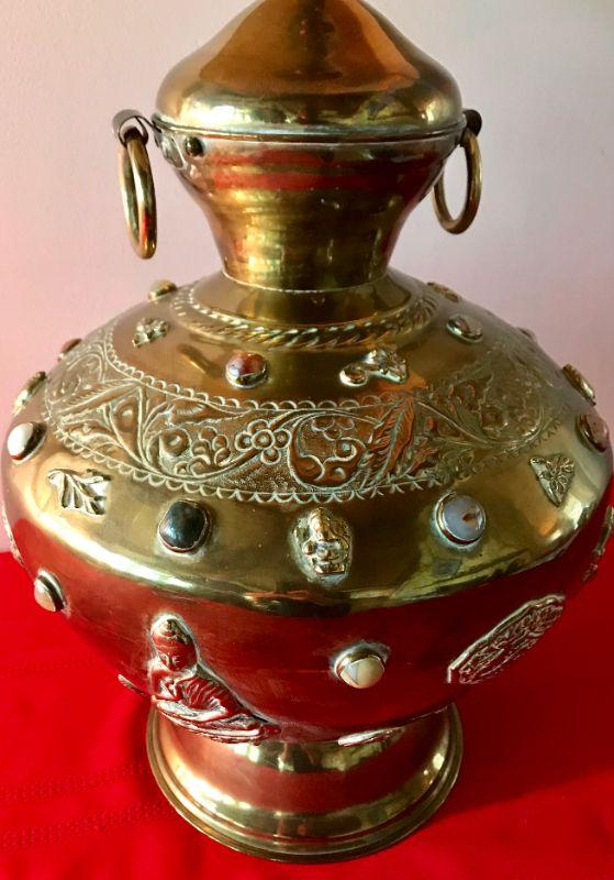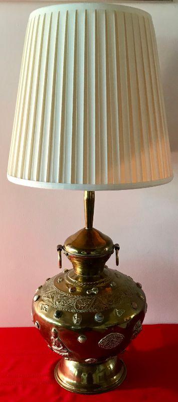 Brass Lamp From Singapore With Inlaid Stones And Buddha Figures