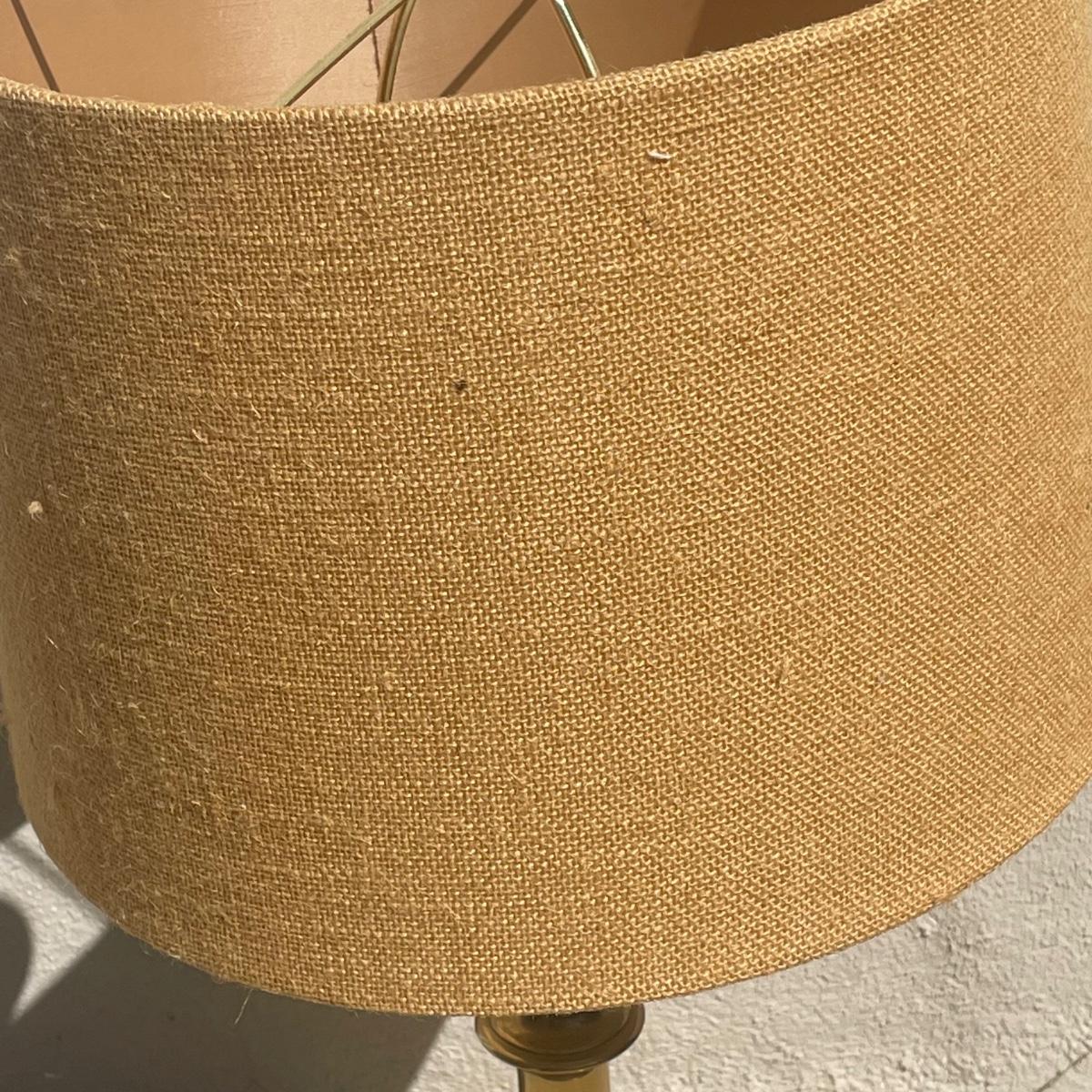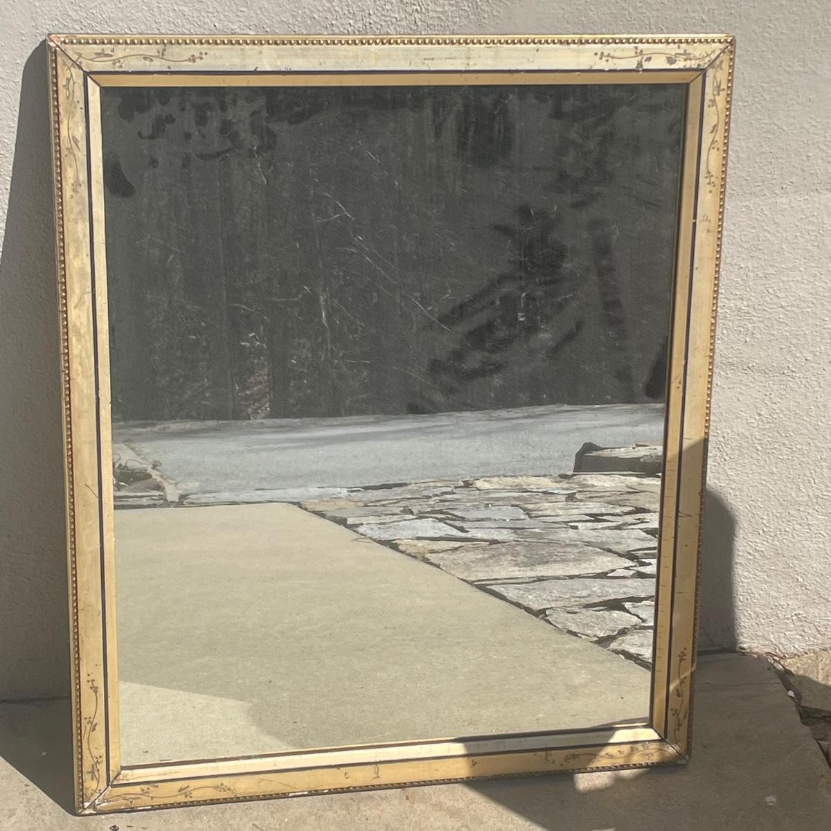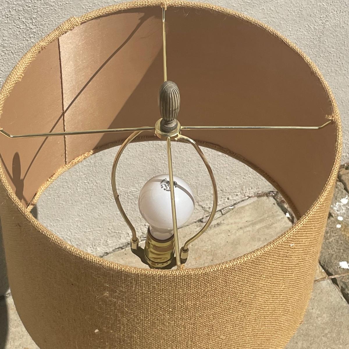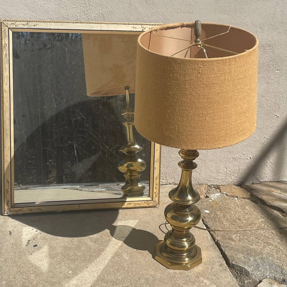 This attractive Vintage wood mirror measures 22” x 26” and is accompanied by a brass mirror with a retro tan woven lamp shade.