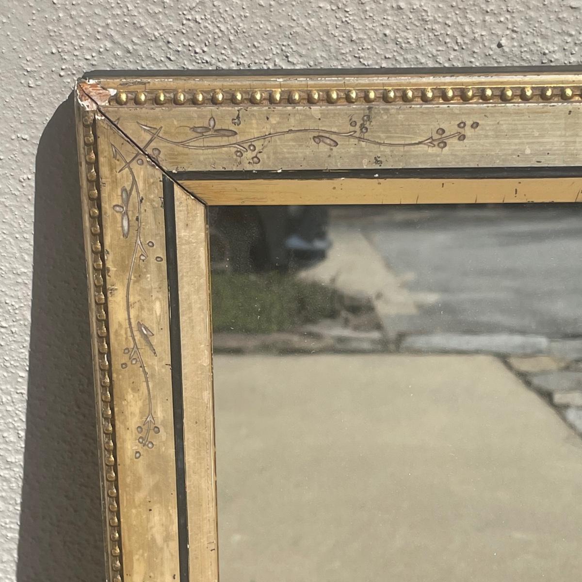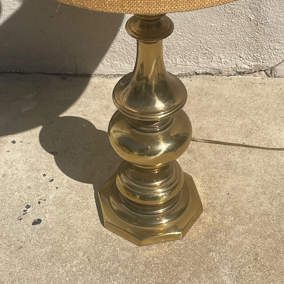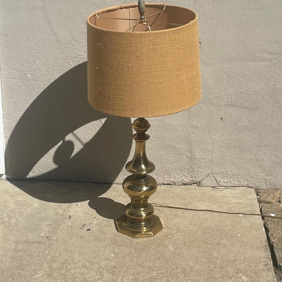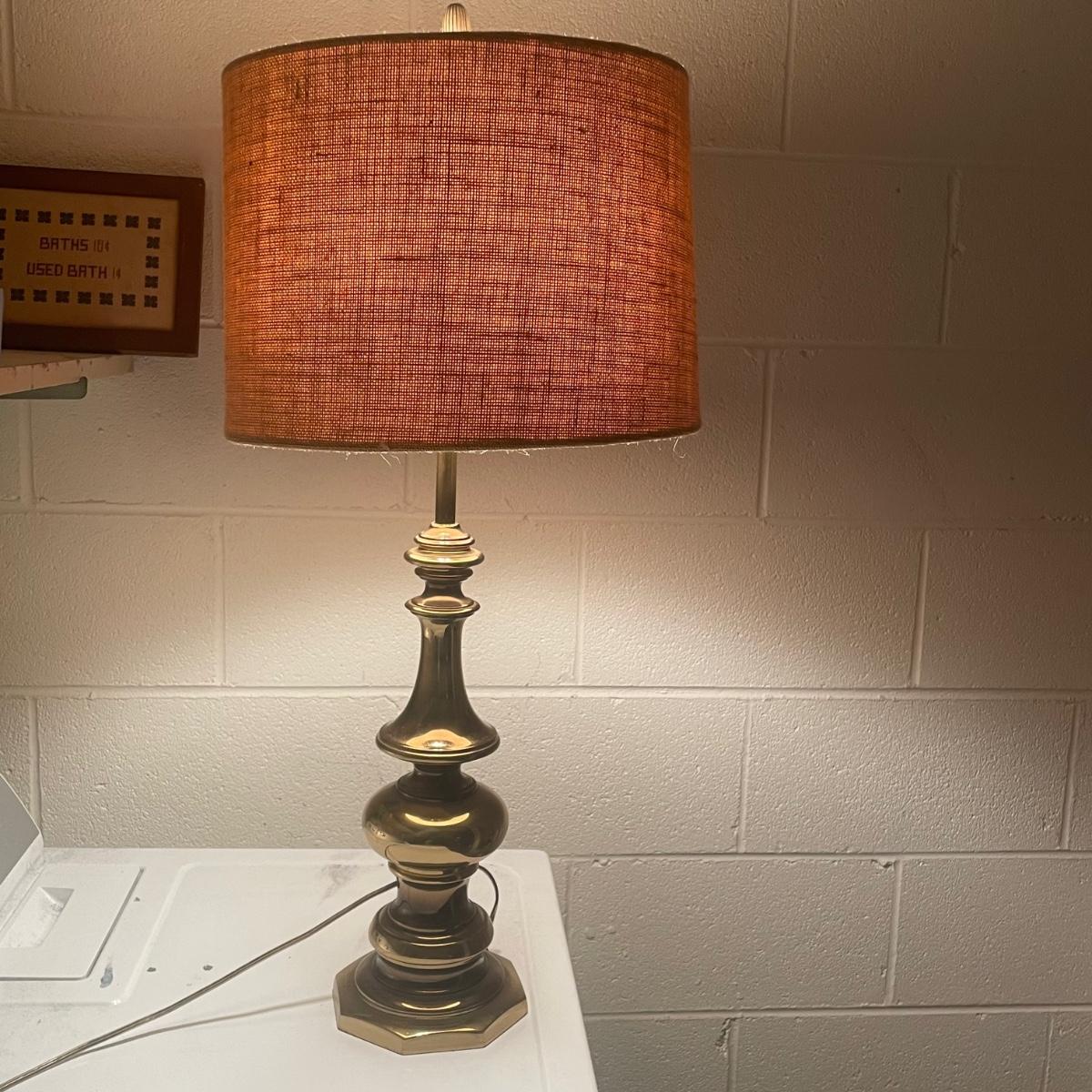This attractive Vintage wood mirror measures 22” x 26” and is accompanied by a brass mirror with a retro tan woven lamp shade.